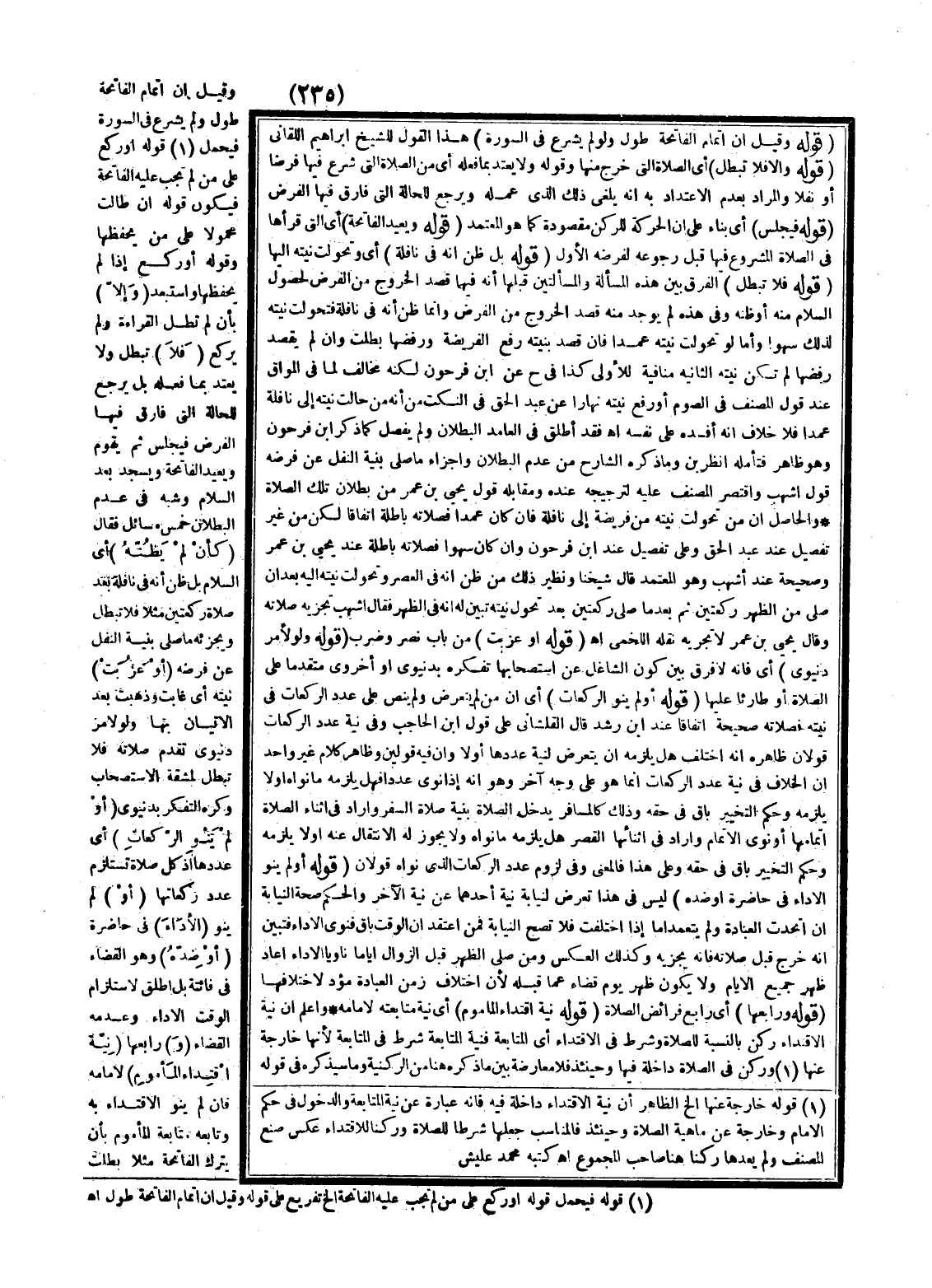ـــــــــــــــــــــــــــــQقَوْلُهُ: وَقِيلَ إنَّ تَمَامَ الْفَاتِحَةِ طُولٌ وَلَوْ لَمْ يَشْرَعْ فِي السُّورَةِ) هَذَا الْقَوْلُ لِلشَّيْخِ إبْرَاهِيمَ اللَّقَانِيِّ (قَوْلُهُ: وَإِلَّا فَلَا تَبْطُلْ) أَيْ الصَّلَاةُ الَّتِي خَرَجَ مِنْهَا وَقَوْلُهُ: وَلَا يَعْتَدُّ بِمَا فَعَلَهُ أَيْ مِنْ الصَّلَاةِ الَّتِي شَرَعَ فِيهَا فَرْضًا أَوْ نَفْلًا وَالْمُرَادُ بِعَدَمِ الِاعْتِدَادِ بِهِ أَنَّهُ يُلْغَى ذَلِكَ الَّذِي عَمِلَهُ وَيَرْجِعُ لِلْحَالَةِ الَّتِي فَارَقَ فِيهَا الْفَرْضَ (قَوْلُهُ: فَيَجْلِسُ) أَيْ بِنَاءً عَلَى أَنَّ الْحَرَكَةَ لِلرُّكْنِ مَقْصُودَةٌ كَمَا هُوَ الْمُعْتَمَدُ.