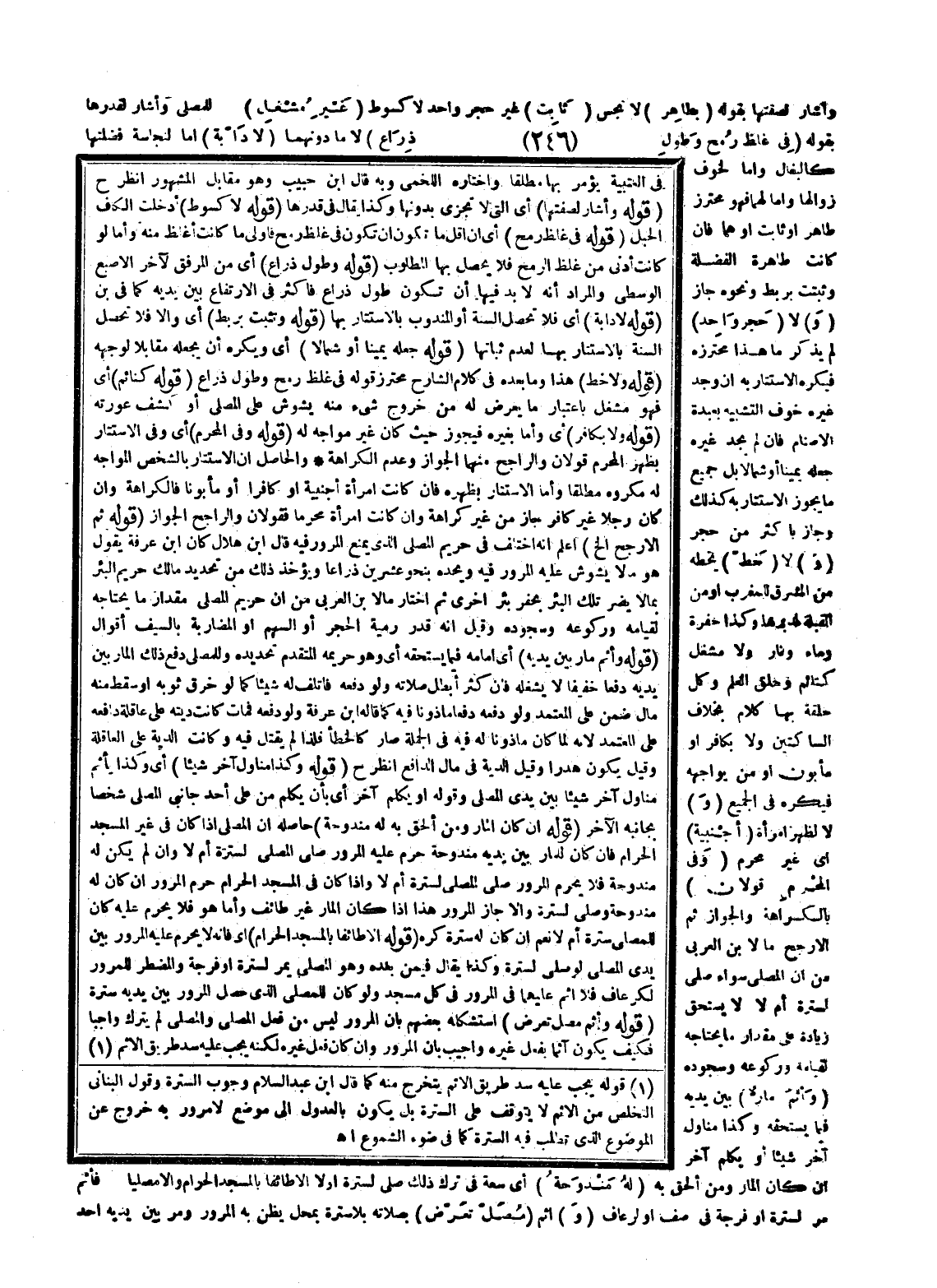 (قَوْلُهُ: وَأَشَارَ لِصِفَتِهَا) أَيْ الَّتِي لَا تُجْزِي بِدُونِهَا وَكَذَا يُقَالُ فِي قَدْرِهَا (قَوْلُهُ: لَا كَسَوْطٍ) أَدْخَلَتْ الْكَافُ الْحَبْلَ (قَوْلُهُ: فِي غِلَظِ رُمْحٍ) أَيْ إنَّ أَقَلَّ مَا تَكُونُ أَنْ تَكُونَ فِي غِلَظِ رُمْحٍ فَأَوْلَى مَا كَانَتْ أَغْلَظَ مِنْهُ وَأَمَّا لَوْ كَانَتْ أَدْنَى مِنْ غِلَظِ الرُّمْحِ فَلَا يَحْصُلُ بِهَا الْمَطْلُوبُ (قَوْلُهُ: وَطُولِ ذِرَاعٍ) أَيْ مِنْ الْمُرْفَقِ لِآخِرِ الْإِصْبَعِ الْوُسْطَى وَالْمُرَادُ أَنَّهُ لَا بُدَّ فِيهَا أَنْ تَكُونَ طُولَ ذِرَاعٍ فَأَكْثَرَ فِي الِارْتِفَاعِ بَيْنَ يَدَيْهِ كَمَا فِي بْن (قَوْلُهُ: لَا دَابَّةً) أَيْ فَلَا تَحْصُلُ السُّنَّةُ أَوْ الْمَنْدُوبُ بِالِاسْتِتَارِ بِهَا (قَوْلُهُ: وَتَثْبُتُ بِرَبْطٍ) أَيْ وَإِلَّا فَلَا تَحْصُلُ السُّنَّةُ بِالِاسْتِتَارِ بِهَا لِعَدَمِ ثَبَاتِهَا (قَوْلُهُ: جَعَلَهُ يَمِينًا أَوْ شِمَالًا) أَيْ وَيُكْرَهُ أَنْ يَجْعَلَهُ مُقَابِلًا لِوَجْهِهِ (قَوْلُهُ: وَلَا خَطٌّ) هَذَا وَمَا بَعْدَهُ فِي كَلَامِ الشَّارِحِ مُحْتَرَزُ قَوْلِهِ فِي غِلَظِ رُمْحٍ وَطُولِ ذِرَاعٍ (قَوْلُهُ: كَنَائِمٍ) أَيْ فَهُوَ مُشْغَلٌ بِاعْتِبَارِ مَا يَعْرِضُ لَهُ مِنْ خُرُوجِ شَيْءٍ مِنْهُ يُشَوِّشُ عَلَى الْمُصَلِّي أَوْ كَشْفِ عَوْرَتِهِ (قَوْلُهُ: وَلَا بِكَافِرٍ) أَيْ وَأَمَّا بِغَيْرِهِ فَيَجُوزُ حَيْثُ كَانَ غَيْرَ مُوَاجِهٍ لَهُ (قَوْلُهُ: وَفِي الْمَحْرَمِ) أَيْ وَفِي الِاسْتِتَارِ بِظَهْرِ الْمَحْرَمِ قَوْلَانِ وَالرَّاجِحُ مِنْهُمَا الْجَوَازُ وَعَدَمُ الْكَرَاهَةِ. وَالْحَاصِلُ أَنَّ الِاسْتِتَارَ بِالشَّخْصِ الْمُوَاجِهِ لَهُ مَكْرُوهٌ مُطْلَقًا وَأَمَّا الِاسْتِتَارُ بِظَهْرِهِ فَإِنْ كَانَتْ امْرَأَةً أَجْنَبِيَّةً أَوْ كَافِرًا أَوْ مَأْبُونًا فَالْكَرَاهَةُ وَإِنْ كَانَ رَجُلًا غَيْرَ كَافِرٍ جَازَ مِنْ غَيْرِ كَرَاهَةٍ وَإِنْ كَانَتْ امْرَأَةً مَحْرَمًا فَقَوْلَانِ وَالرَّاجِحُ الْجَوَازُ (قَوْلُهُ: ثُمَّ الْأَرْجَحُ إلَخْ) اعْلَمْ أَنَّهُ اُخْتُلِفَ فِي حَرِيمِ الْمُصَلِّي الَّذِي يُمْنَعُ الْمُرُورُ فِيهِ قَالَ ابْنُ هِلَالٍ كَانَ ابْنُ عَرَفَةَ يَقُولُ هُوَ مَا لَا يُشَوِّشُ عَلَيْهِ الْمُرُورُ فِيهِ وَيَحُدُّهُ بِنَحْوِ عِشْرِينَ ذِرَاعًا وَيُؤْخَذُ ذَلِكَ مِنْ تَحْدِيدِ مَالِكٍ حَرِيمَ الْبِئْرِ بِمَا لَا يَضُرُّ تِلْكَ الْبِئْرَ بِحَفْرِ بِئْرٍ أُخْرَى ثُمَّ اخْتَارَ مَا لِابْنِ الْعَرَبِيِّ مِنْ أَنَّ حَرِيمَ الْمُصَلِّي مِقْدَارُ مَا يَحْتَاجُهُ لِقِيَامِهِ وَرُكُوعِهِ وَسُجُودِهِ وَقِيلَ إنَّهُ قَدْرُ رَمْيَةِ الْحَجَرِ أَوْ السَّهْمِ أَوْ الْمُضَارَبَةِ بِالسَّيْفِ أَقْوَالٌ.