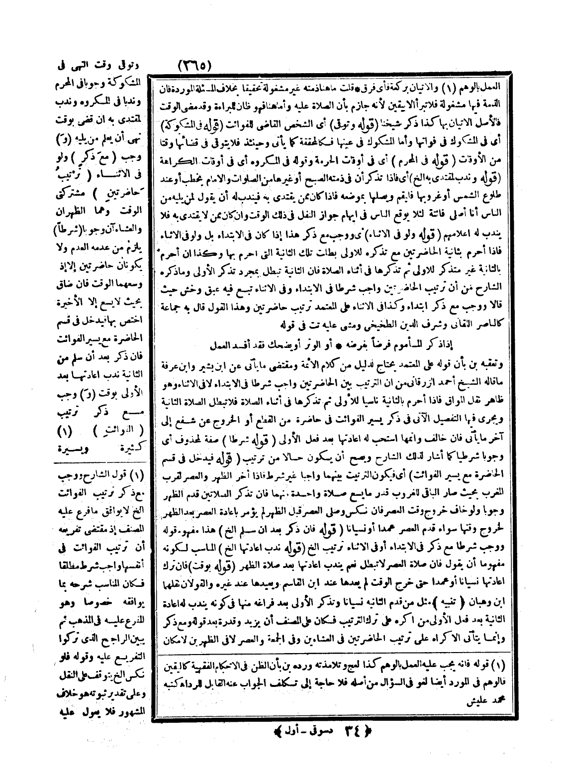 (قَوْلُهُ فَيَدْخُلُ فِي قِسْمِ الْحَاضِرَةِ مَعَ يَسِيرِ الْفَوَائِتِ) أَيْ فَيَكُونُ التَّرْتِيبُ بَيْنَهُمَا وَاجِبًا غَيْرَ شَرْطٍ فَإِذَا أَخَّرَ الظُّهْرَ وَالْعَصْرَ لِقُرْبِ الْمَغْرِبِ بِحَيْثُ صَارَ الْبَاقِي لِلْغُرُوبِ قَدْرَ مَا يَسَعُ صَلَاةً وَاحِدَةً مِنْهُمَا فَإِنْ تَذَكَّرَ الصَّلَاتَيْنِ قَدَّمَ الظُّهْرَ وُجُوبًا وَلَوْ خَافَ خُرُوجَ وَقْتِ الْعَصْرِ فَإِنْ نَكَّسَ وَصَلَّى الْعَصْرَ قَبْلَ الظُّهْرِ لَمْ يُؤْمَرْ بِإِعَادَةِ الْعَصْرِ بَعْدَ الظُّهْرِ لِخُرُوجِ وَقْتِهَا سَوَاءٌ قَدَّمَ الْعَصْرَ عَمْدًا أَوْ نِسْيَانًا.