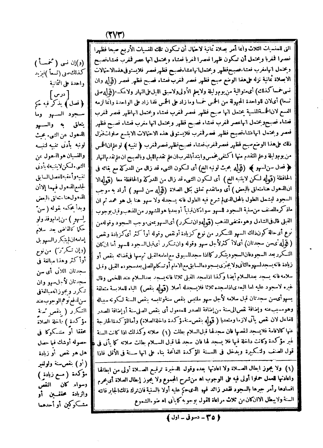 [دَرْسٌ] فَصْلٌ يُذْكَرُ فِيهِ حُكْمُ سُجُودِ السَّهْوِ وَمَا يَتَعَلَّقُ بِهِ وَالسَّهْوُ الذُّهُولُ عَنْ الشَّيْءِ بِحَيْثُ لَوْ نُبِّهَ بِأَدْنَى تَنْبِيهٍ لَتَنَبَّهَ وَالنِّسْيَانُ هُوَ الذُّهُولُ عَنْ الشَّيْءِ لَكِنْ لَا يَتَنَبَّهُ لَهُ بِأَدْنَى تَنْبِيهٍ وَأَعْقَبَهُ لِلْفَصْلِ السَّابِقِ لِجَامِعِ الذُّهُولِ فِيهِمَا إلَّا أَنَّ الذُّهُولَ هُنَا مُتَعَلِّقٌ بِالْبَعْضِ وَبَدَأَ بِحُكْمِهِ بِقَوْلِهِ (سُنَّ لِسَهْوٍ) مِنْ إمَامٍ وَفَذٍّ وَلَوْ حُكْمًا كَالْقَاضِي بَعْدَ سَلَامِ إمَامِهِ إنْ لَمْ يَتَكَرَّرْ السَّهْوُ بَلْ (وَإِنْ تَكَرَّرَ) مِنْ نَوْعٍ أَوْ أَكْثَرَ وَهَذَا مُبَالَغَةٌ فِي سَجْدَتَانِ اللَّاتِي أَيْ سُنَّ سَجْدَتَانِ لِأَجْلِ سَهْوٍ وَإِنْ تَكَرَّرَ وَيَجُوزُ أَنَّهُ مُبَالَغَةٌ فِي سُنَّ لِدَفْعِ تَوَهُّمِ الْوُجُوبِ عِنْدَ التَّكَرُّرِ (بِنَقْصِ سُنَّةٍ مُؤَكَّدَةٍ) دَاخِلَ الصَّلَاةَ مُحَقَّقًا أَوْ مَشْكُوكًا فِي حُصُولِهِ أَوْ شَكَّ فِيمَا حَصَلَ هَلْ هُوَ نَقْصٌ أَوْ زِيَادَةٌ (أَوْ) بِنَقْصِ سُنَّةٍ وَلَوْ لِغَيْرِ مُؤَكَّدَةٍ (مَعَ زِيَادَةِ) وَسَوَاءٌ كَانَ النَّقْصُ وَالزِّيَادَةُ مُحَقَّقَيْنِ أَوْ مَشْكُوكَيْنِ أَوْ أَحَدُهُمَا