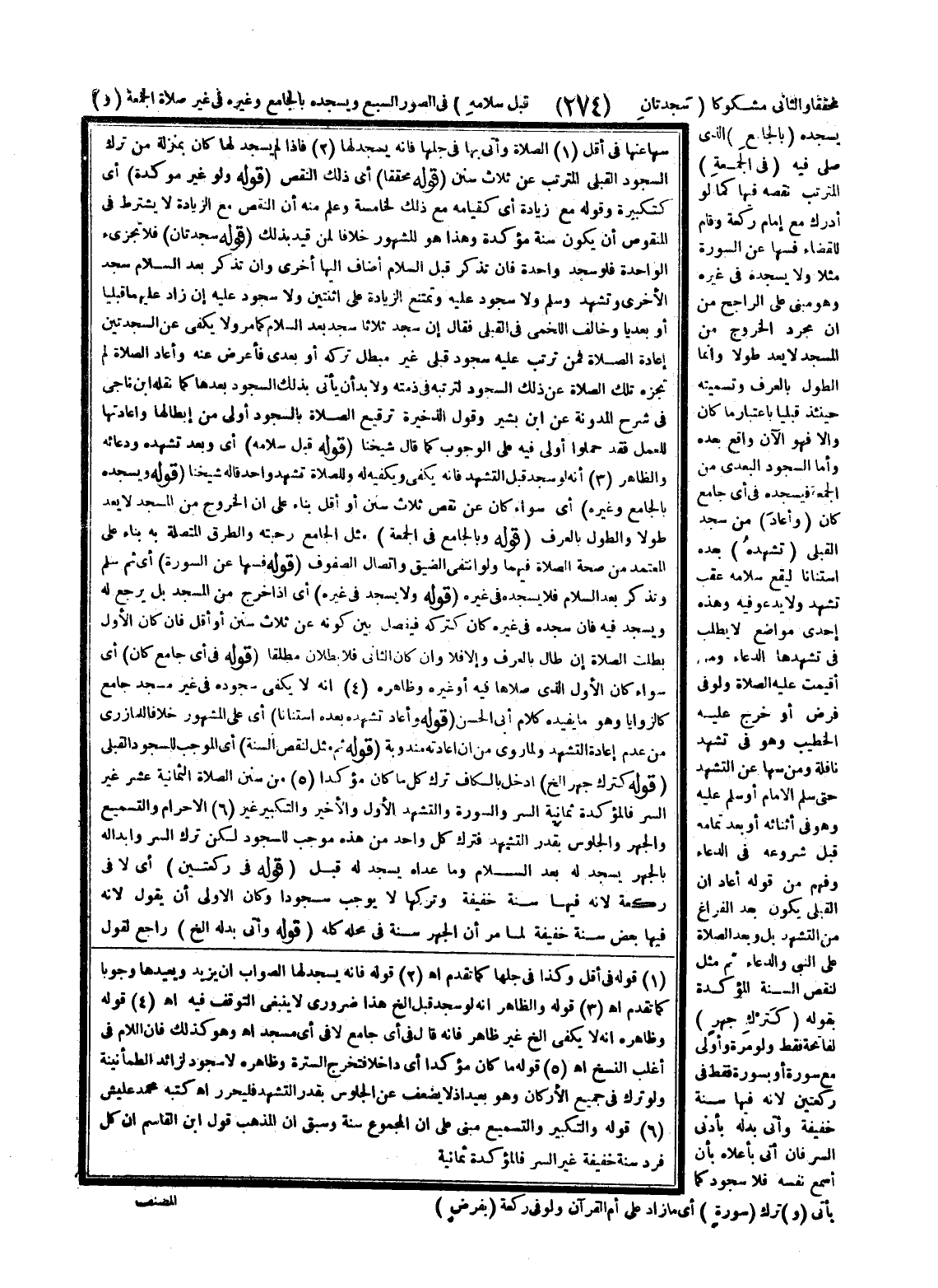 مُحَقَّقًا وَالثَّانِي مَشْكُوكًا (سَجْدَتَانِ قَبْلَ سَلَامِهِ) فِي الصُّوَرِ السَّبْعِ وَيَسْجُدُهُ بِالْجَامِعِ وَغَيْرِهِ فِي غَيْرِ صَلَاةِ الْجُمُعَةِ (و) يَسْجُدُهُ (بِالْجَامِعِ) الَّذِي صَلَّى فِيهِ (فِي الْجُمُعَةِ) الْمُتَرَتِّبِ نَقْصُهُ فِيهَا كَمَا لَوْ أَدْرَكَ مَعَ إمَامٍ رَكْعَةً وَقَامَ لِلْقَضَاءِ فَسَهَا عَنْ السُّورَةِ مَثَلًا وَلَا يَسْجُدُهُ فِي غَيْرِهِ وَهُوَ مَبْنِيٌّ عَلَى الرَّاجِحِ مِنْ أَنَّ مُجَرَّدَ الْخُرُوجِ مِنْ الْمَسْجِدِ لَا يُعَدُّ طُولًا وَإِنَّمَا الطُّولُ بِالْعُرْفِ وَتَسْمِيَتُهُ حِينَئِذٍ قَبْلِيًّا بِاعْتِبَارِ مَا كَانَ وَإِلَّا فَهُوَ الْآنَ وَاقِعٌ بَعْدَهُ وَأَمَّا السُّجُودُ الْبَعْدِيُّ مِنْ الْجُمُعَةِ فَيَسْجُدُهُ فِي أَيِّ جَامِعٍ كَانَ (وَأَعَادَ) مَنْ سَجَدَ الْقَبْلِيَّ (تَشَهُّدَهُ) بَعْدَهُ اسْتِنَانًا لِيَقَعَ سَلَامُهُ عَقِبَ تَشَهُّدٍ وَلَا يَدْعُو فِيهِ وَهَذِهِ إحْدَى مَوَاضِعَ لَا يُطْلَبُ فِي تَشَهُّدِهَا الدُّعَاءُ وَمَنْ أُقِيمَتْ عَلَيْهِ الصَّلَاةُ وَلَوْ فِي فَرْضٍ أَوْ خَرَجَ عَلَيْهِ الْخَطِيبُ وَهُوَ فِي تَشَهُّدِ نَافِلَةٍ وَمَنْ سَهَا عَنْ التَّشَهُّدِ حَتَّى سَلَّمَ الْإِمَامُ أَوْ سَلَّمَ عَلَيْهِ وَهُوَ فِي أَثْنَائِهِ أَوْ بَعْدَ تَمَامِهِ قَبْلَ شُرُوعِهِ فِي الدُّعَاءِ وَفُهِمَ مِنْ قَوْلِهِ أَعَادَ أَنَّ الْقَبْلِيَّ يَكُونُ بَعْدَ الْفَرَاغِ مِنْ التَّشَهُّدِ بَلْ وَبَعْدَ الصَّلَاةِ عَلَى النَّبِيِّ وَالدُّعَاءِ ثُمَّ مَثَّلَ لِنَقْصِ السُّنَّةِ الْمُؤَكَّدَةِ بِقَوْلِهِ (كَتَرْكِ جَهْرٍ) لِفَاتِحَةٍ فَقَطْ وَلَوْ مَرَّةً وَأَوْلَى مَعَ سُورَةٍ أَوْ بِسُورَةٍ فَقَطْ فِي رَكْعَتَيْنِ لِأَنَّهُ فِيهَا سُنَّةٌ خَفِيفَةٌ وَأَتَى بَدَلَهُ بِأَدْنَى السِّرِّ فَإِنْ أَتَى بِأَعْلَاهُ بِأَنْ أَسْمَعَ نَفْسَهُ فَلَا سُجُودَ كَمَا يَأْتِي