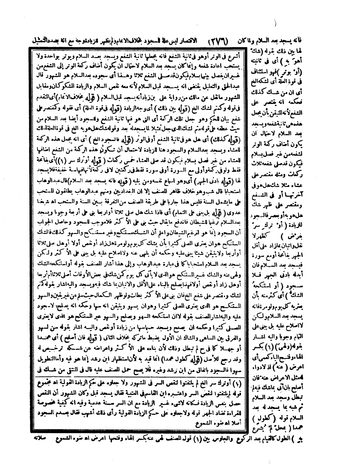 فَإِنَّهُ يَسْجُدُ بَعْدَ السَّلَامِ وَلَمَّا كَانَ الِاقْتِصَارُ لَيْسَ عِلَّةً لِلسُّجُودِ بِخِلَافِ الْإِتْمَامِ وَلَمْ يَظْهَرْ لِلزِّيَادَةِ وَجْهٌ مَعَ أَنَّهُ بِصَدَدِ التَّمْثِيلِ لَهَا بَيَّنَ ذَلِكَ بِقَوْلِهِ (شَكَّ أَهُوَ بِهِ) أَيْ فِي ثَانِيَتِهِ (أَوْ بِوَتْرٍ) فَهُوَ اسْتِئْنَافٌ فِي قُوَّةِ الْعِلَّةِ أَيْ لِشَكِّهِ إلَخْ أَيْ أَنَّ مَنْ شَكَّ كَذَلِكَ فَحُكْمُهُ أَنَّهُ يَقْتَصِرُ عَلَى الشَّفْعِ لِأَنَّهُ الْمُتَيَقَّنُ بِأَنْ يَجْعَلَ هَذِهِ هِيَ ثَانِيَةَ شَفْعِهِ وَيَسْجُدَ بَعْدَ السَّلَامِ لِاحْتِمَالِ أَنْ يَكُونَ أَضَافَ رَكْعَةَ الْوَتْرِ لِشَفْعِهِ مِنْ غَيْرِ فَصْلٍ بِسَلَامٍ فَيَكُونُ قَدْ صَلَّى شَفْعَهُ ثَلَاثَ رَكَعَاتٍ وَمِثْلُهُ مُقْتَصِرٌ عَلَى عِشَاءٍ مَثَلًا شَكَّ هَلْ هُوَ فِي آخِرَتِهَا أَوْ فِي الشَّفْعِ وَمُقْتَصِرٌ عَلَى ظُهْرٍ شَكَّ هَلْ هُوَ بِهِ أَوْ بِعَصْرٍ فَالسُّجُودُ لِلزِّيَادَةِ