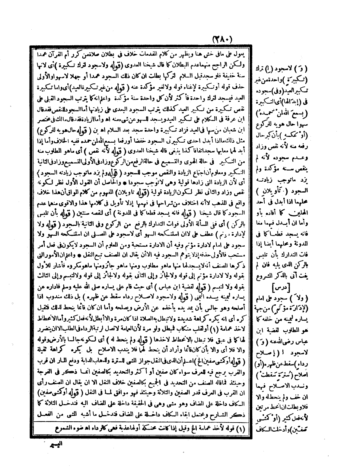 [دَرْسٌ] (وَلَا) سُجُودَ عَلَى إمَامٍ (لِإِدَارَةِ مُؤْتَمٍّ) مِنْ جِهَةِ يَسَارِهِ لِيَمِينِهِ مِنْ خَلْفِهِ كَمَا هُوَ الْمَطْلُوبُ لِقَضِيَّةِ ابْنِ عَبَّاسٍ - رَضِيَ اللَّهُ عَنْهُ - (و) لَا سُجُودَ ل (إصْلَاحِ رِدَاءٍ) سَقَطَ عَنْ ظَهْرِهِ (أَوْ) إصْلَاحِ (سُتْرَةٍ سَقَطَتْ) وَنُدِبَ الْإِصْلَاحُ فِيهِمَا إنْ خَفَّ وَلَمْ يَنْحَطَّ لَهُ وَإِلَّا فَلَا وَبَطَلَتْ إنْ انْحَطَّ مَرَّتَيْنِ لِأَنَّهُ فِعْلٌ كَثِيرٌ (أَوْ) (كَمَشْيِ صَفَّيْنِ) وَأُدْخِلَتْ الْكَافُ