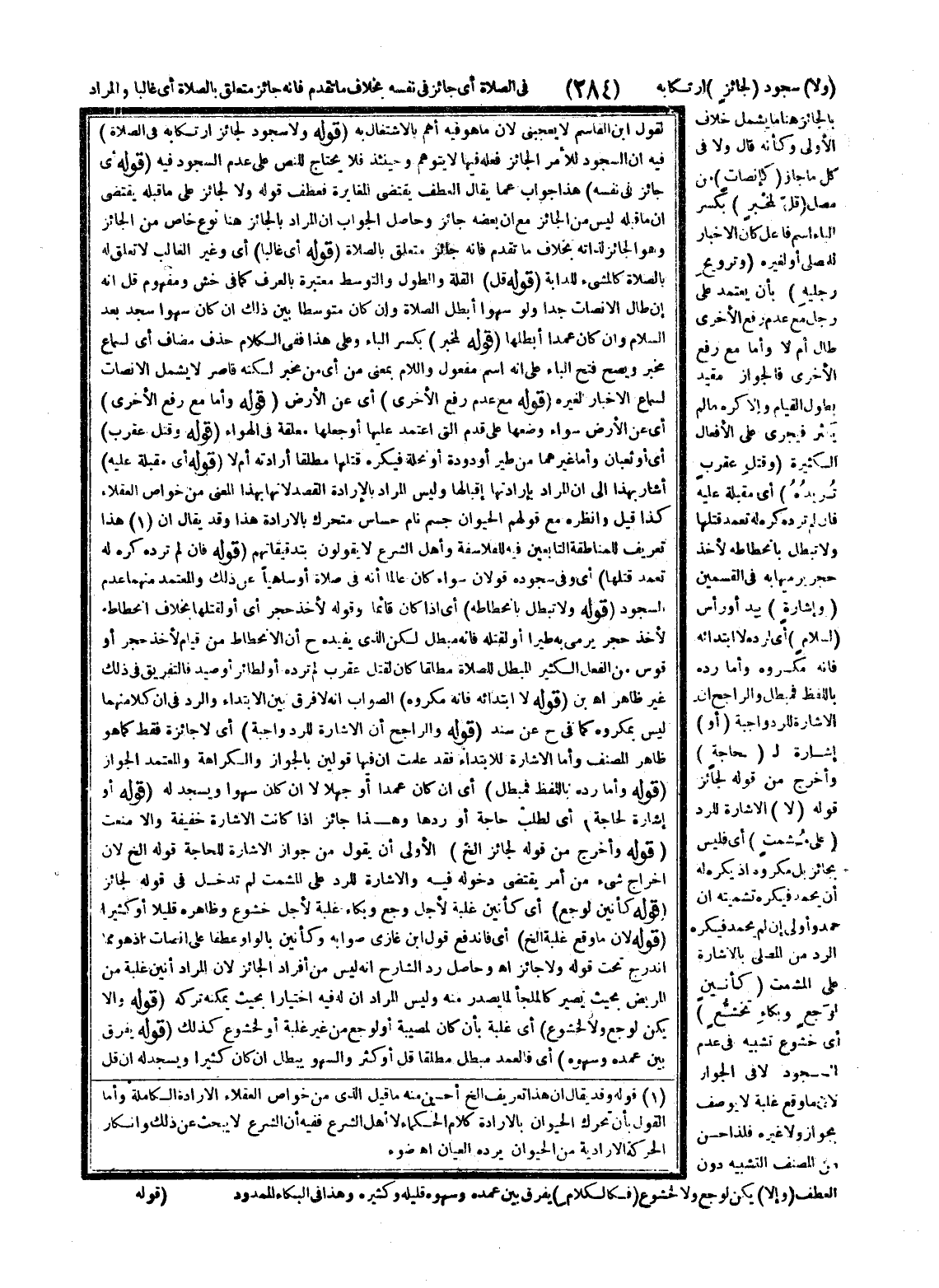 (وَلَا) سُجُودَ (لِجَائِزٍ) ارْتِكَابُهُ فِي الصَّلَاةِ أَيْ جَائِزٍ فِي نَفْسِهِ بِخِلَافِ مَا تَقَدَّمَ فَإِنَّهُ جَائِزٌ مُتَعَلِّقٌ بِالصَّلَاةِ أَيْ غَالِبًا وَالْمُرَادُ بِالْجَائِزِ هُنَا مَا يَشْمَلُ خِلَافَ الْأَوْلَى وَكَأَنَّهُ قَالَ وَلَا فِي كُلِّ مَا جَازَ (كَإِنْصَاتٍ) مِنْ مُصَلٍّ (قَلَّ لِمُخْبِرٍ) بِكَسْرِ الْبَاءِ اسْمُ فَاعِلٍ كَانَ الْإِخْبَارُ لِلْمُصَلِّي أَوْ لِغَيْرِهِ (وَتَرْوِيحِ رِجْلَيْهِ) بِأَنْ يَعْتَمِدَ عَلَى رِجْلٍ مَعَ عَدَمِ رَفْعِ الْأُخْرَى طَالَ أَمْ لَا وَأَمَّا مَعَ رَفْعِ الْأُخْرَى فَالْجَوَازُ مُقَيَّدٌ بِطُولِ الْقِيَامِ وَإِلَّا كُرِهَ مَا لَمْ يَكْثُرْ فَيَجْرِي عَلَى الْأَفْعَالِ الْكَثِيرَةِ (وَقَتْلِ عَقْرَبٍ تُرِيدُهُ) أَيْ مُقْبِلَةٍ عَلَيْهِ فَإِنْ لَمْ تُرِدْهُ كُرِهَ لَهُ تَعَمُّدُ قَتْلِهَا وَلَا تَبْطُلُ بِانْحِطَاطِهِ لِأَخْذِ حَجَرٍ يَرْمِيهَا بِهِ فِي الْقِسْمَيْنِ (وَإِشَارَةٍ) بِيَدٍ أَوْ رَأْسٍ (لِسَلَامٍ) أَيْ لِرَدِّهِ لَا ابْتِدَائِهِ فَإِنَّهُ مَكْرُوهٌ وَأَمَّا رَدُّهُ بِاللَّفْظِ فَمُبْطِلٌ وَالرَّاجِحُ أَنَّ الْإِشَارَةَ لِلرَّدِّ وَاجِبَةٌ (أَوْ) إشَارَةٍ ل (حَاجَةٍ) وَأَخْرَجَ مِنْ قَوْلِهِ لِجَائِزٍ قَوْلُهُ (لَا) الْإِشَارَةِ لِلرَّدِّ (عَلَى مُشَمِّتٍ) أَيْ فَلَيْسَ بِجَائِزٍ بَلْ مَكْرُوهٌ إذْ يُكْرَهُ لَهُ أَنْ يَحْمَدَ فَيُكْرَهُ تَشْمِيتُهُ إنْ حَمِدَ وَأَوْلَى إنْ لَمْ يَحْمَدْ فَيُكْرَهُ الرَّدُّ مِنْ الْمُصَلِّي بِالْإِشَارَةِ عَلَى الْمُشَمِّتِ (كَأَنِينٍ لِوَجَعٍ وَبُكَاءِ تَخَشُّعٍ) أَيْ خُشُوعٍ تَشْبِيهٌ فِي عَدَمِ السُّجُودِ لَا فِي الْجَوَازِ لِأَنَّ مَا وَقَعَ غَلَبَةً لَا يُوصَفُ بِجَوَازٍ وَلَا غَيْرِهِ فَلِذَا حَسُنَ مِنْ الْمُصَنِّفِ التَّشْبِيهُ دُونَ الْعَطْفِ (وَإِلَّا) يَكُنْ لِوَجَعٍ وَلَا لِخُشُوعٍ (فَكَالْكَلَامِ) يُفَرَّقُ بَيْنَ عَمْدِهِ وَسَهْوِهِ قَلِيلِهِ وَكَثِيرِهِ وَهَذَا فِي الْبُكَاءِ الْمَمْدُودِ