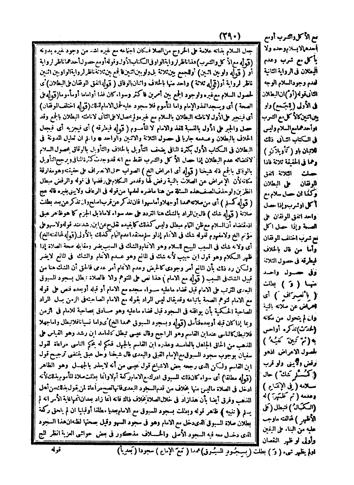 مَعَ الْأَكْلِ وَالشُّرْبِ أَوْ مَعَ أَحَدِهِمَا إلَّا بِسَلَامٍ وَحْدَهُ وَلَا بِأَكْلٍ مَعَ شُرْبٍ وَعَدَمُ الْبُطْلَانِ فِي الرِّوَايَةِ الثَّانِيَةِ لِعَدَمِ وُجُودِ السَّلَامِ، الْوَجْهُ الثَّانِي قَوْلُهُ (أَوْ) أَنَّ الْبُطْلَانَ فِي الْأُولَى (لِلْجَمْعِ) وَلَوْ بَيْنَ اثْنَيْنِ كَالْأَكْلِ مَعَ الشُّرْبِ أَوْ أَحَدِهِمَا مَعَ السَّلَامِ وَلَيْسَ فِي الْكِتَاب الثَّانِي ذَلِكَ لِلْإِتْيَانِ بِأَوْ (تَأْوِيلَانِ) وَهُمَا فِي الْحَقِيقَةِ ثَلَاثَةٌ فَإِذَا حَصَلَتْ الثَّلَاثَةُ اتَّفَقَ الْمُوَفَّقَانِ عَلَى الْبُطْلَانِ وَكَذَا إنْ حَصَلَ سَلَامٌ مَعَ أَكْلٍ أَوْ شُرْبٍ وَإِذَا حَصَلَ وَاحِدٌ اتَّفَقَ الْمُوَفَّقَانِ عَلَى الصِّحَّةِ وَإِذَا حَصَلَ أَكْلٌ مَعَ شُرْبٍ اخْتَلَفَ الْمُوَفِّقَانِ وَأَمَّا مَنْ قَالَ بِالْخِلَافِ فَيَطْرُقُهُ فِي حُصُولِ الثَّلَاثَةِ وَفِي حُصُولِ وَاحِدٍ مِنْهَا