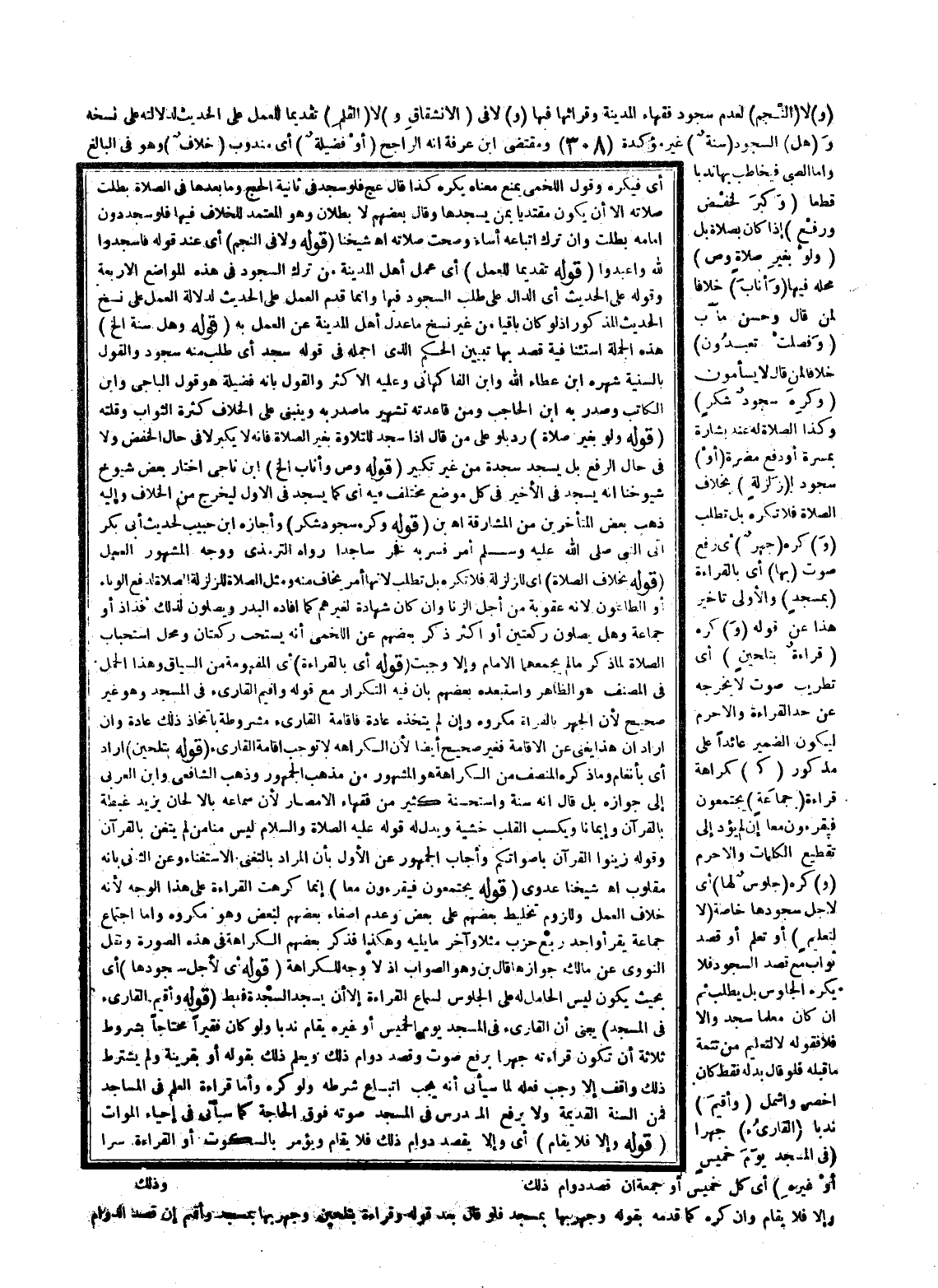 (وَكُرِهَ) (سُجُودُ شُكْرٍ) وَكَذَا الصَّلَاةُ لَهُ عِنْدَ بِشَارَةٍ بِمَسَرَّةٍ أَوْ دَفْعِ مَضَرَّةٍ (أَوْ) سُجُودٍ ل (زَلْزَلَةٍ) بِخِلَافِ الصَّلَاةِ فَلَا تُكْرَهُ بَلْ تُطْلَبُ (و) كُرِهَ (جَهْرٌ) أَيْ رَفْعُ صَوْتٍ (بِهَا) أَيْ بِالْقِرَاءَةِ (بِمَسْجِدٍ) وَالْأَوْلَى تَأْخِيرُ هَذَا عَنْ قَوْلِهِ (و) كُرِهَ (قِرَاءَةٌ بِتَلْحِينٍ) أَيْ تَطْرِيبِ صَوْتٍ لَا يُخْرِجُهُ عَنْ حَدِّ الْقِرَاءَةِ وَالْإِحْرَامِ لِيَكُونَ الضَّمِيرُ عَائِدًا عَلَى مَذْكُورٍ (ك) كَرَاهَةِ قِرَاءَةِ (جَمَاعَةٍ) يَجْتَمِعُونَ فَيَقْرَءُونَ مَعًا إنْ لَمْ يُؤَدِّ إلَى تَقْطِيعِ الْكَلِمَاتِ وَإِلَّا حَرُمَ (و) كُرِهَ (جُلُوسٌ لَهَا) أَيْ لِأَجْلٍ سُجُودِهَا خَاصَّةً (لَا لِتَعْلِيمٍ) أَوْ تَعَلُّمٍ أَوْ قَصْدِ ثَوَابٍ مَعَ قَصْدِ السُّجُودِ فَلَا يُكْرَهُ الْجُلُوسُ بَلْ يُطْلَبُ ثُمَّ إنْ كَانَ مُعَلِّمًا سَجَدَ وَإِلَّا فَلَا فَقَوْلُهُ لَا لِتَعْلِيمٍ مِنْ تَتِمَّةِ مَا قَبْلَهُ فَلَوْ قَالَ بَدَلَهُ فَقَطْ كَانَ أَخْصَرَ وَأَشْمَلَ (وَأُقِيمَ) نَدْبًا (الْقَارِئُ) جَهْرًا (فِي الْمَسْجِدِ يَوْمَ خَمِيسٍ أَوْ غَيْرِهِ) أَيْ كُلَّ خَمِيسٍ أَوْ جُمُعَةٍ إنْ قُصِدَ دَوَامُ ذَلِكَ وَإِلَّا فَلَا يُقَامُ وَإِنْ كُرِهَ كَمَا قَدَّمَهُ بِقَوْلِهِ وَجَهَرَ بِهَا بِمَسْجِدٍ فَلَوْ قَالَ بَعْدَ قَوْلِهِ وَقِرَاءَةٌ بِتَلْحِينٍ وَجَهْرٌ بِهَا بِمَسْجِدٍ وَأُقِيمَ إنْ قَصَدَ الدَّوَامَ