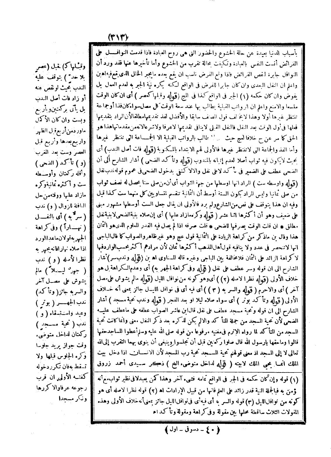 (وَقَبْلَهَا ك) قَبْلَ (عَصْرٍ بِلَا حَدٍّ) يَتَوَقَّفُ عَلَيْهِ النَّدْبُ بِحَيْثُ لَوْ نَقَصَ عَنْهُ أَوْ زَادَ فَاتَ أَصْلُ النَّدْبِ بَلْ يَأْتِي بِرَكْعَتَيْنِ وَبِأَرْبَعٍ وَبِسِتٍّ وَإِنْ كَانَ الْأَكْمَلُ مَا وَرَدَ مِنْ أَرْبَعٍ قَبْلَ الظُّهْرِ وَأَرْبَعٍ بَعْدَهَا وَأَرْبَعٍ قَبْلَ الْعَصْرِ وَسِتٍّ بَعْدَ الْمَغْرِبِ (و) تَأَكَّدَ (الضُّحَى) وَأَقَلُّهُ رَكْعَتَانِ وَأَوْسَطُهُ سِتٌّ وَأَكْثَرُهُ ثَمَانِيَةٌ وَكُرِهَ مَا زَادَ عَلَيْهَا وَوَقْتُهُ مِنْ حِلِّ النَّافِلَةِ لِلزَّوَالِ (و) نُدِبَ (سِرٌّ بِهِ) أَيْ بِالنَّفْلِ (نَهَارًا) وَفِي كَرَاهَةِ الْجَهْرِ بِهِ قَوْلَانِ مَا عَدَا الْوِرْدَ إذَا صَلَّاهُ نَهَارًا فَإِنَّهُ يَجْهَرُ بِهِ نَظَرًا لِأَصْلِهِ (و) نُدِبَ (جَهْرٌ لَيْلًا) مَا لَمْ يُشَوِّشْ عَلَى مُصَلٍّ آخَرَ وَالسِّرُّ بِهِ جَائِزٌ (وَتَأَكَّدَ) نَدْبُ الْجَهْرِ (بِوَتْرٍ) وَعِيدٍ وَاسْتِسْقَاءٍ (و) نُدِبَ (تَحِيَّةُ مَسْجِدٍ) رَكْعَتَانِ لِدَاخِلٍ مُتَوَضِّئٍ وَقْتَ جَوَازٍ يُرِيدُ جُلُوسًا وَكُرِهَ الْجُلُوسُ قَبْلَهَا وَلَا تَسْقُطُ بِهِ فَإِنْ تَكَرَّرَ دُخُولُهُ كَفَتْهُ الْأُولَى إنْ قَرُبَ رُجُوعُهُ عُرْفًا وَإِلَّا كَرَّرَهَا، وَنَكَّرَ مَسْجِدًا