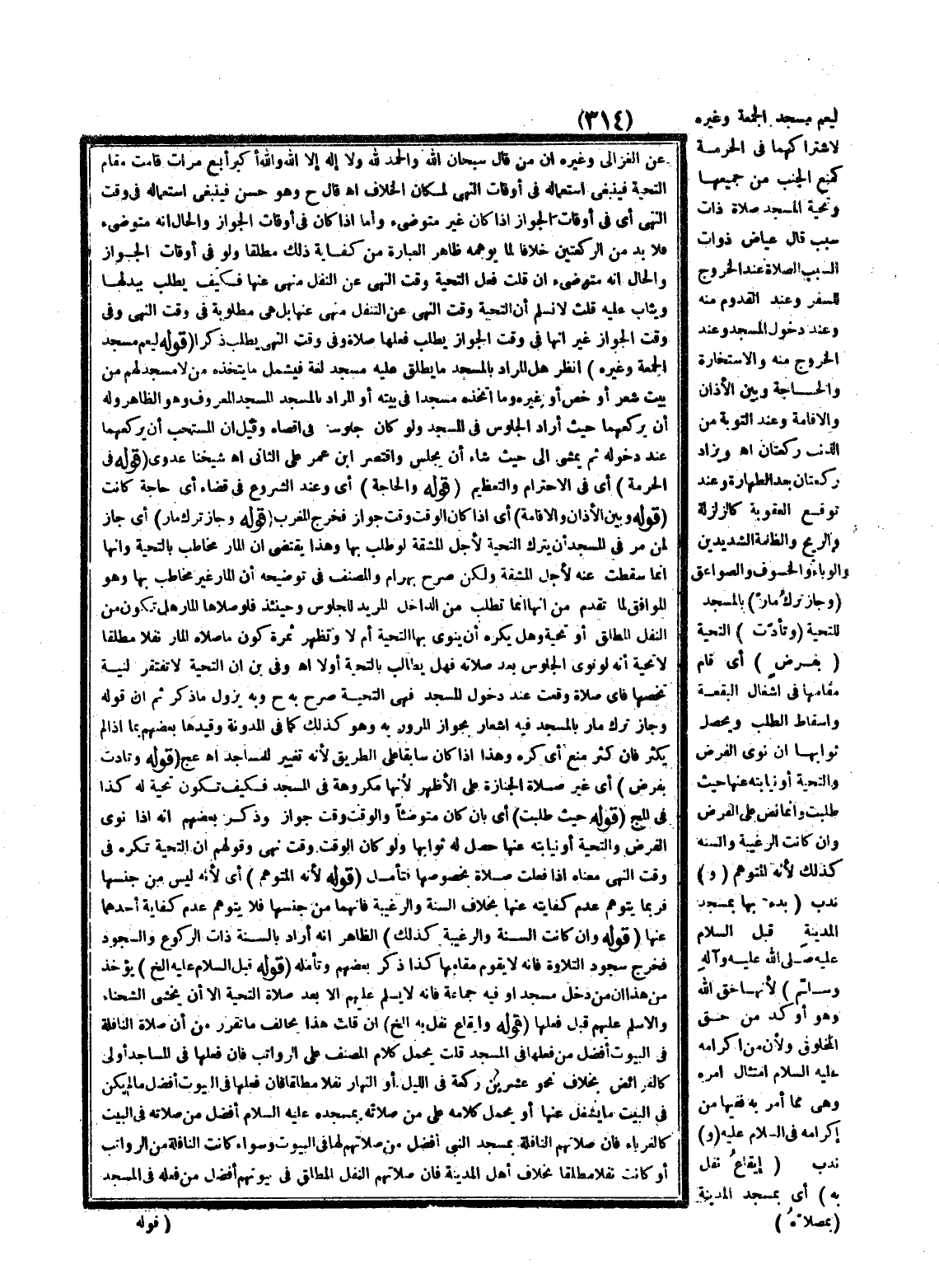 (قَوْلُهُ وَإِيقَاعُ نَفْلٍ بِهِ إلَخْ) إنْ قُلْت: هَذَا يُخَالِفُ مَا تَقَرَّرَ مِنْ أَنَّ صَلَاةَ النَّافِلَةِ فِي الْبُيُوتِ أَفْضَلُ مِنْ فِعْلِهَا فِي الْمَسْجِدِ قُلْت يُحْمَلُ كَلَامُ الْمُصَنِّفِ عَلَى الرَّوَاتِبِ فَإِنَّ فِعْلَهَا فِي الْمَسَاجِدِ أَوْلَى كَالْفَرَائِضِ بِخِلَافِ نَحْوِ عِشْرِينَ رَكْعَةً فِي اللَّيْلِ أَوْ النَّهَارِ نَفْلًا مُطْلَقًا فَإِنَّ فِعْلَهَا فِي الْبُيُوتِ أَفْضَلُ مَا لَمْ يَكُنْ فِي الْبَيْتِ مَا يَشْغَلُ عَنْهَا أَوْ يُحْمَلُ كَلَامُهُ عَلَى مَنْ صَلَاتُهُ بِمَسْجِدِهِ - عَلَيْهِ السَّلَامُ - أَفْضَلُ مِنْ صَلَاتِهِ فِي الْبَيْتِ كَالْغُرَبَاءِ فَإِنَّ صَلَاتَهُمْ النَّافِلَةَ بِمَسْجِدِ النَّبِيِّ أَفْضَلُ مِنْ صَلَاتِهِمْ لَهَا فِي الْبُيُوتِ وَسَوَاءٌ كَانَتْ النَّافِلَةُ مِنْ الرَّوَاتِبِ أَوْ كَانَتْ نَفْلًا مُطْلَقًا بِخِلَافِ أَهْلِ الْمَدِينَةِ فَإِنَّ صَلَاتَهُمْ النَّفَلَ الْمُطْلَقَ فِي بُيُوتِهِمْ أَفْضَلُ مِنْ فِعْلِهِ فِي الْمَسْجِدِ
