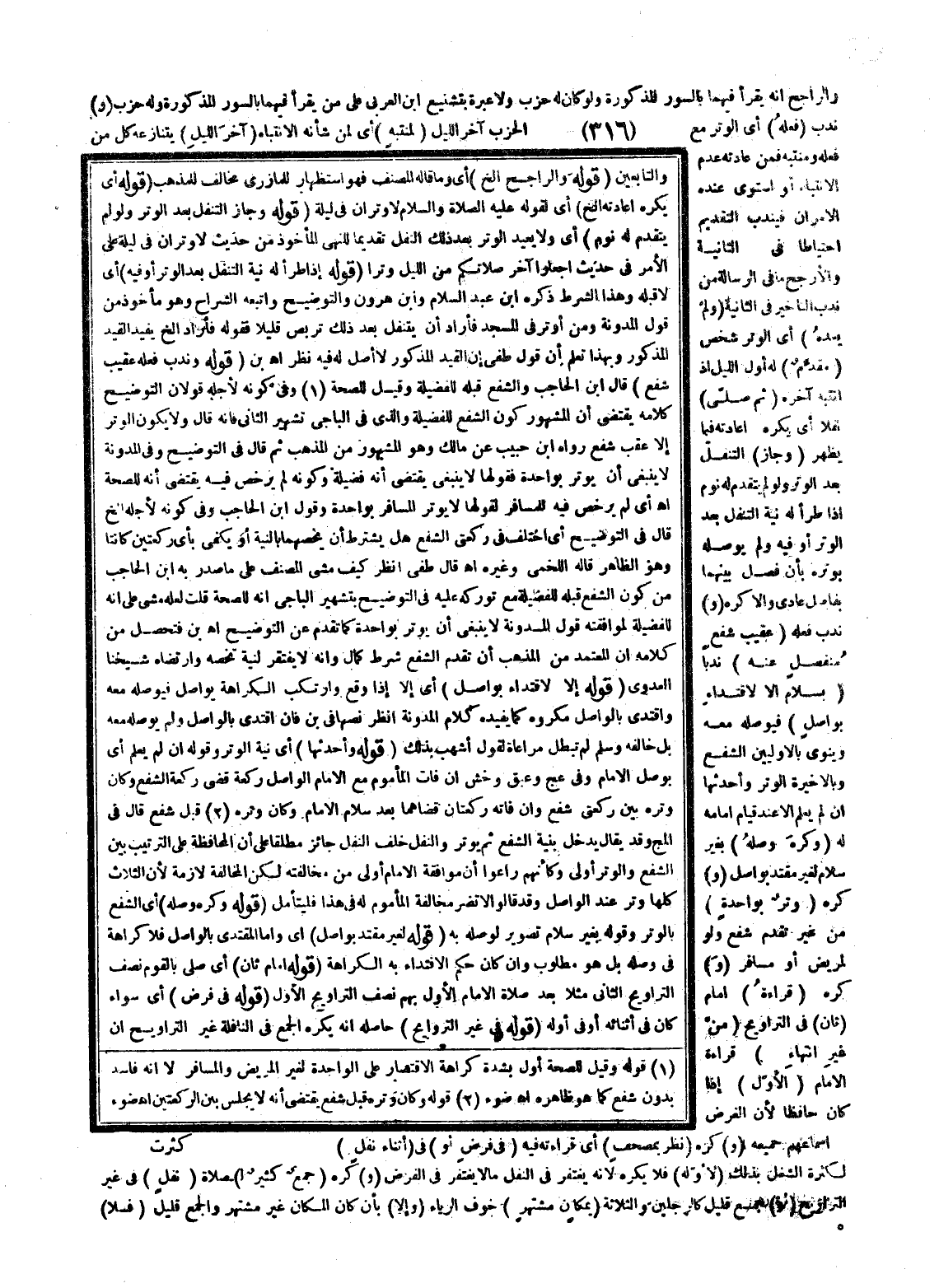 وَالرَّاجِحُ أَنَّهُ يَقْرَأُ فِيهِمَا بِالسُّوَرِ الْمَذْكُورَةِ وَلَوْ كَانَ لَهُ حِزْبٌ وَلَا عِبْرَةَ بِتَشْنِيعِ ابْنِ الْعَرَبِيِّ عَلَى مَا يَقْرَأُ فِيهِمَا بِالسُّوَرِ الْمَذْكُورَةِ وَلَهُ حِزْبٌ (و) نُدِبَ (فِعْلُهُ) أَيْ الْوَتْرِ مَعَ الْحِزْبِ آخِرَ اللَّيْلِ (لِمُنْتَبِهٍ) أَيْ لِمَنْ شَأْنُهُ الِانْتِبَاهُ (آخِرَ اللَّيْلِ) يَتَنَازَعُهُ كُلٌّ مِنْ فِعْلِهِ وَمُنْتَبِهٍ فَمَنْ عَادَتُهُ عَدَمُ الِانْتِبَاهِ أَوْ اسْتَوَى عِنْدَهُ الْأَمْرَانِ فَيُنْدَبُ التَّقْدِيمُ احْتِيَاطًا فِي الثَّانِيَةِ وَالْأَرْجَحُ مَا فِي الرِّسَالَةِ مِنْ نَدْبِ التَّأْخِيرِ فِي الثَّانِيَةِ (وَلَمْ يُعِدْهُ) أَيْ الْوَتْرَ شَخْصٌ (مُقَدِّمٌ) لَهُ أَوَّلَ اللَّيْلِ إذْ انْتَبَهَ آخِرَهُ (ثُمَّ صَلَّى) نَفْلًا أَيْ يُكْرَهُ إعَادَتُهُ فِيمَا يَظْهَرُ (وَجَازَ) التَّنَفُّلُ بَعْدَ الْوَتْرِ وَلَوْ لَمْ يَتَقَدَّمْ لَهُ نَوْمٌ إذَا طَرَأَ لَهُ نِيَّةُ التَّنَفُّلِ بَعْدَ الْوَتْرِ أَوْ فِيهِ وَلَمْ يُوصِلْهُ بِوَتْرِهِ بِأَنْ فَصَلَ بَيْنَهُمَا بِفَاصِلٍ عَادِيٍّ وَالْإِكْرَاهُ (و) نُدِبَ فِعْلُهُ (عَقِيبَ شَفْعٍ مُنْفَصِلٍ عَنْهُ) نَدْبًا (بِسَلَامٍ إلَّا لِاقْتِدَاءٍ بِوَاصِلٍ) فَيُوصِلُهُ مَعَهُ وَيَنْوِي بِالْأُولَيَيْنِ الشَّفْعَ وَبِالْأَخِيرَةِ الْوَتْرَ وَأَحْدَثَهَا إنْ لَمْ يَعْلَمْ إلَّا عِنْدَ قِيَامِ إمَامِهِ لَهُ (وَكُرِهَ وَصْلُهُ) بِغَيْرِ سَلَامٍ لِغَيْرِ مُقْتَدٍ بِوَاصِلٍ (و) كُرِهَ (وَتْرٌ بِوَاحِدَةٍ) مِنْ غَيْرِ تَقَدُّمِ شَفْعٍ وَلَوْ لِمَرِيضٍ أَوْ مُسَافِرٍ (و) كُرِهَ (قِرَاءَةُ) إمَامٍ (ثَانٍ) فِي التَّرَاوِيحِ (مِنْ غَيْرِ انْتِهَاءِ) قِرَاءَةِ الْإِمَامِ (الْأَوَّلِ) إذَا كَانَ حَافِظًا لِأَنَّ الْغَرَضَ إسْمَاعُهُمْ جَمِيعَهُ (و) كُرِهَ (نَظَرٌ بِمُصْحَفٍ) أَيْ قِرَاءَتُهُ فِيهِ (فِي فَرْضٍ أَوْ) فِي (أَثْنَاءِ نَفْلٍ) لِكَثْرَةِ الشُّغْلِ بِذَلِكَ (لَا أَوَّلَهُ) فَلَا يُكْرَهُ لِأَنَّهُ يُغْتَفَرُ فِي النَّفْلِ مَا لَا يُغْتَفَرُ فِي الْفَرْضِ (و) كَرِهَ (جَمْعٌ كَثِيرٌ ل) صَلَاةَ (نَفْلٍ) فِي غَيْرِ التَّرَاوِيحِ (أَوْ) جَمْعٌ قَلِيلٌ كَالرَّجُلَيْنِ وَالثَّلَاثَةِ (بِمَكَانٍ مُشْتَهَرٍ) خَوْفَ الرِّيَاءِ (وَإِلَّا) بِأَنْ كَانَ الْمَكَانُ غَيْرَ مُشْتَهَرٍ وَالْجَمْعُ قَلِيلٌ (فَلَا)