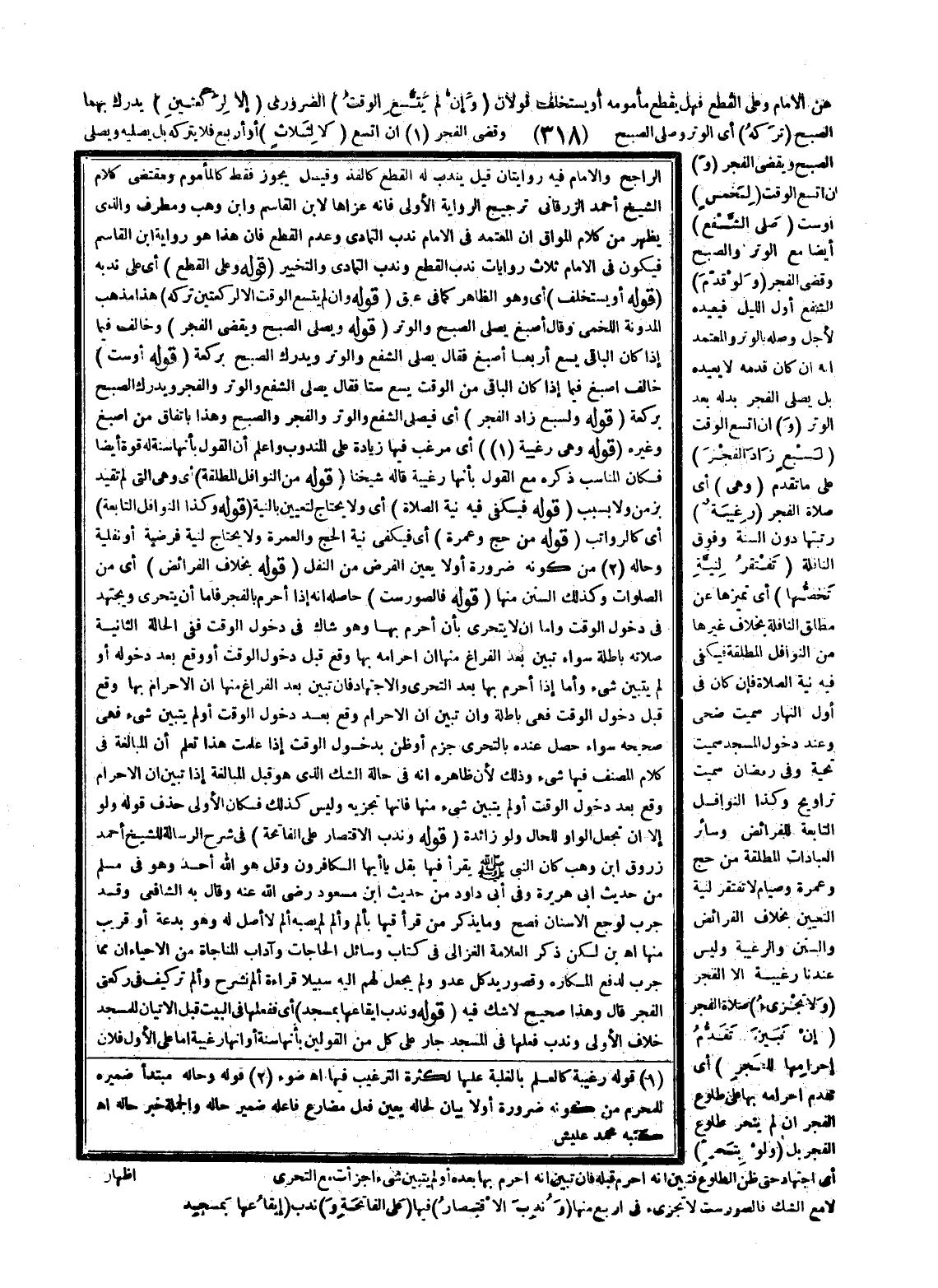 عَنْ الْإِمَامِ وَعَلَى الْقَطْعِ فَهَلْ يَقْطَعُ مَأْمُومُهُ أَوْ يَسْتَخْلِفُ قَوْلَانِ (وَإِنْ لَمْ يَتَّسِعْ الْوَقْتُ) الضَّرُورِيُّ (إلَّا لِرَكْعَتَيْنِ) يُدْرِك بِهِمَا الصُّبْحَ (تَرَكَهُ) أَيْ الْوَتْرَ وَصَلَّى الصُّبْحَ وَقَضَى الْفَجْرَ إنْ اتَّسَعَ (لَا لِثَلَاثٍ) أَوْ أَرْبَعٍ فَلَا يَتْرُكُهُ بَلْ يُصَلِّيه وَيُصَلِّي الصُّبْحَ وَيَقْضِي الْفَجْرَ (و) إنْ اتَّسَعَ الْوَقْتُ (لِخَمْسٍ) أَوْ سِتٍّ (صَلَّى الشَّفْعَ) أَيْضًا مَعَ الْوَتْرِ وَالصُّبْحِ وَقَضَى الْفَجْرَ (وَلَوْ) (قَدَّمَ) الشَّفْعَ فِي أَوَّلِ اللَّيْلِ فَيُعِيدُهُ لِأَجْلِ وَصْلِهِ بِالْوَتْرِ وَالْمُعْتَمَدُ أَنَّهُ إنْ كَانَ قَدَّمَهُ لَا يُعِيدُهُ بَلْ يُصَلِّي الْفَجْرَ بَدَلَهُ بَعْدَ الْوَتْرِ (و) إنْ اتَّسَعَ الْوَقْتُ (لِسَبْعٍ زَادَ الْفَجْرَ) عَلَى مَا تَقَدَّمَ (وَهِيَ) أَيْ صَلَاةُ الْفَجْرِ (رَغِيبَةٌ) رُتْبَتُهَا دُونَ السُّنَّةِ وَفَوْقَ النَّافِلَةِ (تَفْتَقِرُ لِنِيَّةٍ تَخُصُّهَا) أَيْ تُمَيِّزُهَا عَنْ مُطْلَقُ النَّافِلَةِ بِخِلَافِ غَيْرِهَا مِنْ النَّوَافِلِ الْمُطْلَقَةِ فَيَكْفِي فِيهِ نِيَّةُ الصَّلَاةِ فَإِنْ كَانَ فِي أَوَّلِ النَّهَارِ سُمِّيَتْ ضُحًى وَعِنْدَ دُخُولِ الْمَسْجِدِ سُمِّيَتْ تَحِيَّةً وَفِي رَمَضَانَ سُمِّيَتْ تَرَاوِيحَ وَكَذَا النَّوَافِلُ التَّابِعَةُ لِلْفَرَائِضِ وَسَائِرِ الْعِبَادَاتِ الْمُطْلَقَةِ مِنْ حَجٍّ وَعُمْرَةٍ وَصِيَامٍ لَا تَفْتَقِرُ لِنِيَّةِ التَّعْيِينِ بِخِلَافِ الْفَرَائِضِ وَالسُّنَنِ وَالرَّغِيبَةِ وَلَيْسَ عِنْدَنَا رَغِيبَةٌ إلَّا الْفَجْرُ (وَلَا تُجْزِئُ) صَلَاةُ الْفَجْرِ (إنْ تَبَيَّنَ تَقَدُّمُ إحْرَامِهَا لِلْفَجْرِ) أَيْ تَقَدَّمَ إحْرَامُهُ بِهَا عَلَى طُلُوعِ الْفَجْرِ إنْ لَمْ يَتَحَرَّ طُلُوعَ الْفَجْرِ بَلْ (وَلَوْ بِتَحَرٍّ) أَيْ اجْتِهَادٍ حَتَّى ظَنَّ الطُّلُوعَ فَتَبَيَّنَ أَنَّهُ أَحْرَمَ قَبْلَهُ فَإِنْ تَبَيَّنَ أَنَّهُ أَحْرَمَ بِهَا بَعْدَهُ أَوْ لَمْ يَتَبَيَّنْ شَيْءٌ أَجْزَأَتْ مَعَ التَّحَرِّي لَا مَعَ شَكٍّ فَالصُّوَرُ سِتٌّ لَا تُجْزِئُ فِي أَرْبَعٍ مِنْهَا (وَنُدِبَ الِاقْتِصَارُ) فِيهَا (عَلَى الْفَاتِحَةِ وَ) نُدِبَ (إيقَاعُهَا بِمَسْجِدٍ)
