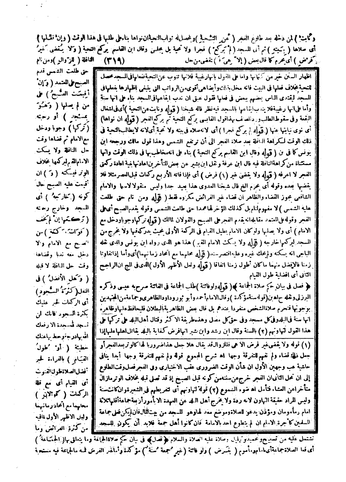 (قَوْلُهُ وَقَالَ ابْنُ الْقَاسِمِ يَرْكَعُ التَّحِيَّةَ) بِنَاءً عَلَى أَنَّهُ مُخَاطَبٌ بِهَا فِي ذَلِكَ الْوَقْتِ وَأَنَّهَا مُسْتَثْنَاةٌ مِنْ كَرَاهَةِ النَّافِلَةِ فِيهِ قَالَ ابْنُ عَرَفَةَ وَنَقْلُ ابْنِ بَشِيرٍ عَنْ بَعْضِ الْمُتَأَخِّرِينَ إعَادَتَهَا بِنِيَّةِ إعَادَةِ رَكْعَتَيْ الْفَجْرِ لَا أَعْرِفُهُ.