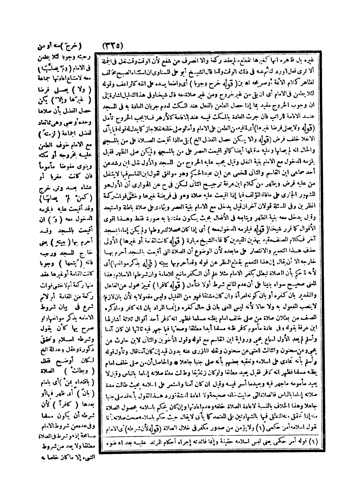(خَرَجَ) مِنْهُ أَوْ مِنْ رَحْبَتِهِ وُجُوبًا لِئَلَّا يَطْعَنَ فِي الْإِمَامِ (وَلَمْ يُصَلِّهَا) مَعَهُ لِامْتِنَاعِ إعَادَتِهَا جَمَاعَةً (وَلَا) يُصَلِّي فَرْضًا (غَيْرَهَا وَإِلَّا) يَكُنْ حَصَلَ الْفَضْلُ بِأَنْ صَلَّاهَا وَحْدَهُ أَوْ بِصَبِيٍّ وَهِيَ مِمَّا تُعَادُ لِفَضْلِ الْجَمَاعَةِ (لَزِمَتْهُ) مَعَ الْإِمَامِ خَوْفَ الطَّعْنِ عَلَيْهِ بِخُرُوجِهِ أَوْ مُكْثه وَيَنْوِي مُفَوِّضًا مَأْمُومًا.