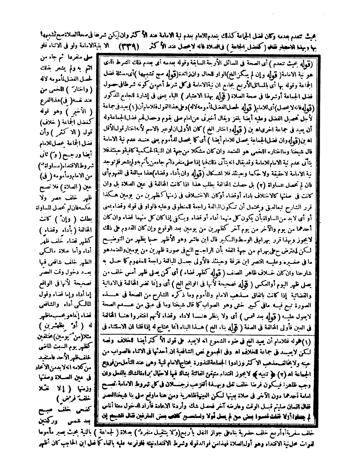 بِحَيْثُ تَنْعَدِمُ بِعَدَمِهِ وَكَانَ فَضْلُ الْجَمَاعَةِ كَذَلِكَ يَنْعَدِمُ لِلْإِمَامِ بِعَدَمِ نِيَّةِ الْإِمَامَةِ عِنْدَ الْأَكْثَرِ وَإِنْ لَمْ يَكُنْ شَرْطًا فِي صِحَّةِ الصَّلَاةِ صَحَّ تَشْبِيهُهَا بِهَا وَبِهَذَا الِاعْتِبَارِ فَقَالَ (كَفَضْلِ الْجَمَاعَةِ) فِي الصَّلَاةِ فَإِنَّهُ لَا يَحْصُلُ عِنْدَ الْأَكْثَرِ إلَّا بِنِيَّةِ الْإِمَامَةِ وَلَوْ فِي الْأَثْنَاءِ فَلَوْ صَلَّى مُنْفَرِدًا ثُمَّ جَاءَ مَنْ ائْتَمَّ بِهِ وَلَمْ يَشْعُرْ بِذَلِكَ لَحَصَلَ الْفَضْلُ لِمَأْمُومِهِ لَا لَهُ (وَاخْتَارَ) اللَّخْمِيُّ مِنْ عِنْدِ نَفْسِهِ (فِي) هَذَا الْفَرْعِ (الْأَخِيرِ) وَهُوَ قَوْلُهُ كَفَضْلِ الْجَمَاعَةِ (خِلَافُ) قَوْلِ (الْأَكْثَرِ) وَأَنَّ فَضْلَ الْجَمَاعَةِ يَحْصُلُ لِلْإِمَامِ أَيْضًا وَرَجَّحَ