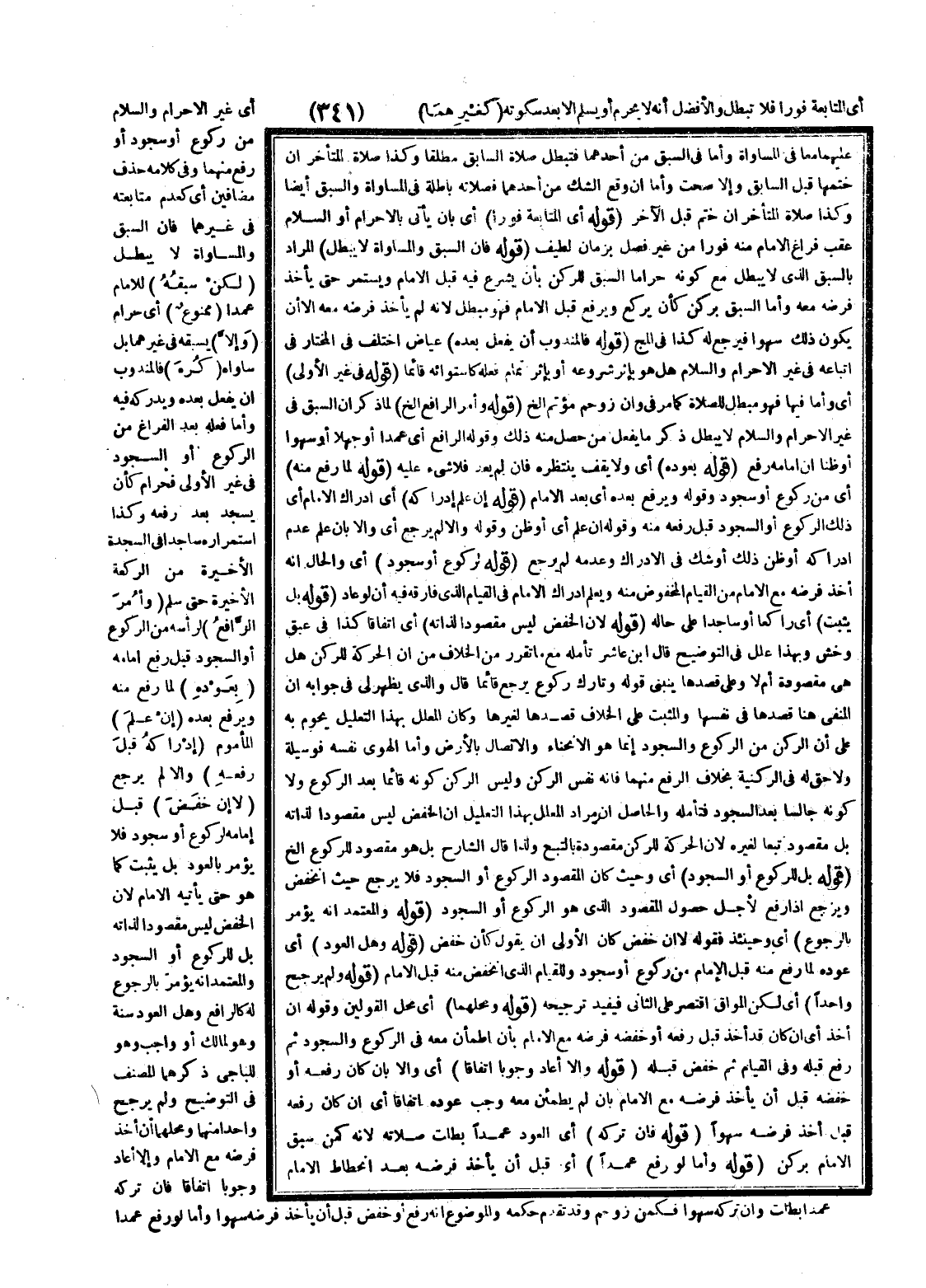 أَيْ الْمُتَابَعَةُ فَوْرًا فَلَا تَبْطُلُ وَالْأَفْضَلُ أَنْ لَا يُحْرِمَ أَوْ يُسَلِّمَ إلَّا بَعْدَ سُكُوتِهِ (كَغَيْرِهِمَا) أَيْ غَيْرِ الْإِحْرَامِ وَالسَّلَامِ مِنْ رُكُوعٍ أَوْ سُجُودٍ أَوْ رَفْعٍ مِنْهُمَا فِي كَلَامِهِ حَذْفُ مُضَافَيْنِ أَيْ كَعَدَمِ مُتَابَعَتِهِ فِي غَيْرِهِمَا فَإِنَّ السَّبْقَ وَالْمُسَاوَاةَ لَا يَبْطُلُ (لَكِنْ سَبْقُهُ) لِلْإِمَامِ عَمْدًا (مَمْنُوعٌ) أَيْ حَرَامٌ (وَإِلَّا) يَسْبِقُهُ فِي غَيْرِهِمَا بَلْ سَاوَاهُ (كُرِهَ) فَالْمَنْدُوبُ أَنْ يَفْعَلَ بَعْدَهُ وَيُدْرِكَهُ فِيهِ وَأَمَّا فِعْلُهُ بَعْدَ الْفَرَاغِ مِنْ الرُّكُوعِ أَوْ السُّجُودِ فِي غَيْرِ الْأُولَى فَحَرَامٌ كَأَنْ يَسْجُدَ بَعْدَ رَفْعِهِ وَكَذَا اسْتِمْرَارُهُ سَاجِدًا فِي السَّجْدَةِ الْأَخِيرَةِ مِنْ الرَّكْعَةِ الْأَخِيرَةِ حَتَّى سَلَّمَ.