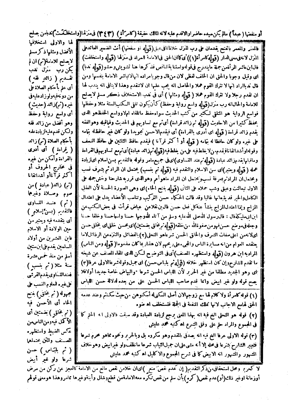 أَوْ مَنْفَعَتِهَا (عَبْدًا) مَا لَمْ يَكُنْ سَيِّدُهُ حَاضِرًا وَإِلَّا قُدِّمَ عَلَيْهِ لِأَنَّهُ الْمَالِكُ حَقِيقَةً (كَامْرَأَةٍ) فِي مَنْزِلِهَا (وَاسْتَخْلَفَتْ) نَدْبًا مَنْ يَصْلُحُ لَهَا وَالْأَوْلَى اسْتِخْلَافُهَا الْأَفْضَلَ وَمِثْلُهَا ذَكَرٌ مُسْلِمٌ لَا يَصِحُّ لِلْإِمَامَةِ (ثُمَّ) إنْ لَمْ يَكُنْ رَبَّ مَنْزِلٍ نُدِبَ تَقْدِيمُ (زَائِدِ فِقْهٍ) أَيْ عِلْمٍ بِأَحْكَامِ الصَّلَاةِ عَلَى مَنْ دُونَهُ فِيهِ وَلَوْ زَادَ عَلَيْهِ فِي غَيْرِهِ (ثُمَّ) زَائِدِ (حَدِيثٍ) أَيْ وَاسِعِ رِوَايَةٍ وَحِفْظٍ وَهُوَ أَفْضَلُ مِنْ زَائِدِ فِقْهٍ وَلَكِنْ قُدِّمَ عَلَيْهِ لِزِيَادَةِ عِلْمِهِ بِأَحْكَامِ الصَّلَاةِ.
