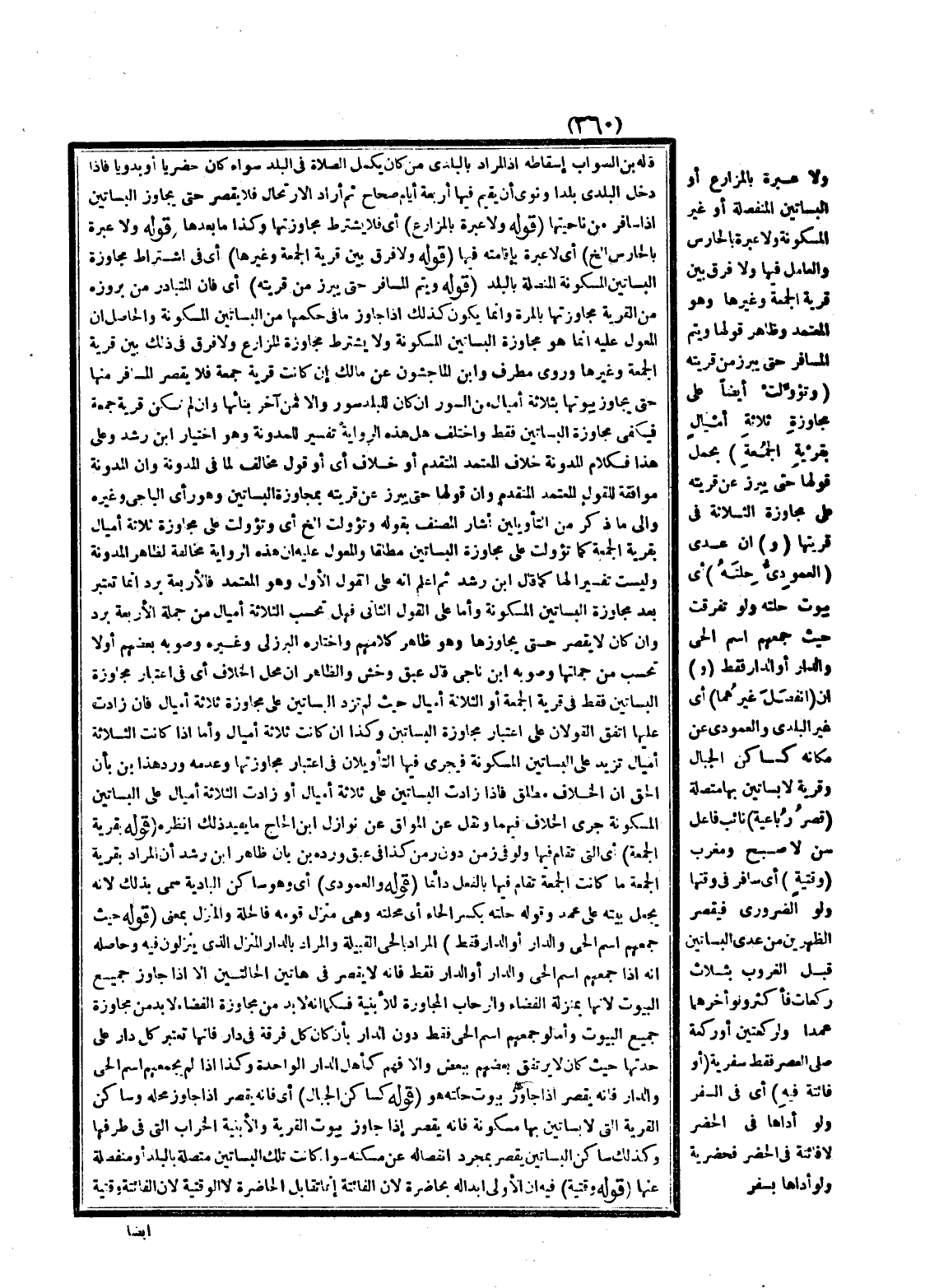 (قَوْلُهُ وَلَا فَرْقَ بَيْنَ قَرْيَةِ الْجُمُعَةِ وَغَيْرِهَا) أَيْ فِي اشْتِرَاطِ مُجَاوَزَةِ الْبَسَاتِينِ الْمَسْكُونَةِ الْمُتَّصِلَةِ بِالْبَلَدِ.
