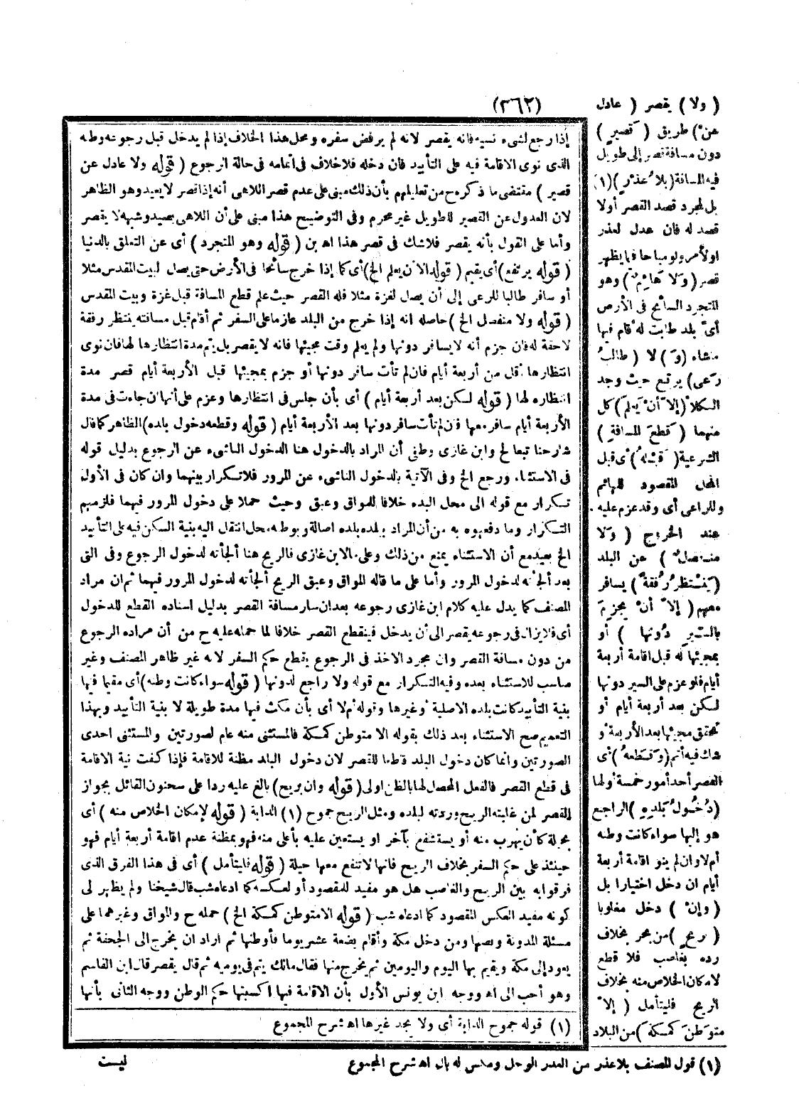 (وَلَا) يَقْصُرُ (عَادِلٌ عَنْ) طَرِيقٍ (قَصِيرٍ) دُونَ مَسَافَةِ قَصْرٍ إلَى طَوِيلٍ فِيهِ الْمَسَافَةُ (بِلَا عُذْرٍ) بَلْ لِمُجَرَّدِ قَصْدِ الْقَصْرِ أَوْ لَا قَصْدَ لَهُ فَإِنْ عَدَلَ لِعُذْرٍ أَوْ لِأَمْرٍ وَلَوْ مُبَاحًا فِيمَا يَظْهَرُ قَصَرَ (وَلَا هَائِمٌ) وَهُوَ الْمُتَجَرِّدُ السَّائِحُ فِي الْأَرْضِ أَيُّ بَلَدٍ طَابَتْ لَهُ أَقَامَ فِيهَا مَا شَاءَ (وَ) لَا (طَالِبُ رَعْيٍ) يَرْتَعُ حَيْثُ وَجَدَ الْكَلَأَ (إلَّا أَنْ يَعْلَمَ) كُلٌّ مِنْهُمَا (قَطْعَ الْمَسَافَةِ) الشَّرْعِيَّةِ (قَبْلَهُ) أَيْ قَبْلَ الْمَحَلِّ الْمَقْصُودِ لِلْهَائِمِ وَلِلرَّاعِي أَيْ وَقَدْ عَزَمَ عَلَيْهِ عِنْدَ الْخُرُوجِ (وَلَا مُنْفَصِلٌ) عَنْ الْبَلَدِ (يَنْتَظِرُ رُفْقَةً) يُسَافِرُ مَعَهُمْ (إلَّا أَنْ يَجْزِمَ بِالسَّيْرِ دُونَهَا) أَوْ بِمَجِيئِهَا لَهُ قَبْلَ إقَامَةِ أَرْبَعَةِ أَيَّامٍ فَلَوْ عَزَمَ عَلَى السَّيْرِ دُونَهَا لَكِنْ بَعْدَ أَرْبَعَةِ أَيَّامٍ أَوْ تَحَقَّقَ مَجِيئَهَا بَعْدَ الْأَرْبَعَةِ أَوْ شَكَّ فِيهِ أَتَمَّ.