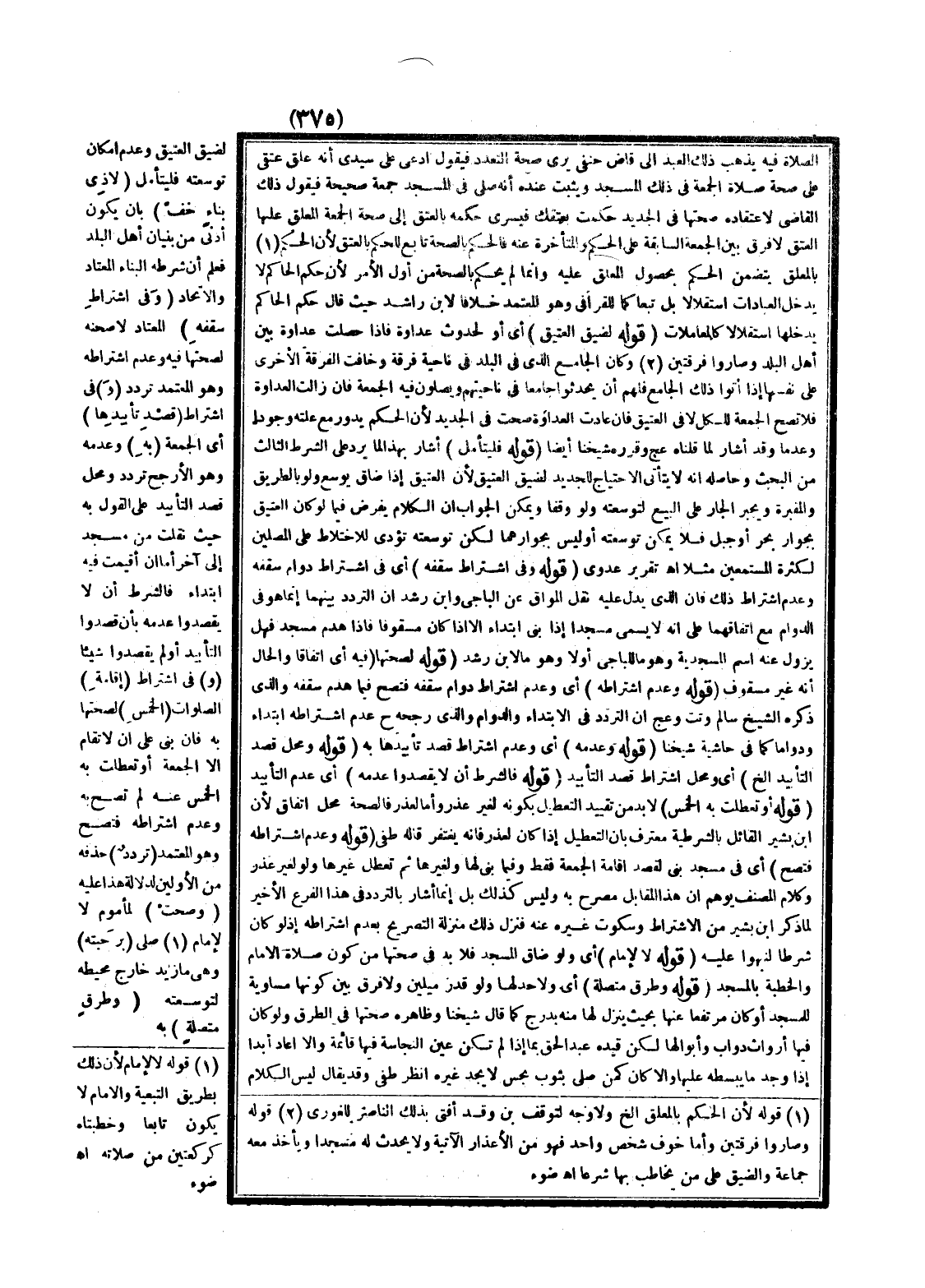 ـــــــــــــــــــــــــــــQالصَّلَاةِ فِيهِ يَذْهَبُ ذَلِكَ الْعَبْدُ إلَى قَاضٍ حَنَفِيٍّ يَرَى صِحَّةَ التَّعَدُّدِ فَيَقُولُ ادَّعَى عَلَيَّ سَيِّدِي أَنَّهُ عَلَّقَ عِتْقِي عَلَى صِحَّةِ صَلَاةِ الْجُمُعَةِ فِي ذَلِكَ الْمَسْجِدِ وَيُثْبِتُ عِنْدَهُ أَنَّهُ صَلَّى فِي الْمَسْجِدِ جُمُعَةً صَحِيحَةً فَيَقُولُ ذَلِكَ الْقَاضِي لِاعْتِقَادِهِ صِحَّتَهَا فِي الْجَدِيدِ حَكَمْتُ بِعِتْقِكَ فَيَسْرِي حُكْمُهُ بِالْعِتْقِ إلَى صِحَّةِ الْجُمُعَةِ الْمُعَلَّقِ عَلَيْهَا الْعِتْقُ لَا فَرْقَ بَيْنَ الْجُمُعَةِ السَّابِقَةِ عَلَى الْحُكْمِ وَالْمُتَأَخِّرَةِ عَنْهُ فَالْحُكْمُ بِالصِّحَّةِ تَابِعٌ لِلْحُكْمِ بِالْعِتْقِ لِأَنَّ الْحُكْمَ بِالْمُعَلَّقِ يَتَضَمَّنُ الْحُكْمَ بِحُصُولِ الْمُعَلَّقِ عَلَيْهِ وَإِنَّمَا لَمْ يُحْكَمْ بِالصِّحَّةِ مِنْ أَوَّلِ الْأَمْرِ لِأَنَّ حُكْمَ الْحَاكِمِ لَا يَدْخُلُ الْعِبَادَاتِ اسْتِقْلَالًا بَلْ تَبَعًا كَمَا لِلْقَرَافِيِّ وَهُوَ الْمُعْتَمَدُ خِلَافًا لِابْنِ رَاشِدٍ حَيْثُ قَالَ حُكْمُ الْحَاكِمِ يَدْخُلُهَا اسْتِقْلَالًا كَالْمُعَامَلَاتِ (قَوْلُهُ لِضِيقِ الْعَتِيقِ) أَيْ أَوْ لِحُدُوثِ عَدَاوَةٍ فَإِذَا حَصَلَتْ عَدَاوَةٌ بَيْنَ أَهْلِ الْبَلَدِ وَصَارُوا فِرْقَتَيْنِ وَكَانَ الْجَامِعُ الَّذِي فِي الْبَلَدِ فِي نَاحِيَةِ فِرْقَةٍ وَخَافَتْ الْفِرْقَةُ الْأُخْرَى عَلَى نَفْسِهَا إذَا أَتَوْا ذَلِكَ الْجَامِعَ فَلَهُمْ أَنْ يُحْدِثُوا جَامِعًا فِي نَاحِيَتِهِمْ وَيُصَلُّونَ فِيهِ الْجُمُعَةَ فَإِنْ زَالَتْ الْعَدَاوَةُ فَلَا تَصِحُّ الْجُمُعَةُ لِلْكُلِّ لَا فِي الْعَتِيقِ فَإِنْ عَادَتْ الْعَدَاوَةُ صَحَّتْ فِي الْجَدِيدِ لِأَنَّ الْحُكْمَ يَدُورُ مَعَ عِلَّتِهِ وُجُودًا وَعَدَمًا وَقَدْ أَشَارَ لِمَا قُلْنَاهُ عج وَقَرَّرَ شَيْخُنَا أَيْضًا (قَوْلُهُ فَلْيُتَأَمَّلْ) أَشَارَ بِهَذَا لِمَا يَرِدُ عَلَى الشَّرْطِ الثَّالِثِ مِنْ الْبَحْثِ وَحَاصِلُهُ أَنَّهُ لَا يَتَأَتَّى الِاحْتِيَاجُ لِلْجَدِيدِ لِضِيقِ الْعَتِيقِ لِأَنَّ الْعَتِيقَ إذَا ضَاقَ يُوَسَّعُ وَلَوْ بِالطَّرِيقِ وَالْمَقْبَرَةِ وَيُجْبَرُ الْجَارُ عَلَى الْبَيْعِ لِتَوَسُّعَتِهِ وَلَوْ وَقْفًا وَيُمْكِنُ الْجَوَابُ أَنَّ الْكَلَامَ يُفْرَضُ فِيمَا لَوْ كَانَ الْعَتِيقُ بِجِوَارِ بَحْرٍ أَوْ جَبَلٍ فَلَا يُمْكِنُ تَوْسِعَتُهُ أَوْ لَيْسَ بِجِوَارِهِمَا لَكِنَّ تَوْسِعَتَهُ تُؤَدِّي لِلِاخْتِلَاطِ عَلَى الْمُصَلِّينَ لِكَثْرَةِ الْمُسْتَمِعِينَ مَثَلًا اهـ تَقْرِيرُ عَدَوِيٍّ (قَوْلُهُ وَفِي اشْتِرَاطِ سَقْفِهِ) أَيْ فِي اشْتِرَاطِ دَوَامِ سَقْفِهِ وَعَدَمِ اشْتِرَاطِ ذَلِكَ فَإِنَّ الَّذِي يَدُلُّ عَلَيْهِ نَقْلُ الْمَوَّاقِ عَنْ الْبَاجِيَّ وَابْنِ رُشْدٍ أَنَّ التَّرَدُّدَ بَيْنَهُمَا إنَّمَا هُوَ فِي الدَّوَامِ مَعَ اتِّفَاقِهِمَا عَلَى أَنَّهُ لَا يُسَمَّى مَسْجِدًا إذَا بُنِيَ ابْتِدَاءً إلَّا إذَا كَانَ مَسْقُوفًا فَإِذَا هُدِمَ مَسْجِدٌ فَهَلْ يَزُولُ عَنْهُ اسْمُ الْمَسْجِدِيَّةِ وَهُوَ مَا لِلْبَاجِيِّ أَوَّلًا وَهُوَ مَا لِابْنِ رُشْدٍ (قَوْلُهُ لِصِحَّتِهَا فِيهِ) أَيْ اتِّفَاقًا وَالْحَالُ أَنَّهُ غَيْرُ مَسْقُوفٍ (قَوْلُهُ وَعَدَمُ اشْتِرَاطِهِ) أَيْ وَعَدَمُ اشْتِرَاطِ دَوَامِ سَقْفِهِ فَتَصِحُّ فِيمَا هُدِمَ سَقْفُهُ وَاَلَّذِي ذَكَرَهُ الشَّيْخُ سَالِمٌ وتت وعج أَنَّ التَّرَدُّدَ فِي الِابْتِدَاءِ وَالدَّوَامِ وَاَلَّذِي رَجَّحَهُ ح عَدَمُ اشْتِرَاطِهِ ابْتِدَاءً وَدَوَامًا كَمَا فِي حَاشِيَةِ شَيْخِنَا (قَوْلُهُ وَعَدَمِهِ) أَيْ وَعَدَمُ اشْتِرَاطِ قَصْدِ تَأْبِيدِهَا بِهِ (قَوْلُهُ وَمَحَلُّ قَصْدِ التَ