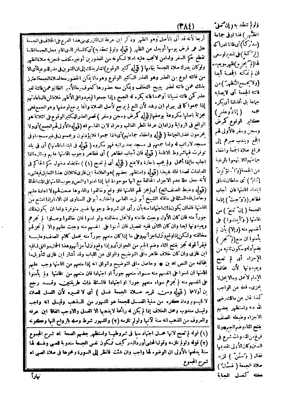 وَحَاصِلُ فِقْهِ الْمَسْأَلَةِ عَلَى مَا قَالَهُ الشَّيْخُ أَبُو زَيْدٍ الْفَاسِيُّ وَاخْتَارَهُ أَبُو عَلِيٍّ الْمِسْنَاوِيُّ أَنَّ الْإِمَامَ إذَا امْتَنَعَ مِنْ إقَامَتِهَا فَإِمَّا أَنْ يَكُونَ ذَلِكَ اجْتِهَادًا مِنْهُ بِأَنْ رَأَى أَنَّ شُرُوطَ وُجُوبِهَا غَيْرُ مُتَوَفِّرَةٍ، وَإِمَّا أَنْ يَكُونَ ذَلِكَ جَوْرًا مِنْهُ، فَإِنْ كَانَ الْأَوَّلُ وَجَبَتْ طَاعَتُهُ وَلَا تَحِلُّ مُخَالَفَتُهُ وَلَوْ أَمِنُوا فَإِنْ خَالَفُوا وَصَلَّوْا لَمْ تُجْزِئْهُمْ وَيُعِيدُونَهَا أَبَدًا، وَإِنْ كَانَ الثَّانِي فَفِيهِ تَفْصِيلٌ فَإِنْ أَمِنُوا عَلَى أَنْفُسِهِمْ مِنْهُ وَجَبَتْ عَلَيْهِمْ وَإِلَّا لَمْ تَجُزْ لَهُمْ مُخَالَفَتُهُ وَلَكِنْ إذَا وَقَعَ وَنَزَلَ أَجْزَأَتْهُمْ وَعَلَى مَا إذَا كَانَ مَنَعَهُمْ جَوْرًا مِنْهُ يُحْمَلُ كَلَامُ الْمُصَنِّفِ وَعَلَيْهِ فَيُقْرَأُ قَوْلُهُ تَجُزْ بِفَتْحِ التَّاءِ وَضَمِّ الْجِيمِ مِنْ الْجَوَازِ أَيْ وَإِذَا وَقَعَ وَنَزَلَ أَجْزَأَتْهُمْ وَهَذَا الْحَمْلُ مُوَافِقٌ لِمَا فِيهِ ابْنُ غَازِيٍّ وَإِنْ كَانَ خِلَافُ ظَاهِرِ مَا فِي التَّوْضِيحِ وَالْمَوَّاقِ عَنْ اللُّبَابِ وَقَدْ أَشَارَ ابْنُ غَازِيٍّ لِتَأْوِيلِ مَا يُخَالِفُهُ مِنْ النَّصِّ اهـ بْن
