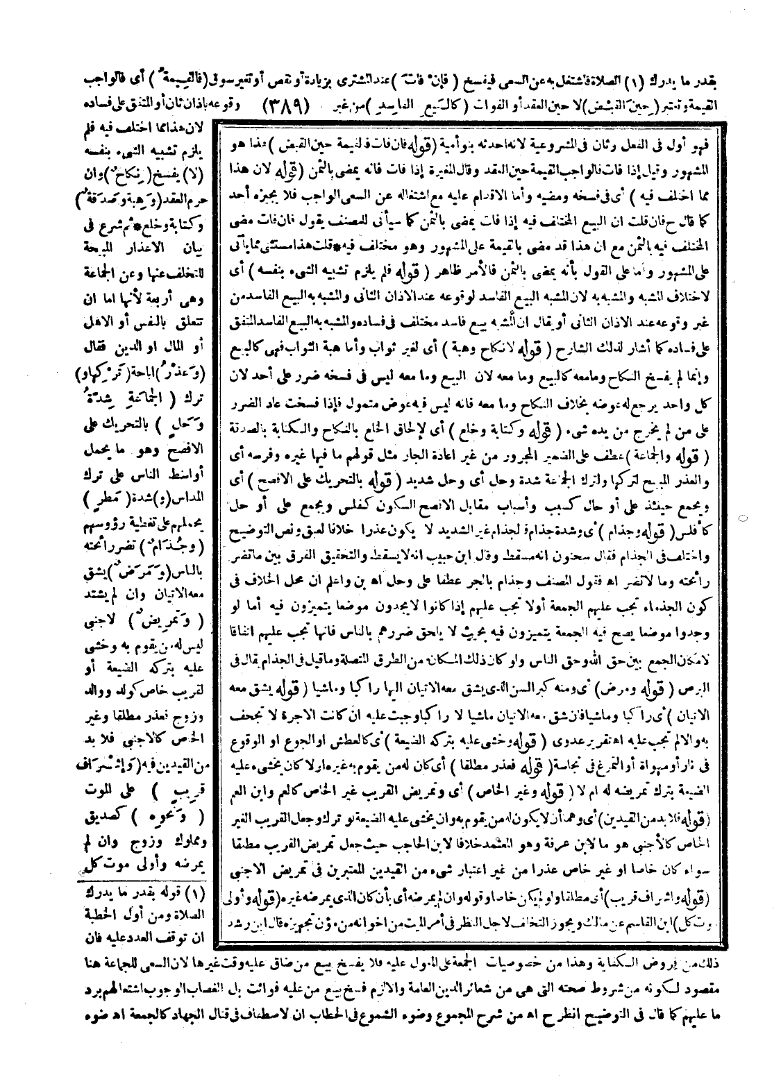 بِقَدْرِ مَا يُدْرِكُ الصَّلَاةَ فَاشْتُغِلَ بِهِ عَنْ السَّعْيِ فَيُفْسَخُ (فَإِنْ فَاتَ) عِنْدَ الْمُشْتَرِي بِزِيَادَةٍ أَوْ نَقْصٍ أَوْ تَغَيُّرِ سُوقٍ (فَالْقِيمَةُ) أَيْ فَالْوَاجِبُ الْقِيمَةُ وَتُعْتَبَرُ (حِينَ الْقَبْضِ) لَا حِينَ الْعَقْدِ أَوْ الْفَوَاتِ (كَالْبَيْعِ الْفَاسِدِ) مِنْ غَيْرِ وُقُوعِهِ بِأَذَانٍ ثَانٍ أَوْ الْمُتَّفِقِ عَلَى فَسَادِهِ لِأَنَّ هَذَا مِمَّا اُخْتُلِفَ فِيهِ فَلَمْ يَلْزَمْ تَشْبِيهُ الشَّيْءِ بِنَفْسِهِ (لَا) يُفْسَخُ (نِكَاحٌ) وَإِنْ حُرِّمَ الْعَقْدُ (وَهِبَةٌ وَصَدَقَةٌ) وَكِتَابَةٌ وَخُلْعٌ