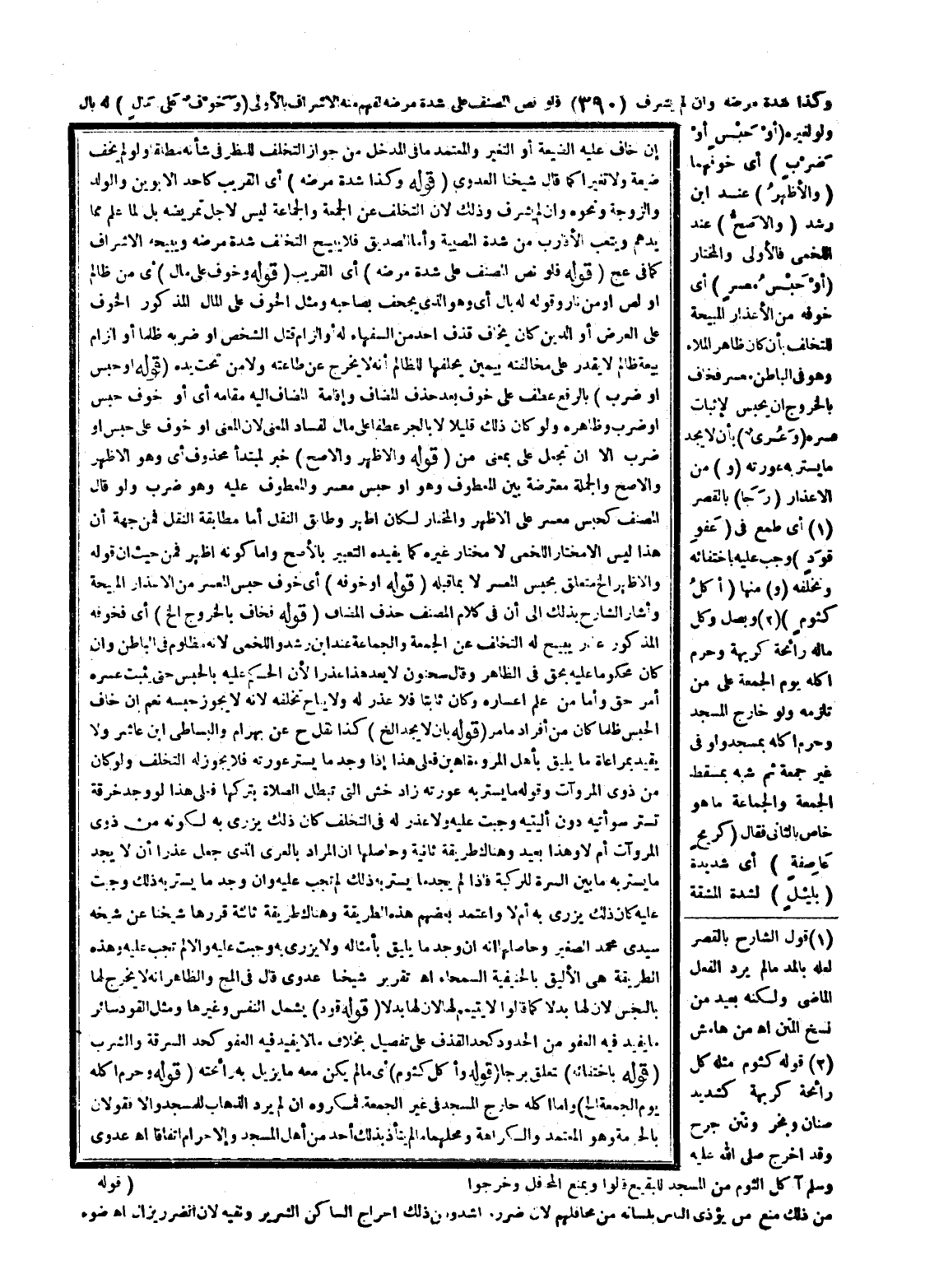 ـــــــــــــــــــــــــــــQإنْ خَافَ عَلَيْهِ الضَّيْعَةَ أَوْ التَّغَيُّرَ وَالْمُعْتَمَدُ مَا فِي الْمَدْخَلِ مِنْ جَوَازِ التَّخَلُّفِ لِلنَّظَرِ فِي شَأْنِهِ مُطْلَقًا وَلَوْ لَمْ يَخَفْ ضَيْعَةً وَلَا تَغَيُّرًا كَمَا قَالَ شَيْخُنَا الْعَدَوِيُّ (قَوْلُهُ وَكَذَا شِدَّةُ مَرَضِهِ) أَيْ الْقَرِيبِ كَأَحَدِ الْأَبَوَيْنِ وَالْوَلَدِ وَالزَّوْجَةِ وَنَحْوِهِ وَإِنْ لَمْ يُشْرِفْ وَذَلِكَ لِأَنَّ التَّخَلُّفَ عَنْ الْجُمُعَةِ وَالْجَمَاعَةِ لَيْسَ لِأَجْلِ تَمْرِيضِهِ بَلْ لِمَا عُلِمَ مِمَّا يَدْهَمُ وَيُتْعِبُ الْأَقَارِبَ مِنْ شِدَّةِ الْمُصِيبَةِ، وَأَمَّا الصَّدِيقُ فَلَا يُبِيحُ التَّخَلُّفَ شِدَّةُ مَرَضِهِ وَيُبِيحُهُ الْإِشْرَافُ كَمَا فِي عج (قَوْلُهُ فَلَوْ نَصَّ الْمُصَنِّفُ عَلَى شِدَّةِ مَرَضِهِ) أَيْ الْقَرِيبِ