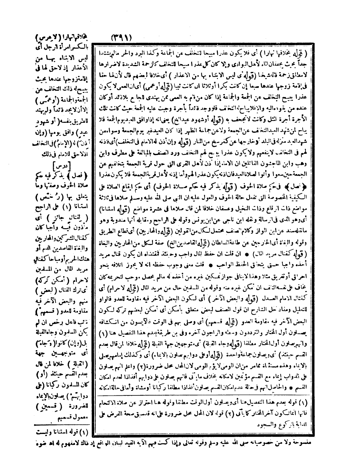 [دَرْسٌ] فَصْلٌ يَذْكُرُ فِيهِ حُكْمَ صَلَاةِ الْخَوْفِ وَصِفَتِهَا وَمَا يَتَعَلَّقُ بِهَا (رُخِّصَ) اسْتِنَانًا عَلَى الرَّاجِحِ (لِقِتَالٍ جَائِزٍ) أَيْ مَأْذُونٍ فِيهِ وَاجِبًا كَانَ كَقِتَالِ الْمُشْرِكِينَ وَالْمُحَارِبِينَ وَالْبُغَاةِ الْقَاصِدِينَ الدَّمَ أَوْ هَتْكَ الْحَرِيمِ، أَوْ مُبَاحًا كَقِتَالِ مُرِيدِ الْمَالِ مِنْ الْمُسْلِمِينَ لَا حَرَامٍ (أَمْكَنَ تَرْكُهُ) أَيْ تَرْكُ الْقِتَالِ (لِبَعْضٍ) مِنْهُمْ وَالْبَعْضُ الْآخَرُ فِيهِ مُقَاوَمَةٌ لِلْعَدُوِّ (قَسْمُهُمْ) نَائِبُ فَاعِلِ رُخِّصَ إنْ لَمْ يَكُنْ الْمُسْلِمُونَ وِجَاهَ الْقِبْلَةِ بَلْ (وَإِنْ) كَانُوا (وِجَاهَ) أَيْ مُتَوَجِّهِينَ جِهَةَ (الْقِبْلَةِ) خِلَافًا لِمَنْ قَالَ بِعَدَمِ الْقَسْمِ حِينَئِذٍ (أَوْ) كَانَ الْمُسْلِمُونَ رُكْبَانًا (عَلَى دَوَابِّهِمْ) يُصَلُّونَ بِالْإِيمَاءِ لِلضَّرُورَةِ (قِسْمَيْنِ) مَعْمُولُ قَسْمِهِمْ