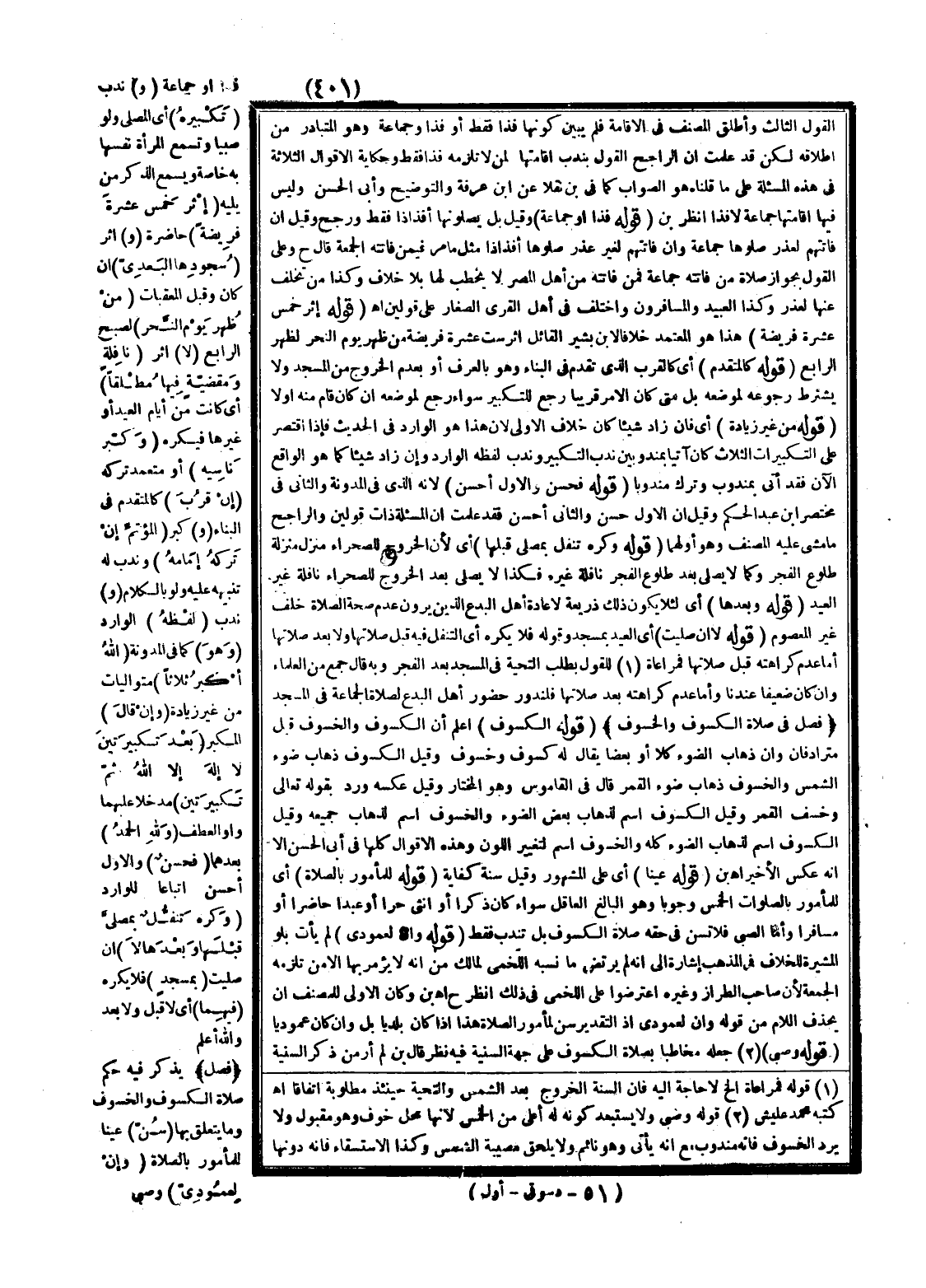 (فَصْلٌ فِي صَلَاةِ الْكُسُوفِ وَالْخُسُوفِ) (قَوْلُهُ الْكُسُوفُ) اعْلَمْ أَنَّ الْكُسُوفَ وَالْخُسُوفَ قِيلَ مُتَرَادِفَانِ وَأَنَّ ذَهَابَ الضَّوْءِ كُلًّا أَوْ بَعْضًا يُقَالُ لَهُ كُسُوفٌ وَخُسُوفٌ، وَقِيلَ الْكُسُوفُ ذَهَابُ ضَوْءِ الشَّمْسِ وَالْخُسُوفُ ذَهَابُ ضَوْءِ الْقَمَرِ قَالَ فِي الْقَامُوسِ وَهُوَ الْمُخْتَارُ وَقِيلَ عَكْسُهُ وَرُدَّ بِقَوْلِهِ تَعَالَى {وَخَسَفَ الْقَمَرُ} [القيامة: 8] وَقِيلَ الْكُسُوفُ اسْمٌ لِذَهَابِ بَعْضِ الضَّوْءِ وَالْخُسُوفُ اسْمٌ لِذَهَابِ جَمِيعِهِ وَقِيلَ الْكُسُوفُ اسْمٌ لِذَهَابِ الضَّوْءِ كُلِّهِ وَالْخُسُوفُ اسْمٌ لِتَغْيِيرِ اللَّوْنِ وَهَذِهِ الْأَقْوَالُ كُلُّهَا فِي أَبِي الْحَسَنِ إلَّا أَنَّهُ عَكَسَ الْأَخِيرَ اهـ بْن (قَوْلُهُ عَيْنًا) أَيْ عَلَى الْمَشْهُورِ وَقِيلَ سُنَّةُ كِفَايَةٍ (قَوْلُهُ لِلْمَأْمُورِ بِالصَّلَاةِ) أَيْ لِلْمَأْمُورِ بِالصَّلَوَاتِ الْخَمْسِ وُجُوبًا وَهُوَ الْبَالِغُ الْعَاقِلُ سَوَاءٌ كَانَ ذَكَرًا أَوْ أُنْثَى حُرًّا أَوْ عَبْدًا حَاضِرًا أَوْ مُسَافِرًا، وَأَمَّا الصَّبِيُّ فَلَا تُسَنُّ فِي حَقِّهِ صَلَاةُ الْكُسُوفِ بَلْ تُنْدَبُ فَقَطْ (قَوْلُهُ وَإِنْ لِعَمُودِيٍّ) لَمْ يَأْتِ بِلَوْ الْمُشِيرَةِ لِلْخِلَافِ فِي الْمَذْهَبِ إشَارَةً إلَى أَنَّهُ لَمْ يَرْتَضِ مَا نَسَبَهُ اللَّخْمِيُّ لِمَالِكٍ مِنْ أَنَّهُ لَا يُؤْمَرُ بِهَا إلَّا مَنْ تَلْزَمُهُ الْجُمُعَةُ لِأَنَّ صَاحِبَ الطِّرَازِ وَغَيْرَهُ اعْتَرَضُوا عَلَى اللَّخْمِيِّ فِي ذَلِكَ اُنْظُرْ ح اهـ بْن وَكَانَ الْأَوْلَى لِلْمُصَنِّفِ أَنْ يَحْذِفَ اللَّامَ مِنْ قَوْلِهِ وَإِنْ لِعَمُودِيٍّ إذَا التَّقْدِيرُ سُنَّ لِمَأْمُورِ الصَّلَاةِ، هَذَا إذَا كَانَ بَلَدِيًّا بَلْ وَإِنْ كَانَ عَمُودِيًّا (قَوْلُهُ وَصَبِيٍّ) جَعْلُهُ مُخَاطَبًا بِصَلَاةِ الْكُسُوفِ عَلَى جِهَةِ السُّنِّيَّةِ فِيهِ نَظَرٌ قَالَ بْن لَمْ أَرَ مَنْ ذَكَرَ السُّنِّيَّةَ