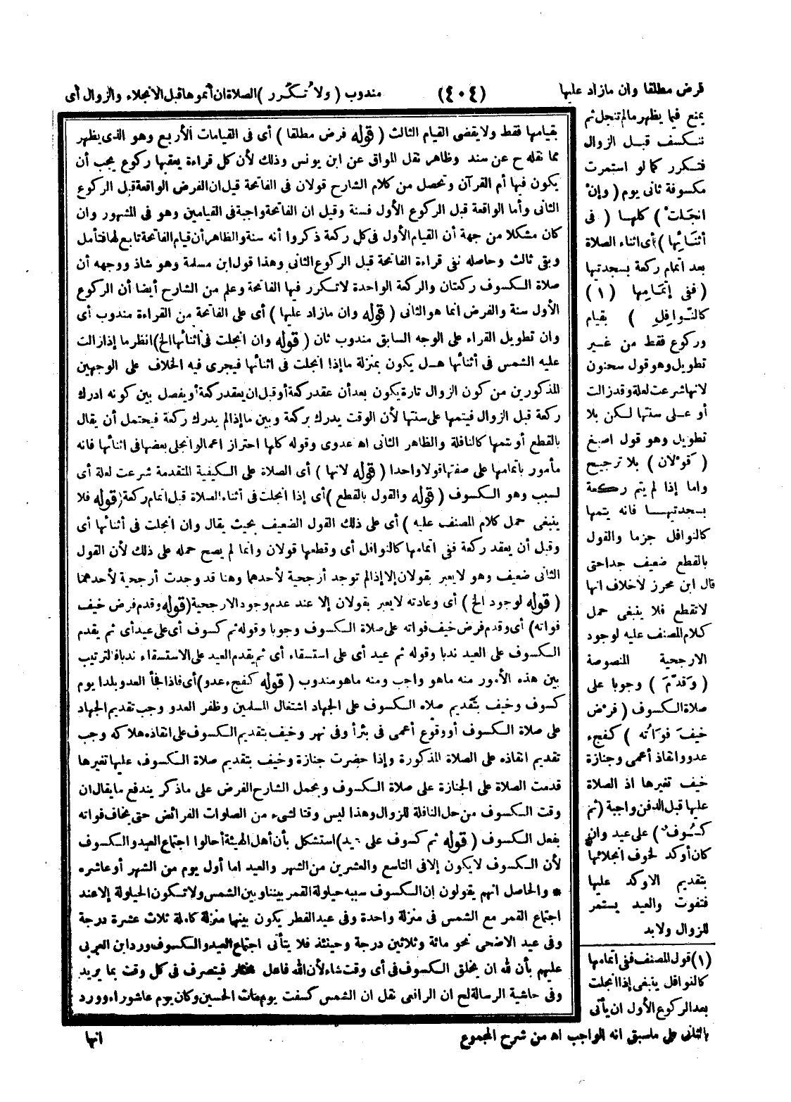 ـــــــــــــــــــــــــــــQبِقِيَامِهَا فَقَطْ وَلَا يَقْضِي الْقِيَامَ الثَّالِثَ (قَوْلُهُ فَرْضٌ مُطْلَقًا) أَيْ فِي الْقِيَامَاتِ الْأَرْبَعِ وَهُوَ الَّذِي يَظْهَرُ مِمَّا نَقَلَهُ عَنْ سَنَدٍ وَظَاهِرُ نَقْلِ الْمَوَّاقِ عَنْ ابْنِ يُونُسَ وَذَلِكَ لِأَنَّ كُلَّ قِرَاءَةٍ يَعْقُبُهَا رُكُوعٌ يَجِبُ أَنْ يَكُونَ فِيهَا أُمُّ الْقُرْآنِ، وَتَحَصَّلَ مِنْ كَلَامِ الشَّارِحِ قَوْلَانِ فِي الْفَاتِحَةِ؛ قِيلَ إنَّ الْفَرْضَ الْوَاقِعَةُ قَبْلَ الرُّكُوعِ الثَّانِي وَأَمَّا الْوَاقِعَةُ قَبْلَ الرُّكُوعِ الْأَوَّلِ فَسُنَّةٌ، وَقِيلَ إنَّ الْفَاتِحَةَ وَاجِبَةٌ فِي الْقِيَامَيْنِ وَهُوَ فِي الْمَشْهُورِ وَإِنْ كَانَ مُشْكِلًا مِنْ جِهَةِ أَنَّ الْقِيَامَ الْأَوَّلَ فِي كُلِّ رَكْعَةٍ ذَكَرُوا أَنَّهُ سُنَّةٌ وَالظَّاهِرُ أَنَّ قِيَامَ الْفَاتِحَةِ تَابِعٌ لَهَا فَتَأَمَّلْ، وَبَقِيَ ثَالِثٌ وَحَاصِلُهُ نَفْيُ قِرَاءَةِ الْفَاتِحَةِ قَبْلَ الرُّكُوعِ الثَّانِي وَهَذَا قَوْلُ ابْنِ مَسْلَمَةَ وَهُوَ شَاذٌّ وَوَجْهُهُ أَنَّ صَلَاةَ الْكُسُوفِ رَكْعَتَانِ وَالرَّكْعَةُ الْوَاحِدَةُ لَا تُكَرَّرُ فِيهَا الْفَاتِحَةُ، وَعُلِمَ مِنْ الشَّارِحِ أَيْضًا أَنَّ الرُّكُوعَ الْأَوَّلَ سُنَّةٌ وَالْفَرْضُ إنَّمَا هُوَ الثَّانِي (قَوْلُهُ وَأَنَّ مَا زَادَ عَلَيْهَا) أَيْ عَلَى الْفَاتِحَةِ مِنْ قِرَاءَةِ مَنْدُوبٍ أَيْ وَأَنَّ تَطْوِيلَ الْقِرَاءَةِ عَلَى الْوَجْهِ السَّابِقِ مَنْدُوبٌ ثَانٍ