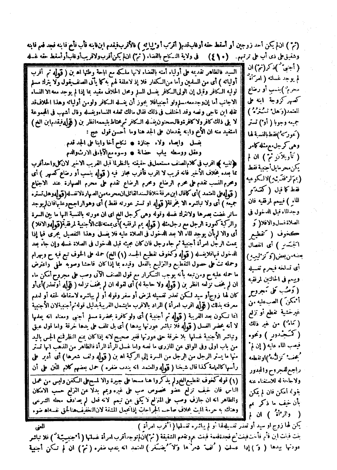 (ثُمَّ) إنْ لَمْ يَكُنْ أَحَدُ زَوْجَيْنِ أَوْ أَسْقَطَ حَقُّهُ أَوْ غَابَ قُدِّمَ (أَقْرَبُ أَوْلِيَائِهِ) فَالْأَقْرَبُ فَيُقَدَّمُ ابْنٌ فَابْنُهُ فَأَبٌ فَأَخٌ فَابْنُهُ فَجَدٌّ فَعَمٌّ فَابْنُهُ وَشَقِيقٌ عَلَى ذِي أَبٍ عَلَى تَرَتُّبِهِمْ فِي وِلَايَةِ النِّكَاحِ بِالْقَضَاءِ (ثُمَّ) إنْ لَمْ يَكُنْ أَقْرَبُ وَلَا قَرِيبٌ أَوْ غَابَ أَوْ أَسْقَطَ حَقَّهُ غَسَّلَهُ (أَجْنَبِيٌّ) ذَكَرٌ (ثُمَّ) إنْ لَمْ يُوجَدْ غَسَّلَتْهُ (امْرَأَةٌ مَحْرَمُ) بِنَسَبٍ أَوْ رَضَاعٍ كَصِهْرٍ كَزَوْجَةِ ابْنِهِ عَلَى الْمُعْتَمَدِ (وَهَلْ تَسْتُرُهُ) جَمِيعَهُ وُجُوبًا (أَوْ) تَسْتُرُ (عَوْرَتَهُ) فَقَطْ بِالنِّسْبَةِ لَهَا وَهِيَ كَرَجُلٍ مَعَ مِثْلِهِ كَمَا مَرَّ (تَأْوِيلَانِ) .