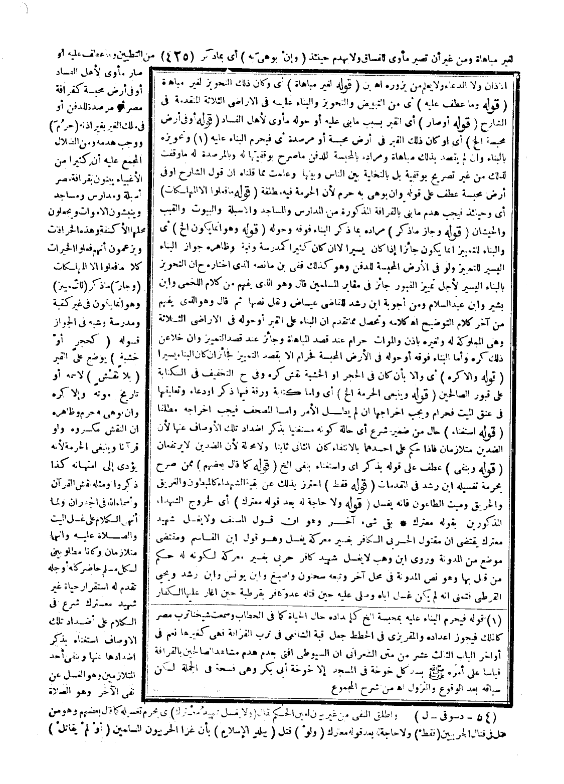 ـــــــــــــــــــــــــــــQالْأَذَانَ وَلَا الدُّعَاءَ وَلَا يَعْلَمُ مَنْ يَزُورُهُ» اهـ بْن (قَوْلُهُ لِغَيْرِ مُبَاهَاةٍ) أَيْ وَكَانَ التَّحْوِيزُ لِغَيْرِ مُبَاهَاةٍ (قَوْلُهُ وَمَا عُطِفَ عَلَيْهِ) أَيْ مِنْ التَّبْيِيضِ وَالتَّحْوِيزِ وَالْبِنَاءِ عَلَيْهِ فِي الْأَرْضِي الثَّلَاثَةِ الْمُتَقَدِّمَةِ فِي الشَّارِحِ (قَوْلُهُ أَوْ صَارَ) أَيْ الْقَبْرُ بِسَبَبِ مَا بُنِيَ عَلَيْهِ أَوْ حَوْلَهُ مَأْوًى لِأَهْلِ الْفَسَادِ (قَوْلُهُ أَوْ فِي أَرْضٍ مُحْبَسَةٍ إلَخْ) أَيْ أَوْ كَانَ ذَلِكَ الْقَبْرُ فِي أَرْضٍ مُحْبَسَةٍ أَوْ مُرْصَدَةٍ أَيْ فَيَحْرُمُ الْبِنَاءُ عَلَيْهِ وَتَحْوِيزُهُ بِالْبِنَاءِ وَإِنْ لَمْ يَقْصِدْ بِذَلِكَ مُبَاهَاةً، وَمُرَادُهُ بِالْمُحْبَسَةِ لِلدَّفْنِ مَا صُرِّحَ بِوَقْفِيَّتِهَا لَهُ وَبِالْمُرْصَدَةِ لَهُ مَا وُقِفَتْ لِذَلِكَ مِنْ غَيْرِ تَصْرِيحٍ بِوَقْفِيَّةٍ بَلْ بِالتَّخْلِيَةِ بَيْنَ النَّاسِ وَبَيْنَهَا وَعَلِمْت مِمَّا قُلْنَاهُ أَنَّ قَوْلَ الشَّارِحِ أَوْ فِي أَرْضٍ مُحْبَسَةٍ عَطْفٌ عَلَى قَوْلِهِ وَإِنْ بُوهِيَ بِهِ حُرِّمَ لِأَنَّ الْحُرْمَةَ فِيهِ مُطْلَقَةٌ (قَوْلُهُ مَا فَعَلُوا إلَّا الْمُهْلِكَاتِ) أَيْ وَحِينَئِذٍ فَيَجِبُ هَدْمُ مَا بُنِيَ بِالْقَرَافَةِ الْمَذْكُورَةِ مِنْ الْمَدَارِسِ وَالْمَسَاجِدِ وَالْأَسْبِلَةِ وَالْبُيُوتِ وَالْقُبَبِ وَالْحَيْشَانِ (قَوْلُهُ وَجَازَ مَا ذَكَرَ) مُرَادُهُ بِمَا ذَكَرَ الْبِنَاءُ فَوْقَهُ وَحَوْلَهُ (قَوْلُهُ وَهُوَ إنَّمَا يَكُونُ إلَخْ) أَيْ وَالْبِنَاءُ لِلتَّمْيِيزِ إنَّمَا جَائِزًا إذَا كَانَ يَسِيرًا لَا إنْ كَانَ كَثِيرًا كَمَدْرَسَةٍ وَقُبَّةٍ، وَظَاهِرُهُ جَوَازُ الْبِنَاءِ الْيَسِيرِ لِلتَّمَيُّزِ وَلَوْ فِي الْأَرْضِ الْمُحْبَسَةِ لِلدَّفْنِ وَهُوَ كَذَلِكَ فَفِي بْن مَا نَصُّهُ الَّذِي اخْتَارَهُ ح أَنَّ التَّحْوِيزَ بِالْبِنَاءِ الْيَسِيرِ لِأَجْلِ تَمْيِيزِ الْقُبُورِ جَائِزٌ فِي مَقَابِرِ الْمُسْلِمِينَ قَالَ وَهُوَ الَّذِي يُفْهَمُ مِنْ كَلَامِ اللَّخْمِيِّ وَابْنِ بَشِيرٍ وَابْنِ عَبْدِ السَّلَامِ وَمِنْ أَجْوِبَةِ ابْنِ رُشْدٍ لِلْقَاضِي عِيَاضٍ وَنَقَلَ نَصَّهَا ثُمَّ قَالَ وَهُوَ الَّذِي يُفْهَمُ مِنْ آخِرِ كَلَامِ التَّوْضِيحِ اهـ كَلَامُهُ وَتَحَصَّلَ مِمَّا تَقَدَّمَ الْبِنَاءُ عَلَى الْقَبْرِ أَوْ حَوْلَهُ فِي الْأَرَاضِي الثَّلَاثَةِ وَهِيَ الْمَمْلُوكَةُ لَهُ وَلِغَيْرِهِ بِإِذْنٍ وَالْمَوَاتِ حَرَامٌ عِنْدَ قَصْدِ الْمُبَاهَاةِ وَجَائِزٌ عِنْدَ قَصْدِ التَّمْيِيزِ وَإِنْ خَلَا عَنْ ذَلِكَ كُرِهَ، وَأَمَّا الْبِنَاءُ فَوْقَهُ أَوْ حَوْلَهُ فِي الْأَرْضِ الْمُحْبَسَةِ فَحَرَامٌ إلَّا بِقَصْدِ التَّمْيِيزِ فَجَائِزٌ إنْ كَانَ الْبِنَاءُ يَسِيرًا (قَوْلُهُ وَإِلَّا كُرِهَ) أَيْ وَإِلَّا بِأَنْ كَانَ فِي الْحَجَرِ أَوْ الْخَشَبَةِ نَقْشٌ كُرِهَ وَفِي ح التَّخْفِيفُ فِي الْكِتَابَةِ عَلَى قُبُورِ الصَّالِحِينَ (قَوْلُهُ وَيَنْبَغِي الْحُرْمَةُ إلَخْ) أَيْ وَأَمَّا كِتَابَةُ وَرَقَةٍ ذِكْرًا وَدُعَاءً وَتَعْلِيقُهَا فِي عُنُقِ الْمَيِّتِ فَحَرَامٌ وَيَجِبُ إخْرَاجُهَا إنْ لَمْ يَطُلْ الْأَمْرُ وَأَمَّا الْمُصْحَفُ فَيَجِبُ إخْرَاجُهُ مُطْلَقًا