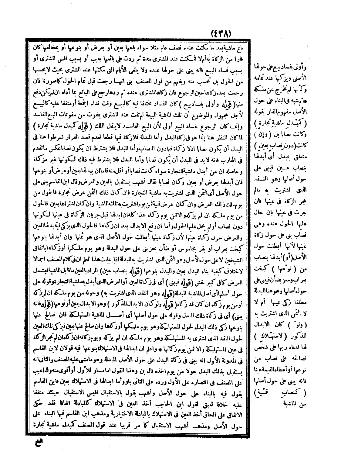 وَأَوْلَى بِفَسَادِ بَيْعٍ عَلَى حَوْلِهَا الْأَصْلِيِّ وَيُزَكِّيهَا عِنْدَ تَمَامِهِ وَكَأَنَّهَا لَمْ تَخْرُجْ عَنْ مِلْكِهِ.