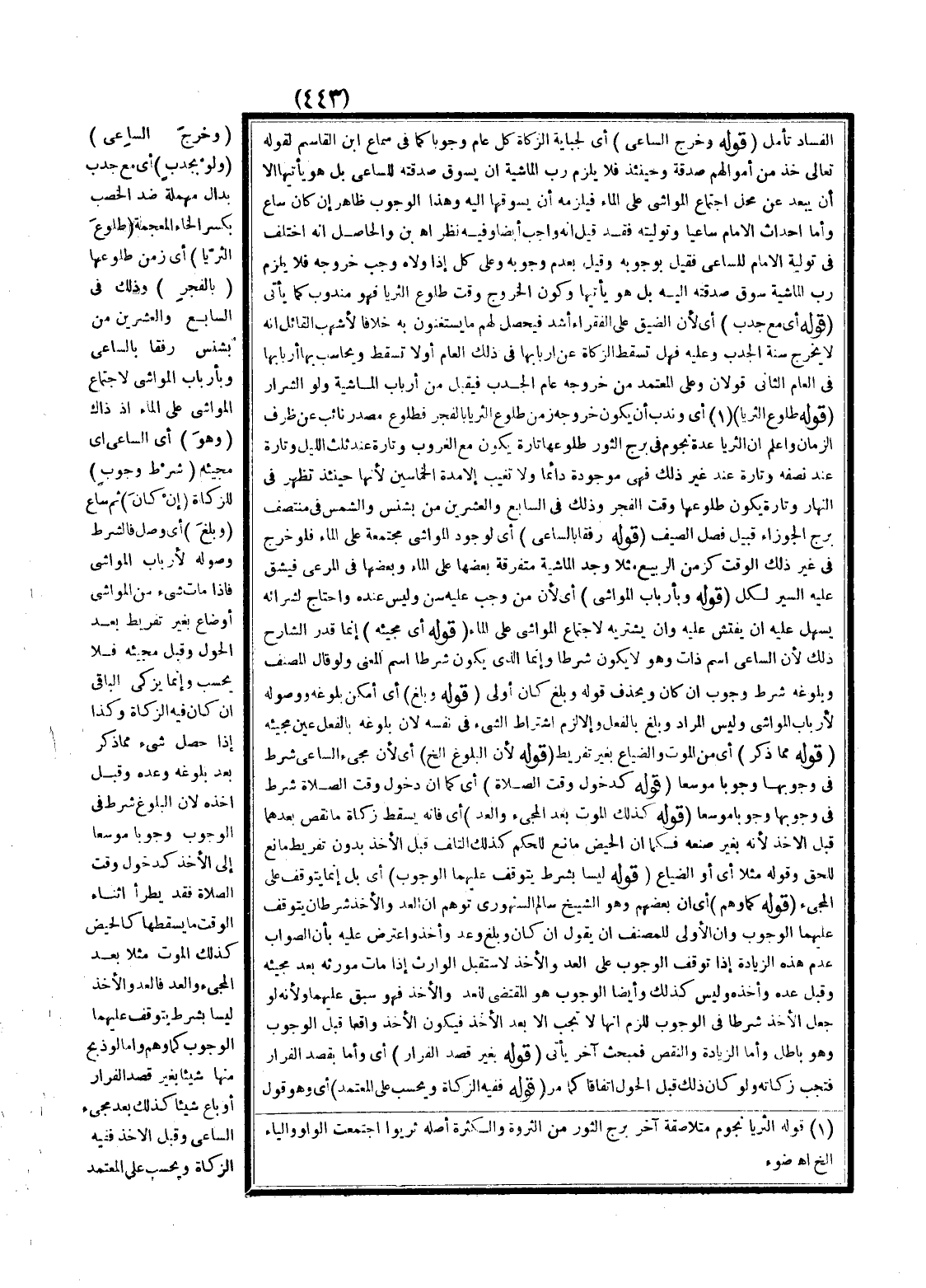 وَاعْلَمْ أَنَّ الثُّرَيَّا عِدَّةُ نُجُومٍ فِي بُرْجِ الثَّوْرِ طُلُوعُهَا تَارَةً يَكُونُ مَعَ الْغُرُوبِ وَتَارَةً عِنْدَ ثُلُثِ اللَّيْلِ وَتَارَةً عِنْدَ نِصْفِهِ وَتَارَةً عِنْدَ غَيْرِ ذَلِكَ فَهِيَ مَوْجُودَةٌ دَائِمًا وَلَا تَغِيبُ إلَّا مُدَّةَ الْخَمَاسِينِ لِأَنَّهَا حِينَئِذٍ تَظْهَرُ فِي النَّهَارِ وَتَارَةً يَكُونُ طُلُوعُهَا وَقْتَ الْفَجْرِ وَذَلِكَ فِي السَّابِعِ وَالْعِشْرِينَ مِنْ بَشَنْسَ وَالشَّمْسُ فِي مُنْتَصَفِ بُرْجِ الْجَوْزَاءِ قُبَيْلَ فَصْلِ الصَّيْفِ (قَوْلُهُ رِفْقًا بِالسَّاعِي) أَيْ لِوُجُودِ الْمَوَاشِي مُجْتَمَعَةً عَلَى الْمَاءِ فَلَوْ خَرَجَ فِي غَيْرِ ذَلِكَ الْوَقْتِ كَزَمَنِ الرَّبِيعِ مَثَلًا وَجَدَ الْمَاشِيَةَ مُتَفَرِّقَةً بَعْضُهَا عَلَى الْمَاءِ وَبَعْضُهَا فِي الْمَرْعَى فَيَشُقُّ عَلَيْهِ السَّيْرُ لِكُلٍّ (قَوْلُهُ وَبِأَرْبَابِ الْمَوَاشِي) أَيْ لِأَنَّ مَنْ وَجَبَ عَلَيْهِ سِنٌّ وَلَيْسَ عِنْدَهُ وَاحْتَاجَ لِشِرَائِهِ يَسْهُلُ عَلَيْهِ أَنْ يُفَتِّشَ عَلَيْهِ وَأَنْ يَشْتَرِيَهُ لِاجْتِمَاعِ الْمَوَاشِي عَلَى الْمَاءِ.