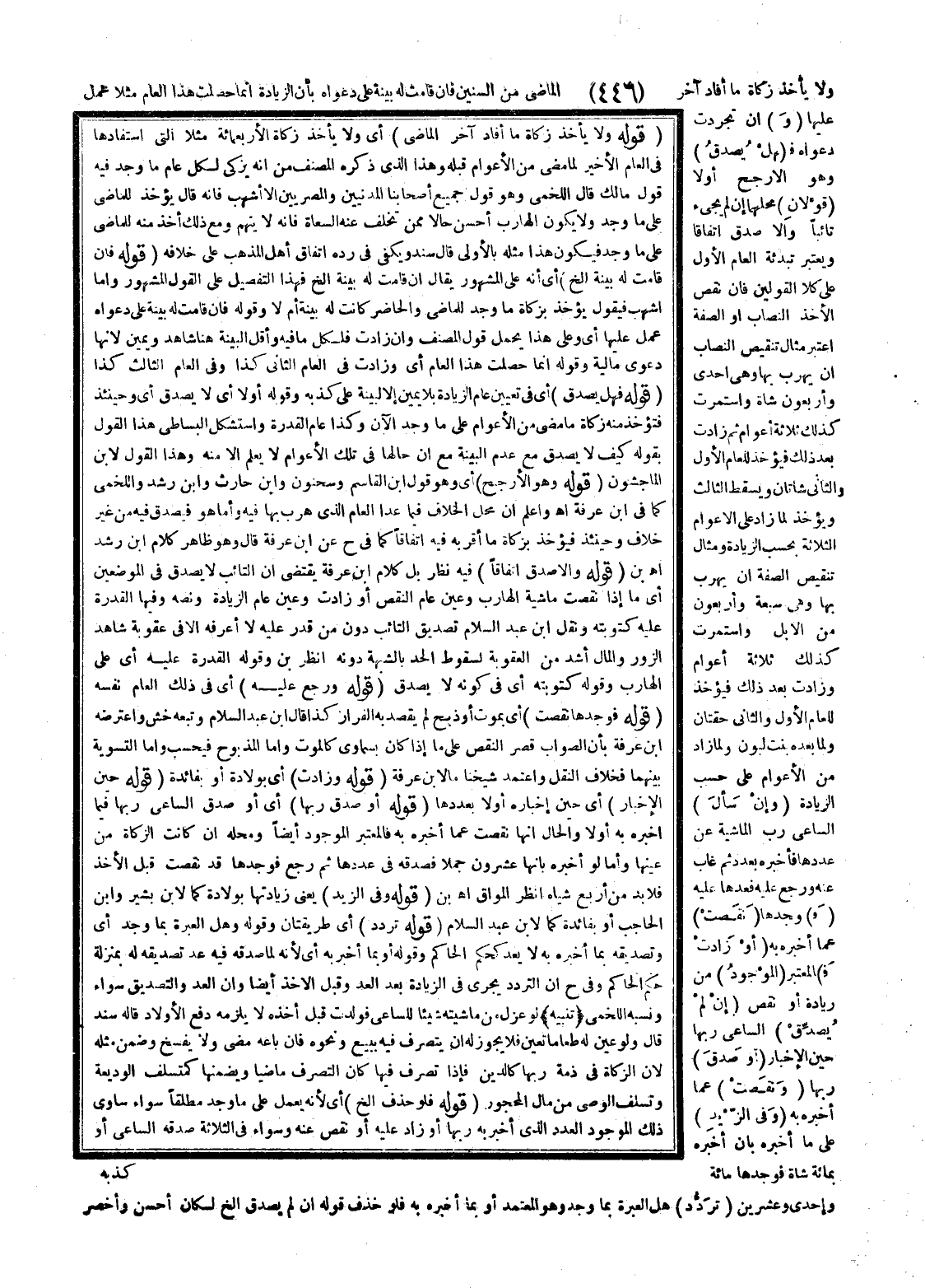 (قَوْلُهُ وَرَجَعَ عَلَيْهِ) أَيْ فِي ذَلِكَ الْعَامِ نَفْسِهِ (قَوْلُهُ فَوَجَدَهَا نَقَصَتْ) أَيْ بِمَوْتٍ أَوْ ذَبْحٍ لَمْ يَقْصِدْ بِهِ الْفِرَارَ كَذَا قَالَ ابْنُ عَبْدِ السَّلَامِ وَتَبِعَهُ خش وَاعْتَرَضَهُ ابْنُ عَرَفَةَ بِأَنَّ الصَّوَابَ قَصْرُ النَّقْصِ عَلَى مَا إذَا كَانَ بِسَمَاوِيٍّ كَالْمَوْتِ وَأَمَّا الْمَذْبُوحُ فَيُحْسَبُ وَأَمَّا التَّسْوِيَةُ بَيْنَهُمَا فَخِلَافُ النَّقْلِ، وَاعْتَمَدَ شَيْخُنَا مَا لِابْنِ عَرَفَةَ (قَوْلُهُ وَزَادَتْ) أَيْ بِوِلَادَةٍ أَوْ بِفَائِدَةٍ (قَوْلُهُ حِينَ الْإِخْبَارِ) أَيْ حِينَ إخْبَارِهِ أَوَّلًا بِعَدَدِهَا (قَوْلُهُ أَوْ صُدِّقَ رَبُّهَا) أَيْ أَوْ صَدَّقَ السَّاعِي رَبَّهَا فِيمَا أَخْبَرَهُ بِهِ أَوَّلًا وَالْحَالُ أَنَّهَا نَقَصَتْ عَمَّا أَخْبَرَهُ بِهِ فَالْمُعْتَبَرُ الْمَوْجُودُ أَيْضًا وَمَحَلُّهُ إنْ كَانَتْ الزَّكَاةُ مِنْ عَيْنِهَا وَأَمَّا لَوْ أَخْبَرَهُ بِأَنَّهَا عِشْرُونَ جَمَلًا فَصَدَّقَهُ فِي عَدَدِهَا ثُمَّ رَجَعَ فَوَجَدَهَا قَدْ نَقَصَتْ قَبْلَ الْأَخْذِ فَلَا بُدَّ مِنْ أَرْبَعِ شِيَاهٍ اُنْظُرْ الْمَوَّاقَ اهـ بْن (قَوْلُهُ وَفِي الزَّيْدِ) يَعْنِي زِيَادَتَهَا بِوِلَادَةٍ كَمَا لِابْنِ بَشِيرٍ وَابْنِ الْحَاجِبِ أَوْ بِفَائِدَةٍ كَمَا لِابْنِ عَبْدِ السَّلَامِ (قَوْلُهُ تَرَدُّدٌ) أَيْ طَرِيقَتَانِ وَقَوْلُهُ وَهَلْ الْعِبْرَةُ بِمَا وُجِدَ أَيْ وَتَصْدِيقُهُ بِمَا أَخْبَرَهُ بِهِ لَا يُعَدُّ كَحُكْمِ الْحَاكِمِ وَقَوْلُهُ أَوْ بِمَا أَخْبَرَ بِهِ أَيْ لِأَنَّهُ لَمَّا صَدَّقَهُ فِيهِ عُدَّ تَصْدِيقُهُ لَهُ بِمَنْزِلَةِ حُكْمِ الْحَاكِمِ وَفِي ح أَنَّ التَّرَدُّدَ يَجْرِي فِي الزِّيَادَةِ بَعْدَ الْعَدِّ وَقَبْلَ الْأَخْذِ أَيْضًا وَأَنَّ الْعَدَّ وَالتَّصْدِيقَ سَوَاءٌ وَنَسَبَهُ اللَّخْمِيُّ