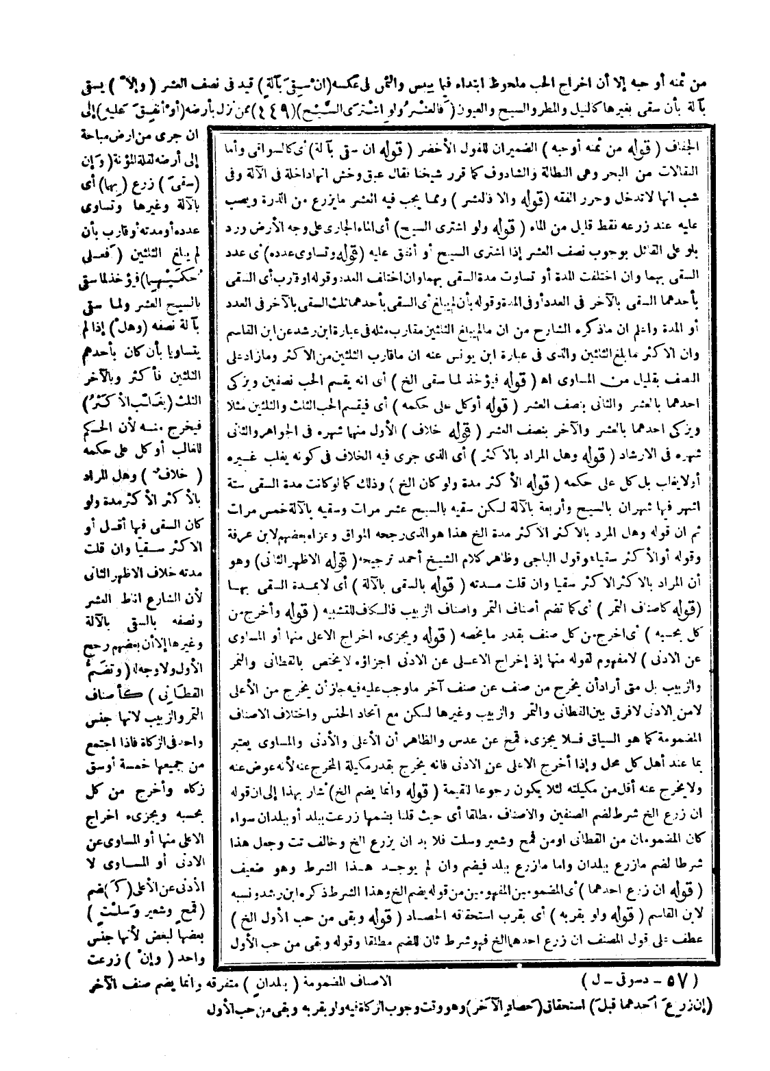 ـــــــــــــــــــــــــــــQالْجَفَافِ (قَوْلُهُ مِنْ ثَمَنِهِ أَوْ حَبِّهِ) الضَّمِيرَانِ لِلْفُولِ الْأَخْضَرِ (قَوْلُهُ إنْ سُقِيَ بِآلَةٍ) أَيْ كَالسَّوَاقِي وَأَمَّا النَّقَّالَاتُ مِنْ الْبَحْرِ وَهِيَ النَّطَّالَةُ وَالشَّادُوفُ كَمَا قَرَّرَ شَيْخُنَا فَقَالَ عبق وخش إنَّهَا دَاخِلَةٌ فِي الْآلَةِ وَفِي شب أَنَّهَا لَا تَدْخُلُ وَحَرِّرْ الْفِقْهَ (قَوْلُهُ وَإِلَّا فَالْعُشْرُ) وَمِمَّا يَجِبُ فِيهِ الْعُشْرُ مَا يُزْرَعُ مِنْ الذُّرَةِ وَيُصَبُّ عَلَيْهِ عِنْدَ زَرْعِهِ فَقَطْ قَلِيلٌ مِنْ الْمَاءِ. (قَوْلُهُ وَلَوْ اشْتَرَى السَّيْحَ) أَيْ الْمَاءَ الْجَارِيَ عَلَى وَجْهِ الْأَرْضِ وَرَدَّ بِلَوْ عَلَى الْقَائِلِ بِوُجُوبِ نِصْفِ الْعُشْرِ إذَا اشْتَرَى السَّيْحَ أَوْ أَنْفَقَ عَلَيْهِ