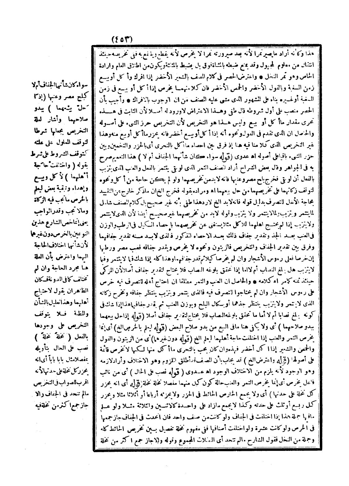 ـــــــــــــــــــــــــــــQهَذَا وَكَأَنَّهُ أَرَادَ مَا يَصِيرُ تَمْرًا لِأَنَّهُ بَعْدَ صَيْرُورَتِهِ تَمْرًا لَا يُخْرَصُ لِأَنَّهُ يُقْطَعُ وَيُنْتَفَعُ بِهِ فَفِي تَخْرِيصِهِ حِينَئِذٍ انْتِقَالٌ مِنْ مَعْلُومٍ لِمَجْهُولٍ وَقَدْ يُمْنَعُ ضَبْطُهُ بِالْمُثَنَّاةِ فَوْقُ بَلْ يُضْبَطُ بِالْمُثَلَّثَةِ وَيَكُونُ مِنْ إطْلَاقِ الْعَامِّ وَإِرَادَةِ الْخَاصِّ وَهُوَ تَمْرُ النَّخْلِ وَاعْتُرِضَ الْحَصْرُ فِي كَلَامِ الْمُصَنِّفِ بِالشَّعِيرِ الْأَخْضَرِ إذَا أَفْرَكَ وَأُكِلَ أَوْ بِيعَ زَمَنَ الْمَسْغَبَةِ وَبِالْفُولِ الْأَخْضَرِ وَالْحِمَّصِ الْأَخْضَرِ فَإِنَّ كُلًّا مِنْهُمَا يُخْرَصُ إذَا أُكِلَ أَوْ بِيعَ فِي زَمَنِ الْمَسْغَبَةِ أَوْ غَيْرِهِ بِنَاءً عَلَى الْمَشْهُورِ الَّذِي مَشَى عَلَيْهِ الْمُصَنِّفُ مِنْ أَنَّ الْوُجُوبَ بِالْإِفْرَاكِ.