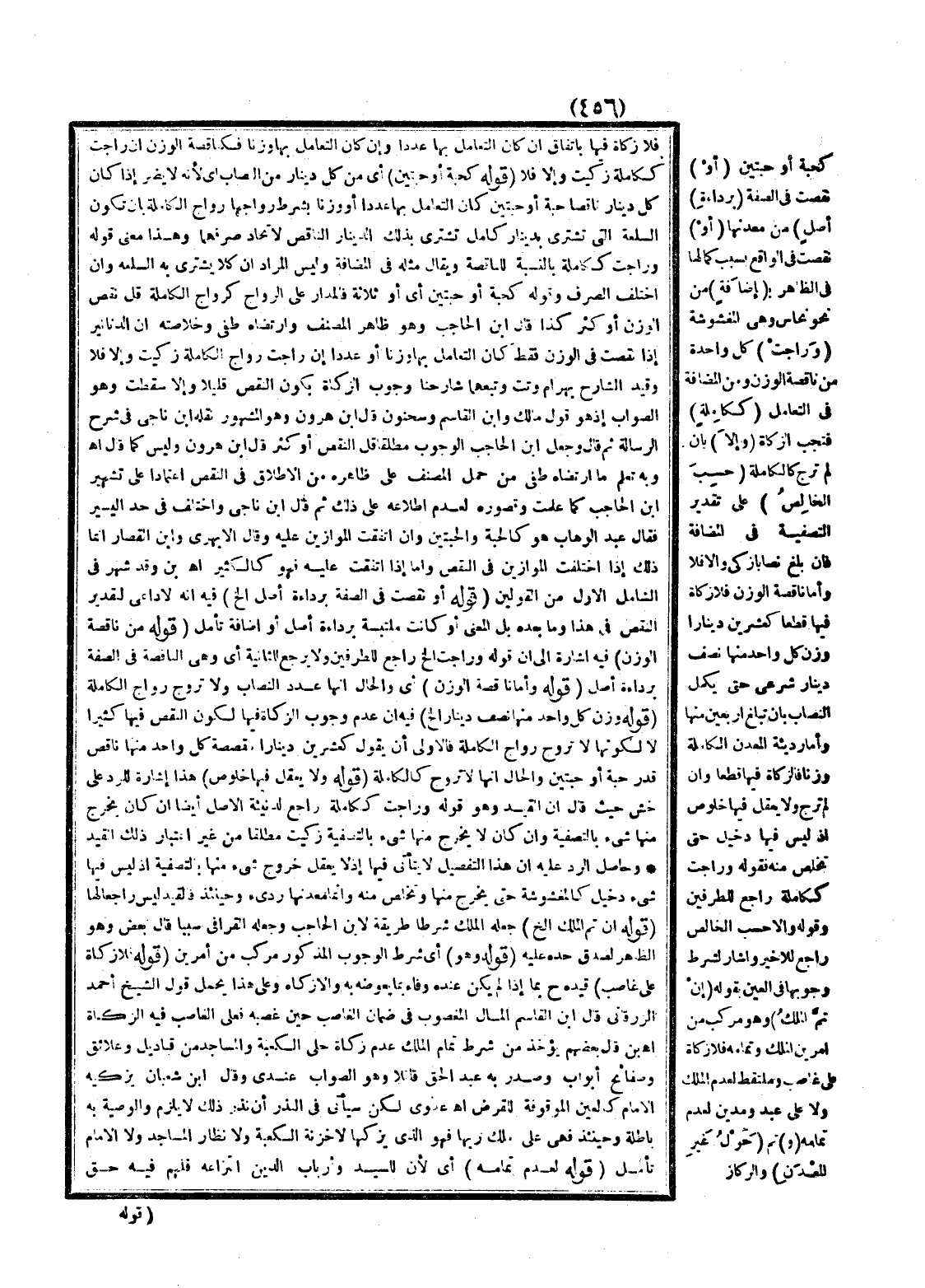 كَحَبَّةٍ أَوْ حَبَّتَيْنِ (أَوْ) نَقَصَتْ فِي الصِّفَةِ (بِرَدَاءَةِ أَصْلٍ) مِنْ مَعْدِنِهَا (أَوْ) نَقَصَتْ فِي الْوَاقِعِ بِسَبَبِ كَمَالِهَا فِي الظَّاهِرِ بِ (إضَافَةٍ) مِنْ نَحْوِ نُحَاسٍ وَهِيَ الْمَغْشُوشَةُ (وَرَاجَتْ) كُلُّ وَاحِدَةٍ مِنْ نَاقِصَةِ الْوَزْنِ وَمِنْ الْمُضَافَةِ فِي التَّعَامُلِ (كَكَامِلَةٍ) فَتَجِبُ الزَّكَاةُ (وَإِلَّا) بِأَنْ لَمْ تَرُجْ كَالْكَامِلَةِ (حُسِبَ الْخَالِصُ) عَلَى تَقْدِيرِ التَّصْفِيَةِ فِي الْمُضَافَةِ فَإِنْ بَلَغَ نِصَابًا زُكِّيَ وَإِلَّا فَلَا وَأَمَّا نَاقِصَةُ الْوَزْنِ فَلَا زَكَاةَ فِيهَا قَطْعًا كَعِشْرِينَ دِينَارًا وَزْنُ كُلِّ وَاحِدٍ مِنْهَا نِصْفُ دِينَارٍ شَرْعِيٍّ حَتَّى يَكْمُلَ النِّصَابُ بِأَنْ تَبْلُغَ أَرْبَعِينَ مِنْهَا وَأَمَّا رَدِيئَةُ الْمَعْدِنِ الْكَامِلَةِ وَزْنًا فَالزَّكَاةُ فِيهَا قَطْعًا وَإِنْ لَمْ تَرُجْ وَلَا يُعْقَلُ فِيهَا خُلُوصٌ إذْ لَيْسَ فِيهَا دَخِيلٌ حَتَّى تَخْلُصَ مِنْهُ فَقَوْلُهُ وَرَاجَتْ كَكَامِلَةٍ رَاجِعٌ لِلطَّرَفَيْنِ وَقَوْلُهُ وَإِلَّا حُسِبَ الْخَالِصُ رَاجِعٌ لِلْأَخِيرِ.