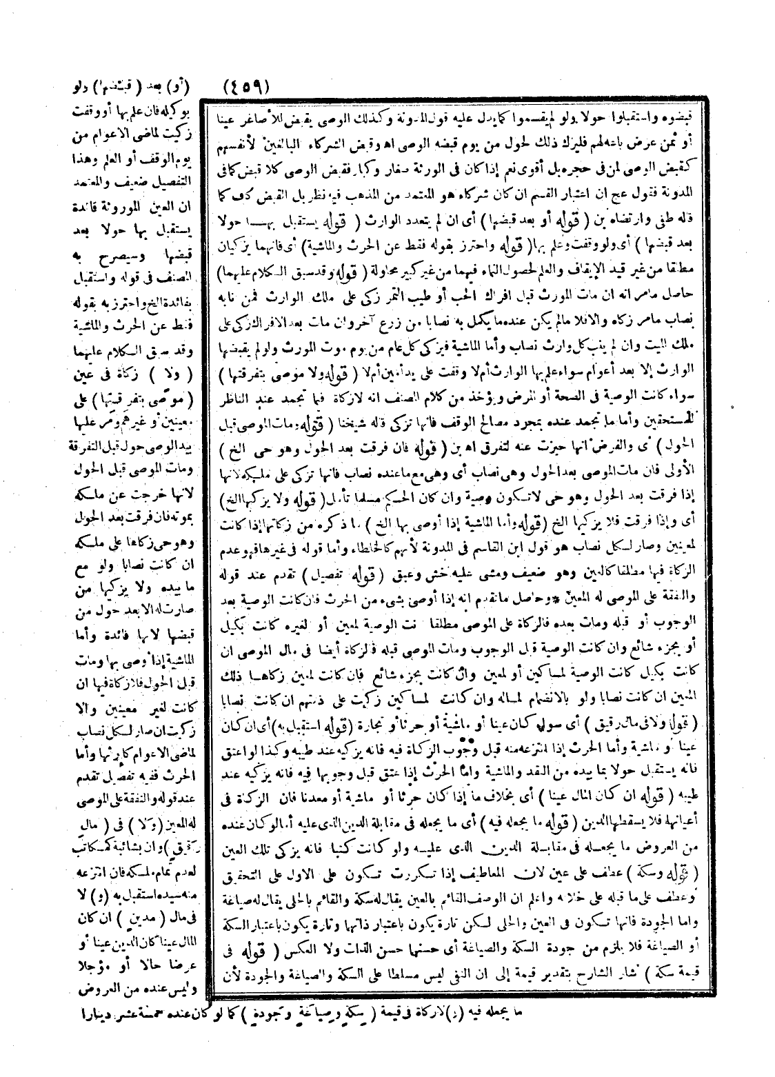 وَحَاصِلُ مَا تَقَدَّمَ أَنَّهُ إذَا أَوْصَى بِشَيْءٍ مِنْ الْحَرْثِ فَإِنْ كَانَتْ الْوَصِيَّةُ بَعْدَ الْوُجُوبِ أَوْ قَبْلَهُ وَمَاتَ بَعْدَهُ فَالزَّكَاةُ عَلَى الْمُوصِي مُطْلَقًا كَانَتْ الْوَصِيَّةُ لِمُعَيَّنٍ أَوْ لِغَيْرِهِ كَانَتْ بِكَيْلٍ أَوْ بِجُزْءٍ شَائِعٍ وَإِنْ كَانَتْ الْوَصِيَّةُ قَبْلَ الْوُجُوبِ وَمَاتَ الْمُوصِي قَبْلَهُ فَالزَّكَاةُ أَيْضًا فِي مَالِ الْمُوصِي إنْ كَانَتْ بِكَيْلٍ كَانَتْ الْوَصِيَّةُ لِمَسَاكِينَ أَوْ لِمُعَيَّنٍ وَإِنْ كَانَتْ بِجُزْءٍ شَائِعٍ فَإِنْ كَانَتْ لِمُعَيَّنٍ زَكَّاهَا ذَلِكَ الْمُعَيَّنُ إنْ كَانَتْ نِصَابًا وَلَوْ بِالِانْضِمَامِ لِمَالِهِ وَإِنْ كَانَتْ لِمَسَاكِينَ زُكِّيَتْ عَلَى ذِمَّتِهِمْ إنْ كَانَتْ نِصَابًا.