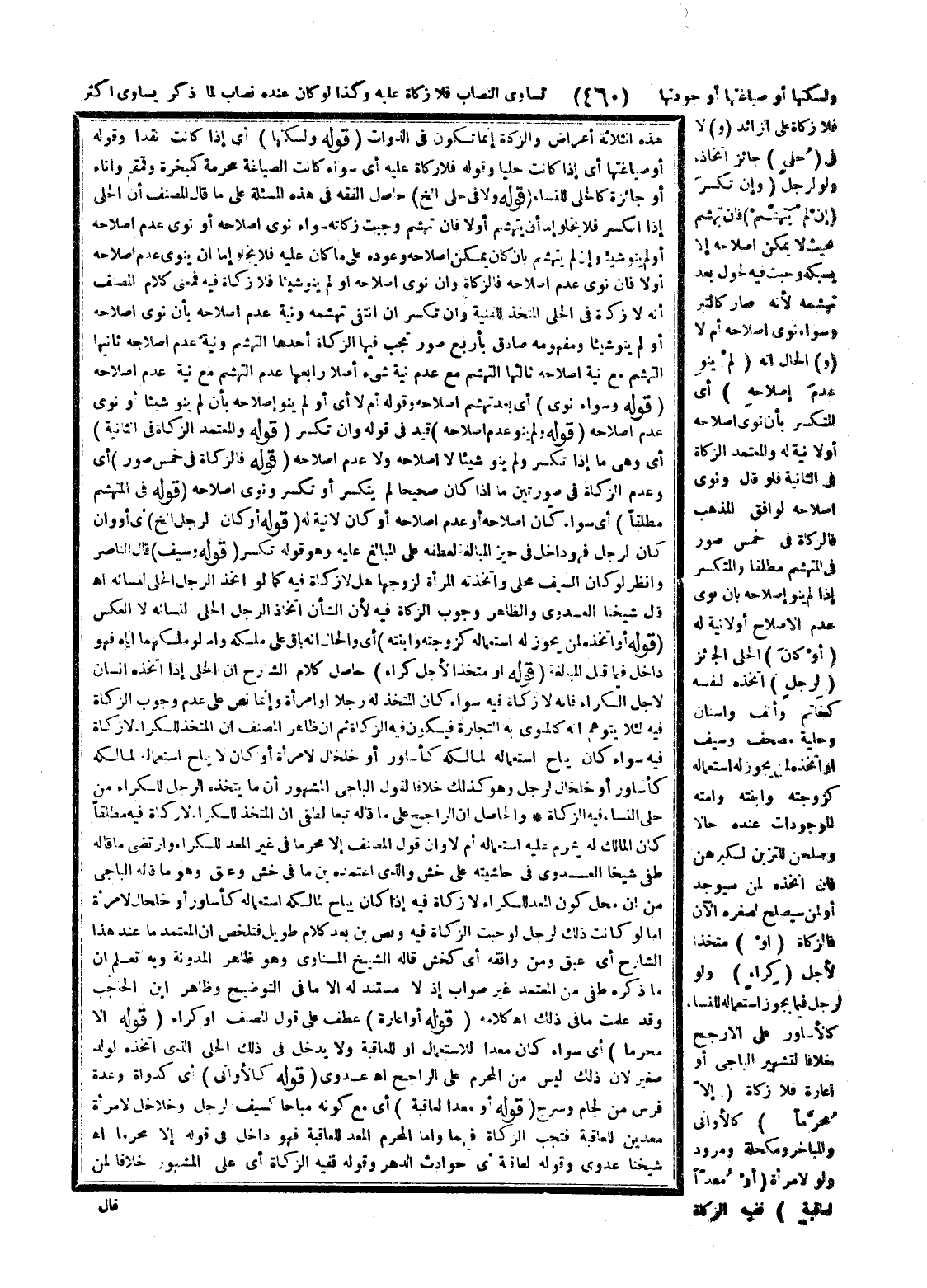 وَالْحَاصِلُ أَنَّ الرَّاجِحَ عَلَى مَا قَالَهُ تَبَعًا لطفى أَنَّ الْمُتَّخَذَ لِلْكِرَاءِ لَا زَكَاةَ فِيهِ مُطْلَقًا، كَانَ الْمَالِكُ لَهُ يَحْرُمُ عَلَيْهِ اسْتِعْمَالُهُ أَمْ لَا وَأَنَّ قَوْلَ الْمُصَنِّفِ إلَّا مُحَرَّمًا فِي غَيْرِ الْمُعَدِّ لِلْكِرَاءِ وَارْتَضَى مَا قَالَهُ طفى شَيْخُنَا الْعَدَوِيُّ فِي حَاشِيَتِهِ عَلَى خش وَاَلَّذِي اعْتَمَدَهُ بْن مَا فِي خش وعبق وَهُوَ مَا قَالَهُ الْبَاجِيَّ مِنْ أَنَّ مَحَلَّ كَوْنِ الْمُعَدِّ لِلْكِرَاءِ لَا زَكَاةَ فِيهِ إذَا كَانَ يُبَاحُ لِمَالِكِهِ اسْتِعْمَالُهُ كَأَسَاوِرَ أَوْ خَلْخَالٍ لِامْرَأَةٍ أَمَّا لَوْ كَانَ ذَلِكَ لِرَجُلٍ لَوَجَبَتْ الزَّكَاةُ فِيهِ وَنَصُّ بْن بَعْدَ كَلَامٍ طَوِيلٍ فَتَلَخَّصَ أَنَّ الْمُعْتَمَدَ مَا عِنْدَ هَذَا الشَّارِحِ أَيْ عبق وَمَنْ وَافَقَهُ أَيْ كخش قَالَهُ الشَّيْخُ الْمِسْنَاوِيُّ وَهُوَ ظَاهِرُ الْمُدَوَّنَةِ وَبِهِ تَعْلَمُ أَنَّ مَا ذَكَرَهُ طفى مِنْ الْمُعْتَمَدِ غَيْرُ صَوَابٍ إذْ لَا مُسْتَنَدَ لَهُ إلَّا مَا فِي التَّوْضِيحِ وَظَاهِرِ ابْنِ الْحَاجِبِ وَقَدْ عَلِمْت مَا فِي ذَلِكَ اهـ كَلَامُهُ (قَوْلُهُ أَوْ إعَارَةٍ) عَطْفٌ عَلَى قَوْلِ الْمُصَنِّفِ أَوْ كِرَاءٍ (قَوْلُهُ إلَّا مُحَرَّمًا) أَيْ سَوَاءٌ كَانَ مُعَدًّا لِلِاسْتِعْمَالِ أَوْ لِلْعَاقِبَةِ وَلَا يَدْخُلُ فِي ذَلِكَ الْحُلِيُّ الَّذِي اتَّخَذَهُ لِوَلَدٍ صَغِيرٍ لِأَنَّ ذَلِكَ لَيْسَ مِنْ الْمُحَرَّمِ عَلَى الرَّاجِحِ اهـ عَدَوِيٌّ (قَوْلُهُ كَالْأَوَانِي) أَيْ كَدَوَاةٍ وَعِدَّةِ فَرَسٍ مِنْ لِجَامٍ وَسَرْجٍ (قَوْلُهُ أَوْ مُعَدًّا لِعَاقِبَةٍ) أَيْ مَعَ كَوْنِهِ مُبَاحًا كَسَيْفٍ لِرَجُلٍ وَخَلَاخِلَ لِامْرَأَةٍ مُعَدَّيْنِ لِلْعَاقِبَةِ فَتَجِبُ الزَّكَاةُ فِيهِمَا وَأَمَّا الْمُحَرَّمُ الْمُعَدُّ لِلْعَاقِبَةِ فَهُوَ دَاخِلٌ فِي قَوْلِهِ إلَّا مُحَرَّمًا اهـ شَيْخُنَا عَدَوِيٌّ وَقَوْلُهُ لِعَاقِبَةٍ أَيْ حَوَادِثِ الدَّهْرِ وَقَوْلُهُ فَفِيهِ الزَّكَاةُ أَيْ عَلَى الْمَشْهُورِ خِلَافًا لِمَنْ