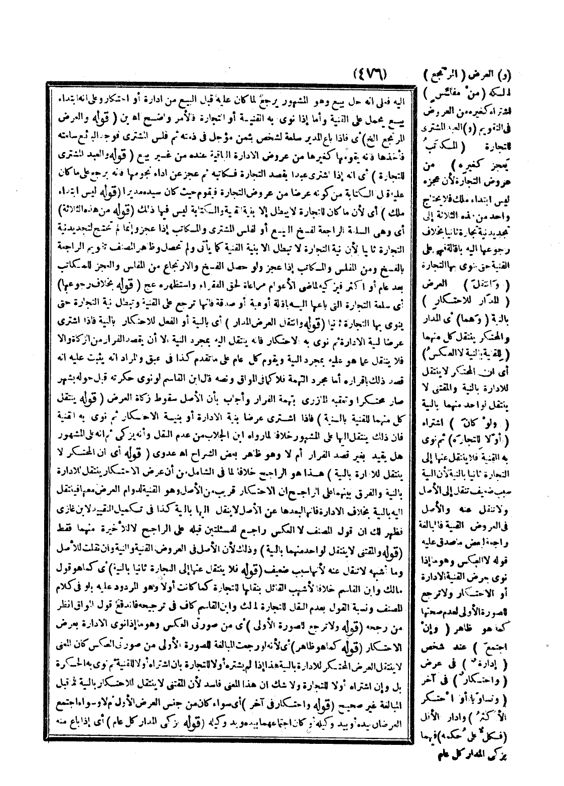 (وَ) الْعَرْضُ (الْمُرْتَجَعُ) لِمَالِكِهِ (مِنْ مُفْلِسٍ) اشْتَرَاهُ كَغَيْرِهِ مِنْ الْعُرُوضِ فِي التَّقْوِيمِ (وَ) الْعَبْدُ الْمُشْتَرَى لِلتِّجَارَةِ (الْمُكَاتَبُ يَعْجِزُ كَغَيْرِهِ) مِنْ عُرُوضِ التِّجَارَةِ لِأَنَّ عَجْزَهُ لَيْسَ ابْتِدَاءَ مِلْكٍ فَلَا يَحْتَاجُ وَاحِدٌ مِنْ هَذِهِ الثَّلَاثَةِ إلَى تَجْدِيدِ نِيَّةِ تِجَارَةٍ ثَانِيًا بِخِلَافِ رُجُوعِهَا إلَيْهِ بِإِقَالَةٍ فَهِيَ عَلَى الْقِنْيَةِ حَتَّى يَنْوِيَ بِهَا التِّجَارَةُ (وَانْتَقَلَ) الْعَرْضُ (الْمُدَارُ لِلِاحْتِكَارِ) بِالنِّيَّةِ (وَهُمَا) أَيْ الْمُدَارُ وَالْمُحْتَكَرُ يَنْتَقِلُ كُلٌّ مِنْهُمَا (لِلْقِنْيَةِ بِالنِّيَّةِ لَا الْعَكْسُ) أَيْ أَنَّ الْمُحْتَكَرَ لَا يَنْتَقِلُ لِلْإِدَارَةِ بِالنِّيَّةِ وَالْمُقْتَنَى لَا يَنْتَقِلُ لِوَاحِدٍ مِنْهُمَا بِالنِّيَّةِ (وَلَوْ كَانَ) اشْتَرَاهُ (أَوَّلًا لِلتِّجَارَةِ) ثُمَّ نَوَى بِهِ الْقِنْيَةَ فَلَا يَنْتَقِلُ عَنْهَا إلَى التِّجَارَةِ ثَانِيًا بِالنِّيَّةِ لِأَنَّ النِّيَّةَ سَبَبٌ ضَعِيفٌ تَنْقُلُ إلَى الْأَصْلِ وَلَا تَنْقُلُ عَنْهُ وَالْأَصْلُ فِي الْعُرُوضِ الْقِنْيَةُ فَالْمُبَالَغَةُ رَاجِعَةٌ لِبَعْضِ مَا صَدَقَ عَلَيْهِ قَوْلُهُ لَا الْعَكْسُ وَهُوَ مَا إذَا نَوَى بِعَرْضِ الْقِنْيَةِ الْإِدَارَةَ أَوْ الِاحْتِكَارَ وَلَا تَرْجِعُ لِلصُّورَةِ الْأُولَى لِعَدَمِ صِحَّتِهَا كَمَا هُوَ ظَاهِرٌ.