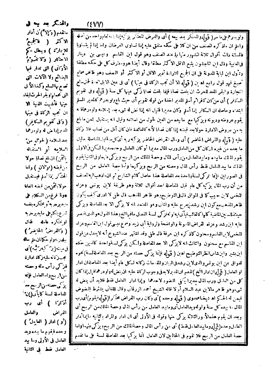وَلَمَّا فَرَغَ مِنْ الْكَلَامِ عَلَى مَا يُدِيرُهُ رَبُّهُ أَوْ يَحْتَكِرُهُ بِنَفْسِهِ شَرَعَ يَتَكَلَّمُ عَلَى مَا يُدِيرُهُ رَبُّهُ أَوْ يَحْتَكِرُهُ عَامِلُهُ فَقَالَ (وَالْقِرَاضُ الْحَاضِرُ) بِبَلَدِ رَبِّهِ وَلَوْ حُكْمًا بِأَنْ عُلِمَ حَالُهُ فِي غَيْبَةٍ (يُزَكِّيهِ رَبُّهُ) أَيْ تَجِبُ زَكَاتُهُ عَلَيْهِ زَكَاةَ إدَارَةٍ فَيُزَكِّي رَأْسَ مَالِهِ وَحِصَّتَهُ مِنْ الرِّبْحِ وَأَمَّا الْعَامِلُ فَإِنَّمَا يُزَكِّي حِصَّتَهُ مِنْ الرِّبْحِ بَعْدَ الْمُفَاصَلَةِ لِسَنَةٍ كَمَا يَأْتِي (إنْ أَدَارَا) أَيْ رَبُّ الْقِرَاضِ وَالْعَامِلُ (أَوْ) أَدَارَ (الْعَامِلُ) وَحْدَهُ فَيُقَوِّمُ مَا بِيَدِهِ وَيَدِ الْعَامِلِ فِي الْأُولَى وَمَا بِيَدِ الْعَامِلِ فَقَطْ فِي الثَّانِيَةِ