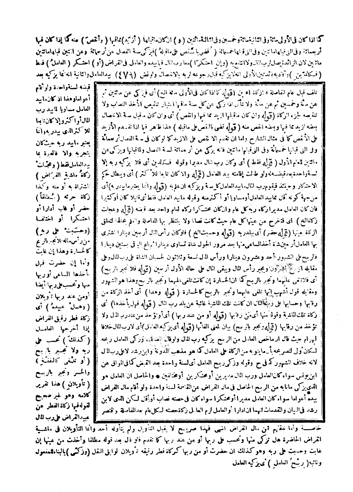 وَالْحَاصِلُ أَنَّ الْعَامِلَ هُوَ الَّذِي يُزَكِّي مَا نَابَهُ مِنْ الرِّبْحِ الْحَاصِلِ فِي مَالِ الْقِرَاضِ عَنْ الْمُقَاسَمَةِ لِسَنَةٍ وَاحِدَةٍ وَلَوْ أَقَامَ مَالُ الْقِرَاضِ بِيَدِهِ أَعْوَامًا سَوَاءٌ كَانَ الْعَامِلُ مُدِيرًا أَوْ مُحْتَكِرًا سَوَاءٌ كَانَ فِي حِصَّتِهِ نِصَابٌ أَوْ أَقَلُّ لَكِنْ الَّذِي لِابْنِ رُشْدٍ فِي الْبَيَانِ وَالْمُقَدِّمَاتِ أَنَّهُمَا إنْ أَدَارَا أَوْ الْعَامِلُ لَزِمَ الْعَامِلَ زَكَاةُ حِصَّتِهِ لِكُلِّ عَامٍ بَعْدَ الْمُفَاصَلَةِ وَاقْتَصَرَ