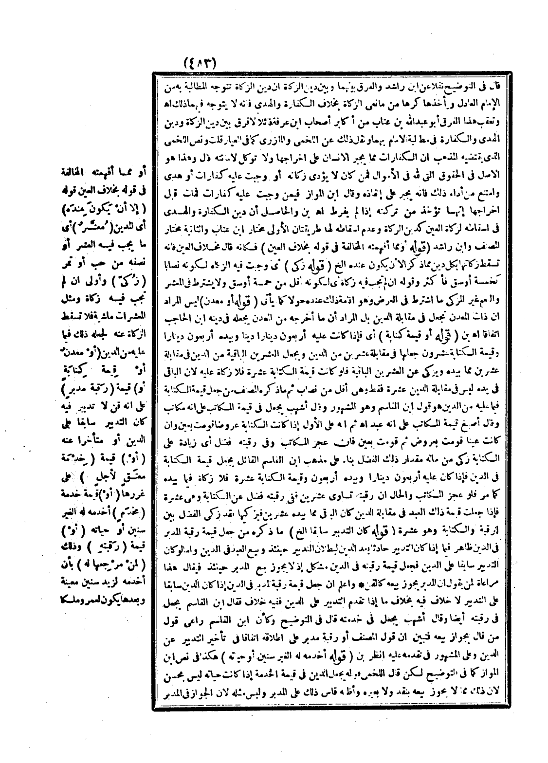 ـــــــــــــــــــــــــــــQقَالَ فِي التَّوْضِيحِ نَقْلًا عَنْ ابْنِ رَاشِدٍ وَالْفَرْقُ بَيْنَهُمَا وَبَيْنَ دَيْنِ الزَّكَاةِ أَنَّ دَيْنَ الزَّكَاةِ تَتَوَجَّهُ الْمُطَالَبَةُ بِهِ مِنْ الْإِمَامِ الْعَادِلِ وَيَأْخُذُهَا كَرْهًا مِنْ مَانِعِي الزَّكَاةِ بِخِلَافِ الْكَفَّارَةِ وَالْهَدْيِ فَإِنَّهُ لَا يَتَوَجَّهُ فِيهِمَا ذَلِكَ اهـ وَتَعَقَّبَ هَذَا الْفَرْقَ أَبُو عَبْدِ اللَّهِ بْنُ عَتَّابٍ مِنْ أَكَابِرِ أَصْحَابِ ابْنِ عَرَفَةَ قَائِلًا لَا فَرْقَ بَيْنَ دَيْنِ الزَّكَاةِ وَدَيْنِ الْهَدْيِ وَالْكَفَّارَةِ فِي مُطَالَبَةِ الْإِمَامِ بِهِمَا وَنُقِلَ ذَلِكَ عَنْ اللَّخْمِيِّ وَالْمَازِرِيِّ كَمَا فِي الْمِعْيَارِ قُلْت وَنَصُّ اللَّخْمِيِّ الَّذِي يَقْتَضِيهِ الْمَذْهَبُ أَنَّ الْكَفَّارَاتِ مِمَّا يُجْبَرُ الْإِنْسَانُ عَلَى إخْرَاجِهَا وَلَا تُوكَلُ لِأَمَانَتِهِ قَالَ وَهَذَا هُوَ الْأَصْلُ فِي الْحُقُوقِ الَّتِي لِلَّهِ فِي الْأَمْوَالِ فَمَنْ كَانَ لَا يُؤَدِّي زَكَاتَهُ أَوْ وَجَبَتْ عَلَيْهِ كَفَّارَاتٌ أَوْ هَدْيٌ وَامْتَنَعَ مِنْ أَدَاءِ ذَلِكَ فَإِنَّهُ يُجْبَرُ عَلَى إنْفَاذِهِ وَقَالَ ابْنُ الْمَوَّازِ فِيمَنْ وَجَبَتْ عَلَيْهِ كَفَّارَاتٌ فَمَاتَ قَبْلَ إخْرَاجِهَا إنَّهَا تُؤْخَذُ مِنْ تَرِكَتِهِ إذَا لَمْ يُفَرِّطْ اهـ بْن.