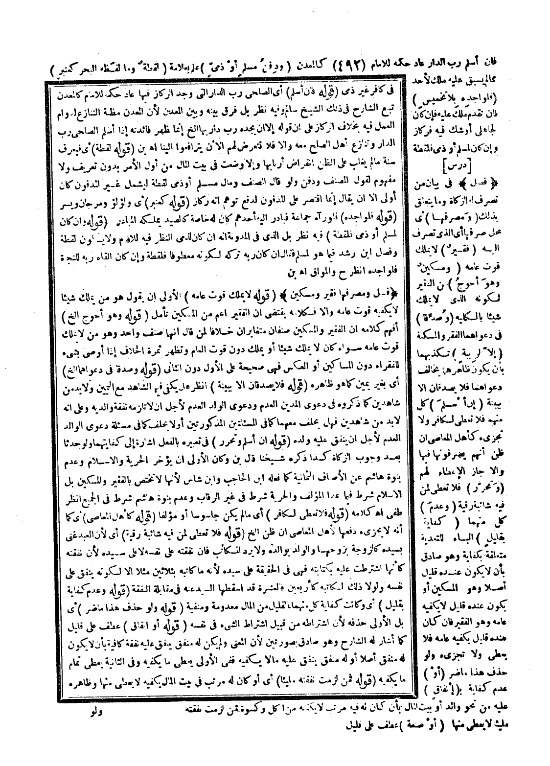 (فَصْلٌ وَمَصْرِفُهَا فَقِيرٌ وَمِسْكِينٌ) (قَوْلُهُ لَا يَمْلِكُ قُوتَ عَامِهِ) الْأَوْلَى أَنْ يَقُولَ هُوَ مَنْ يَمْلِكُ شَيْئًا لَا يَكْفِيهِ قُوتَ عَامِهِ وَإِلَّا فَكَلَامُهُ يَقْتَضِي أَنَّ الْفَقِيرَ أَعَمُّ مِنْ الْمِسْكِينِ تَأَمَّلْ (قَوْلُهُ، وَهُوَ أَحْوَجُ إلَخْ) أَفْهَمَ كَلَامُهُ أَنَّ الْفَقِيرَ وَالْمِسْكِينَ صِنْفَانِ مُتَغَايِرَانِ خِلَافًا لِمَنْ قَالَ إنَّهُمَا صِنْفٌ وَاحِدٌ، وَهُوَ مَنْ لَا يَمْلِكُ قُوتَ عَامِهِ سَوَاءٌ كَانَ لَا يَمْلِكُ شَيْئًا أَوْ يَمْلِكُ دُونَ قُوتِ الْعَامِ وَتَظْهَرُ ثَمَرَةُ الْخِلَافِ إذَا أُوصِيَ بِشَيْءٍ لِلْفُقَرَاءِ دُونَ الْمَسَاكِينِ أَوْ الْعَكْسِ فَهِيَ صَحِيحَةٌ عَلَى الْأَوَّلِ دُونَ الثَّانِي (قَوْلُهُ وَصَدَقَا فِي دَعْوَاهُمَا إلَخْ) أَيْ بِغَيْرِ يَمِينٍ كَمَا هُوَ ظَاهِرُهُ (قَوْلُهُ فَلَا يُصَدَّقَانِ إلَّا بِبَيِّنَةٍ) اُنْظُرْ هَلْ يَكْفِي فِيهَا الشَّاهِدُ مَعَ الْيَمِينِ وَلَا بُدَّ مِنْ شَاهِدَيْنِ كَمَا ذَكَرُوهُ فِي دَعْوَى الْمَدِينِ الْعَدَمَ وَدَعْوَى الْوَلَدِ الْعَدَمَ لِأَجْلِ أَنْ لَا تَلْزَمَهُ نَفَقَةُ وَالِدَيْهِ وَعَلَى أَنَّهُ لَا بُدَّ مِنْ شَاهِدَيْنِ فَهَلْ يَحْلِفُ مَعَهُمَا كَمَا فِي الْمَسْأَلَتَيْنِ الْمَذْكُورَتَيْنِ أَوْ لَا يَحْلِفُ كَمَا فِي مَسْأَلَةِ دَعْوَى الْوَالِدِ الْعَدَمَ لِأَجْلِ أَنْ يُنْفِقَ عَلَيْهِ وَلَدُهُ (قَوْلُهُ إنْ أَسْلَمَ وَتَحَرَّرَ) فِي تَعْبِيرِهِ بِالْفِعْلِ إشَارَةٌ إلَى كِفَايَتِهِمَا وَلَوْ حَدَثَا بَعْدَ وُجُوبِ الزَّكَاةِ كَذَا ذَكَرَهُ شَيْخُنَا قَالَ بْن وَكَانَ الْأَوْلَى أَنْ يُؤَخِّرَ الْحُرِّيَّةَ وَالْإِسْلَامَ وَعَدَمَ بُنُوَّةِ هَاشِمٍ عَنْ الْأَصْنَافِ الثَّمَانِيَةِ كَمَا فَعَلَهُ ابْنُ الْحَاجِبِ وَابْنُ شَاسٍ؛ لِأَنَّهَا لَا تَخْتَصُّ بِالْفَقِيرِ وَالْمِسْكِينِ بَلْ الْإِسْلَامُ شَرْطٌ فِيمَا عَدَا الْمُؤَلَّفَ وَالْحُرِّيَّةُ شَرْطٌ فِي غَيْرِ الرِّقَابِ وَعَدَمُ بُنُوَّةِ هَاشِمٍ شَرْطٌ فِي الْجَمِيعِ اُنْظُرْ طفى اهـ كَلَامُهُ (قَوْلُهُ فَلَا تُعْطَى لِكَافِرٍ) أَيْ مَا لَمْ يَكُنْ جَاسُوسًا أَوْ مُؤَلَّفًا (قَوْلُهُ كَأَهْلِ الْمَعَاصِي) أَيْ كَمَا أَنَّهُ لَا يُجْزِئُ دَفْعُهَا لِأَهْلِ الْمَعَاصِي إنْ ظَنَّ إلَخْ (قَوْلُهُ فَلَا تُعْطَى لِمَنْ فِيهِ شَائِبَةٌ رِقِّيَّةِ) أَيْ؛ لِأَنَّ الْعَبْدَ غَنِيٌّ بِسَيِّدِهِ كَالزَّوْجَةِ بِزَوْجِهَا وَالْوَلَدِ بِوَالِدِهِ وَلَا يُرَدُّ الْمُكَاتَبُ فَإِنَّ نَفَقَتَهُ عَلَى نَفْسِهِ لَا عَلَى سَيِّدِهِ؛ لِأَنَّ نَفَقَتَهُ كَأَنَّهَا اُشْتُرِطَتْ عَلَيْهِ بِكِتَابَتِهِ فَهِيَ فِي الْحَقِيقَةِ عَلَى سَيِّدِهِ؛ لِأَنَّهُ مَا كَاتَبَهُ بِثَلَاثِينَ مَثَلًا إلَّا لِكَوْنِهِ يُنْفِقُ عَلَى نَفْسِهِ وَلَوْلَا ذَلِكَ لَكَاتَبَهُ كَأَرْبَعِينَ فَالْعَشَرَةُ قَدْ أَسْقَطَهَا السَّيِّدُ عَنْهُ فِي مُقَابَلَةِ النَّفَقَةِ (قَوْلُهُ وَعَدَمَ كِفَايَةٍ بِقَلِيلٍ) أَيْ وَكَانَتْ كِفَايَةُ كُلٍّ مِنْهُمَا بِالْقَلِيلِ مِنْ الْمَالِ مَعْدُومَةً وَمَنْفِيَّةً (قَوْلُهُ وَلَوْ حُذِفَ هَذَا مَا ضَرَّ) أَيْ بَلْ الْأَوْلَى حَذْفُهُ؛ لِأَنَّ اشْتِرَاطَهُ مِنْ قَبِيلِ اشْتِرَاطِ الشَّيْءِ فِي نَفْسِهِ (قَوْلُهُ أَوْ إنْفَاقٍ) عَطْفٌ عَلَى قَلِيلٍ كَمَا أَشَارَ لَهُ الشَّارِحُ، وَهُوَ صَادِقٌ عَلَى قَلِيلٍ كَمَا أَشَارَ لَهُ الشَّارِحُ وَهُوَ صَادِقٌ بِصُورَتَيْنِ؛ لِأَنَّ الْمَعْنَى وَلَمْ يَكُنْ لَهُ مُنْفِقٌ يُنْفِقُ نَفَقَةً كَافِيَةً بِأَنْ لَا يَكُونَ لَهُ مُنْفِقٌ أَصْلًا وَلَهُ مُنْفِقٌ يُنْفِقُ عَلَيْهِ مَالًا يَكْفِيهِ فَفِي الْأُولَى يُعْطَى تَمَامَ مَا يَكْفِيهِ (قَوْ