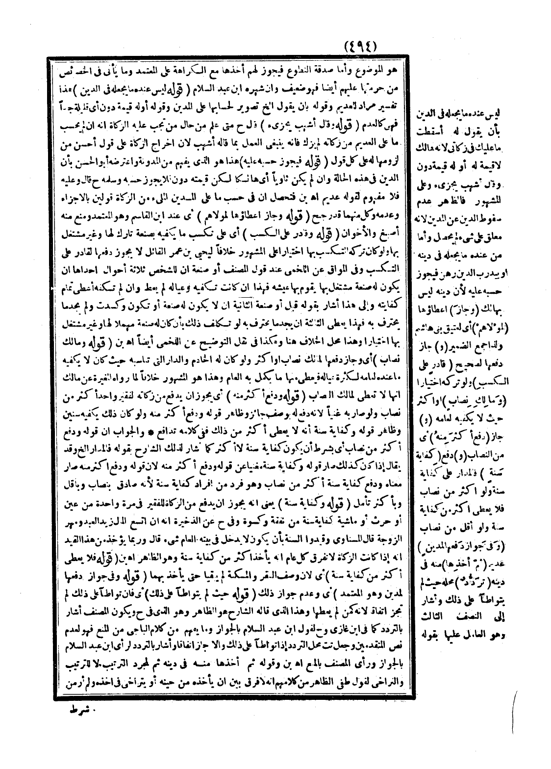 ـــــــــــــــــــــــــــــQهُوَ الْمَوْضُوعُ، وَأَمَّا صَدَقَةُ التَّطَوُّعِ فَيَجُوزُ لَهُمْ أَخْذُهَا مَعَ الْكَرَاهَةِ عَلَى الْمُعْتَمَدِ وَمَا يَأْتِي فِي الْخَصَائِصِ مِنْ حُرْمَتِهَا عَلَيْهِمْ أَيْضًا فَهُوَ ضَعِيفٌ وَإِنْ شَهَّرَهُ ابْنُ عَبْدِ السَّلَامِ (قَوْلُهُ لَيْسَ عِنْدَهُ مَا يَجْعَلُهُ فِي الدَّيْنِ) هَذَا تَفْسِيرٌ مُرَادٌ لِلْعَدِيمِ وَقَوْلُهُ بِأَنْ يَقُولَ إلَخْ تَصْوِيرٌ لِحِسَابِهَا عَلَى الْمَدِينِ وَقَوْلُهُ أَوْ لَهُ قِيمَةٌ دُونَ أَيْ قَلِيلَةٌ جِدًّا فَهِيَ كَالْعَدَمِ (قَوْلُهُ وَقَالَ أَشْهَبُ: يُجْزِئُ) قَالَ ح مَتَى عُلِمَ مِنْ حَالِ مَنْ تَجِبُ عَلَيْهِ الزَّكَاةُ أَنَّهُ إنْ لَمْ يُحْسَبْ مَا عَلَى الْعَدِيمِ مِنْ زَكَاتِهِ لَمْ يُزَكَّ فَإِنَّهُ يَنْبَغِي الْعَمَلُ بِمَا قَالَهُ أَشْهَبُ؛ لِأَنَّ إخْرَاجَ الزَّكَاةِ عَلَى قَوْلٍ أَحْسَنَ مِنْ لُزُومِهَا لَهُ عَلَى كُلِّ قَوْلٍ (قَوْلُهُ فَيَجُوزُ حَسْبُهُ عَلَيْهِ) هَذَا هُوَ الَّذِي يُفْهَمُ مِنْ الْمُدَوَّنَةِ وَاعْتَرَضَهُ أَبُو الْحَسَنِ بِأَنَّ الدَّيْنَ فِي هَذِهِ الْحَالَةِ، وَإِنْ لَمْ يَكُنْ ثَاوِيًا أَيْ هَالِكًا لَكِنَّ قِيمَتَهُ دُونَ فَلَا يَجُوزُ حَسْبُهُ وَسَلَّمَهُ ح قَالَ وَعَلَيْهِ فَلَا مَفْهُومَ لِقَوْلِهِ عَدِيمٌ اهـ بْن فَتَحَصَّلَ أَنَّ فِي حَسْبِ مَا عَلَى الْمَدِينِ الْمَلِيءِ مِنْ الزَّكَاةِ قَوْلَيْنِ بِالْإِجْزَاءِ وَعَدَمِهِ وَكُلٌّ مِنْهُمَا قَدْ رُجِّحَ (قَوْلُهُ وَجَازَ إعْطَاؤُهَا لِمَوْلَاهُمْ) أَيْ عِنْدَ ابْنِ الْقَاسِمِ، وَهُوَ الْمُعْتَمَدُ وَمَنَعَ مِنْهُ أَصْبَغُ وَالْأَخَوَانِ