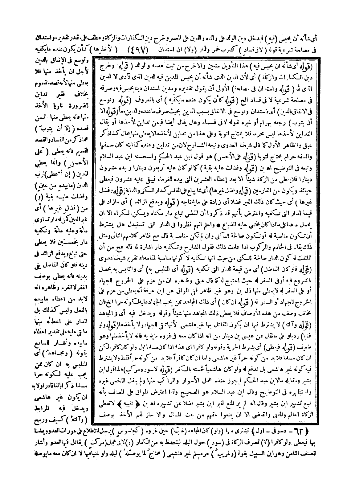 ـــــــــــــــــــــــــــــQقَوْلُهُ أَيْ شَأْنُهُ أَنْ يُحْبَسَ فِيهِ) هَذَا التَّأْوِيلُ مُتَعَيِّنٌ وَإِلَّا خَرَجَ مَنْ ثَبَتَ عَدَمُهُ وَالْوَالِدُ (قَوْلُهُ وَخَرَجَ دَيْنُ الْكَفَّارَاتِ وَالزَّكَاةُ) أَيْ؛ لِأَنَّ الدَّيْنَ الَّذِي شَأْنُهُ أَنْ يُحْبَسَ الْمَدِينُ فِيهِ الدَّيْنَ الَّذِي لِآدَمِيٍّ لَا الدَّيْنُ الَّذِي لِلَّهِ (قَوْلُهُ وَاسْتَدَانَ فِي مَصْلَحَةٍ) الْأَوْلَى أَنْ يَقُولَ تَقْدِيرُهُ وَمَدِينٌ اسْتَدَانَ دَيْنًا يُحْبَسُ فِيهِ وَصَرْفُهُ فِي مَصْلَحَةٍ شَرْعِيَّةٍ لَا فِي فَسَادٍ إلَخْ (قَوْلُهُ كَأَنْ يَكُونَ عِنْدَهُ مَا يَكْفِيهِ) أَيْ بِالْمَعْرُوفِ (قَوْلُهُ وَتَوَسَّعَ فِي الْإِنْفَاقِ بِالدَّيْنِ) أَيْ فَاسْتَدَانَ وَتَوَسَّعْ فِي الْإِنْفَاقِ بِسَبَبِ الدَّيْنِ بِحَيْثُ صَرَفَ مَا عِنْدَهُ وَالدَّيْنَ مَعًا (قَوْلُهُ إلَّا أَنْ يَتُوبَ) رَجَّعَهُ بَهْرَامُ أَوْ غَيْرُهُ لِقَوْلِهِ لَا فِي فَسَادٍ وَهَلْ يُقَالُ أَيْضًا فِيمَنْ تَدَايَنَ لِأَخْذِهَا أَوْ يُقَالُ التَّدَايُنُ لَأَخْذِهَا لَيْسَ مُحَرَّمًا فَلَا يَحْتَاجُ لِتَوْبَةٍ وَعَلَى هَذَا مَنْ تَدَايَنَ لِأَخْذِهَا لَا يُعْطَى مِنْهَا بِحَالٍ كَذَا ذَكَرَ عبق وَالظَّاهِرُ الْأَوَّلُ كَمَا قَالَ شَيْخُنَا الْعَدَوِيُّ وَتَبِعَهُ الشَّارِحُ؛ لِأَنَّ مَنْ تَدَايَنَ وَعِنْدَهُ كِفَايَتُهُ كَانَ سَفَهًا وَالسَّفَهُ حَرَامٌ يَحْتَاجُ لِتَوْبَةٍ (قَوْلُهُ عَلَى الْأَحْسَنِ) هُوَ قَوْلُ ابْنِ عَبْدِ الْحَكَمِ وَاسْتَحْسَنَهُ ابْنُ عَبْدِ السَّلَامِ وَتَبِعَهُ فِي التَّوْضِيحِ اهـ بْن (قَوْلُهُ وَفَضَلَتْ عَلَيْهِ بَقِيَّةٌ) كَمَا لَوْ كَانَ عَلَيْهِ أَرْبَعُونَ دِينَارًا وَبِيَدِهِ عِشْرُونَ دِينَارًا فَلَا يُعْطَى مِنْ الزَّكَاةِ شَيْئًا إلَّا بَعْدَ إعْطَاءِ الْعِشْرِينَ الَّتِي بِيَدِهِ لِلْغُرَمَاءِ فَيَبْقَى عَلَيْهِ عِشْرُونَ فَيُعْطَى حِينَئِذٍ وَيَكُونُ مِنْ الْغَارِمِينَ (قَوْلُهُ وَفَضْلِ غَيْرِهَا) أَيْ مِمَّا يُبَاعُ عَلَى الْمُفْلِسِ كَدَارِ السُّكْنَى وَالدَّابَّةِ (قَوْلُهُ وَفَضْلِ غَيْرِهَا) أَيْ حَيْثُ كَانَ ذَلِكَ الْغَيْرُ فَضْلًا أَيْ زِيَادَةً عَلَى مَا يَحْتَاجُهُ (قَوْلُهُ وَيَدْفَعُ الزَّائِدَ) أَيْ مَا زَادَ عَلَى قِيمَةِ الدَّارِ الَّتِي تَكْفِيهِ وَاعْتَرَضَ بِأَنَّهُمْ قَدْ ذَكَرُوا أَنَّ الْمُفْلِسَ تُبَاعُ دَارُ سُكْنَاهُ وَيَسْكُنُ بِالْكِرَاءِ إلَّا أَنْ يُحْمَلَ مَا هُنَا عَلَى مَا إذَا كَانَ يَخْشَى عَلَيْهِ الضَّيَاعَ وَاعْلَمْ أَنَّهُمْ نَظَرُوا فِي الدَّارِ الَّتِي تُسْتَبْدَلُ هَلْ يُشْتَرَطُ أَنْ تَكُونَ مُنَاسِبَةً لَهُ أَوْ تَكُونَ صَالِحَةً لِلسُّكْنَى وَإِنْ لَمْ تَكُنْ مُنَاسِبَةً قَالَ عج ظَاهِرُ كَلَامِهِمْ الثَّانِي وَمِثْلُ ذَلِكَ يُقَالُ فِي الْخَادِمِ وَالْمَرْكُوبِ إذَا عَلِمْت ذَلِكَ فَقَوْلُ الشَّارِحِ وَتَكْفِيهِ دَارٌ إشَارَةً لِمَا قَالَهُ عج مِنْ أَنَّ الْمُلْتَفَتَ لَهُ كَوْنُ الدَّارِ صَالِحَةً لِلسُّكْنَى مِنْ حَيْثُ إنَّهَا تَكْفِيهِ لَا كَوْنُهَا مُنَاسِبَةً لِمَقَامِهِ اهـ تَقْرِيرُ شَيْخِنَا عَدَوِيٍّ (قَوْلُهُ فَلَوْ كَانَ الْفَاضِلُ) أَيْ مِنْ قِيمَةِ الدَّارِ الَّتِي تَكْفِيهِ