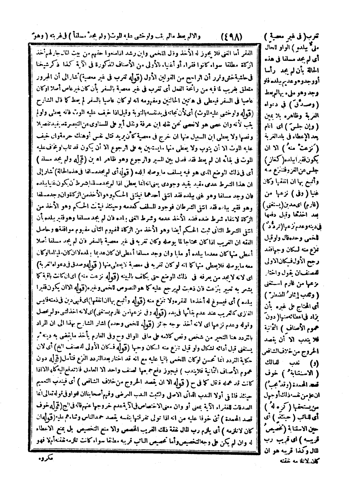 (قَوْلُهُ تَغَرَّبَ فِي غَيْرِ مَعْصِيَةٍ) أَشَارَ إلَى أَنَّ الْمَجْرُورَ مُتَعَلِّقٌ بِغَرِيبٍ لِمَا فِيهِ مِنْ رَائِحَةِ الْفِعْلِ أَيْ تَغَرَّبَ فِي غَيْرِ مَعْصِيَةٍ بِالسَّفَرِ بِأَنْ كَانَ غَيْرَ عَاصٍ أَصْلًا أَوْ كَانَ عَاصِيًا فِي السَّفَرِ فَيُعْطَى فِي هَاتَيْنِ الْحَالَتَيْنِ وَمَفْهُومُهُ أَنَّهُ لَوْ كَانَ عَاصِيًا بِالسَّفَرِ لَمْ يُعْطَ كَمَا قَالَ الشَّارِحُ: (قَوْلُهُ وَلَوْ خُشِيَ عَلَيْهِ الْمَوْتُ) أَيْ؛ لِأَنَّ نَجَاتَهُ فِي يَدِ نَفْسِهِ بِالتَّوْبَةِ وَقِيلَ إذَا خِيفَ عَلَيْهِ الْمَوْتُ فَإِنَّهُ يُعْطَى وَلَوْ لَمْ يَتُبْ؛ لِأَنَّهُ وَإِنْ عَصَى هُوَ لَا نَعْصِي نَحْنُ نَقَلَهُ ابْنُ عَرَفَةَ وَنَقَلَ أَبُو عَلِيٍّ الْمِسْنَاوِيُّ عَنْ التَّبْصِرَةِ مَا يُفِيدُ تَفْصِيلًا وَنَصُّهَا وَلَا يُعْطَى ابْنُ السَّبِيلِ مِنْهَا إنْ خَرَجَ فِي مَعْصِيَةٍ كَأَنْ يُرِيدَ قَتْلَ نَفْسٍ أَوْ هَتْكَ حُرْمَةٍ، وَإِنْ خِيفَ عَلَيْهِ الْمَوْتُ إلَّا أَنْ يَتُوبَ وَلَا يُعْطَى مِنْهَا مَا يَسْتَعِينُ بِهِ عَلَى الرُّجُوعِ إلَّا أَنْ يَكُونَ قَدْ تَابَ أَوْ يُخَافُ عَلَيْهِ الْمَوْتُ فِي بَقَائِهِ إنْ لَمْ يُعْطَ فَقَدْ فَصَلَ بَيْنَ الْمَسِيرِ وَالرُّجُوعِ، وَهُوَ ظَاهِرٌ اهـ بْن (قَوْلُهُ وَلَمْ يَجِدْ مُسَلِّفًا) أَيْ فِي ذَلِكَ الْمَوْضِعِ الَّذِي هُوَ فِيهِ يُسَلِّفُ مَا يُوصِلُهُ لِبَلَدِهِ (قَوْلُهُ أَيْ لَمْ يَجِدْ مُسَلِّفًا فِي هَذِهِ الْحَالَةِ) أَشَارَ إلَى أَنَّ هَذَا الشَّرْطَ عَدَمِيٌّ مُقَيَّدٌ بِقَيْدٍ وُجُودِيٍّ يَعْنِي أَنَّهُ إنَّمَا يُعْطَى إذَا لَمْ يَجِدْ مُسَلِّفًا بِشَرْطِ أَنْ يَكُونَ غَنِيًّا بِبَلَدِهِ فَإِنْ وَجَدَ مُسَلِّفًا، وَهُوَ غَنِيٌّ بِبَلَدِهِ فَقَدْ انْتَفَى أَحَدُهُمَا فَيَنْتَفِي الْحُكْمُ، وَهُوَ الْأَخْذُ مِنْ الزَّكَاةِ وَإِنْ وَجَدَ مُسَلِّفًا، وَهُوَ فَقِيرٌ بِبَلَدِهِ فَقَدْ انْتَفَى الشَّرْطَانِ فَوُجُودُ الْمُسَلِّفِ كَعَدَمِهِ وَحِينَئِذٍ فَيَثْبُتُ الْحُكْمُ، وَهُوَ الْأَخْذُ مِنْ الزَّكَاةِ لِانْتِفَاءِ شَرْطِ ضِدِّهِ فَضِدُّ الْأَخْذِ عَدَمُهُ وَشَرْطُ الْغَنِيِّ بِبَلَدِهِ فَإِنْ لَمْ يَجِدْ مُسَلِّفًا، وَهُوَ فَقِيرٌ بِبَلَدِهِ بِأَنْ انْتَفَى الشَّرْطُ الثَّانِي ثَبَتَ الْحُكْمُ أَيْضًا، وَهُوَ الْأَخْذُ مِنْ الزَّكَاةِ فَمَفْهُومُ الثَّانِي مَفْهُومُ مُوَافَقَةٍ.