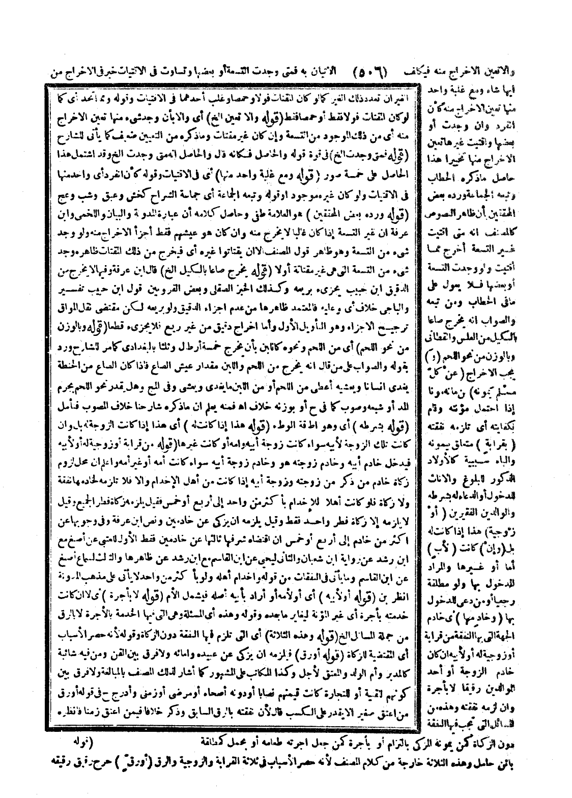 (وَ) يَجِبُ الْإِخْرَاجُ (عَنْ كُلِّ مُسْلِمٍ يَمُونُهُ) مِنْ مَانَهُ مَوْنًا إذَا احْتَمَلَ مُؤْنَتَهُ وَقَامَ بِكِفَايَتِهِ أَيْ تَلْزَمُهُ نَفَقَتُهُ (بِقَرَابَةٍ) مُتَعَلِّقٌ بِيَمُونُهُ وَالْبَاءُ سَبَبِيَّةٌ كَالْأَوْلَادِ الذُّكُورِ لِلْبُلُوغِ وَالْإِنَاثِ لِلدُّخُولِ أَوْ الدُّعَاءِ لَهُ بِشَرْطِهِ وَالْوَالِدَيْنِ الْفَقِيرَيْنِ (أَوْ زَوْجِيَّةٍ) هَذَا إذَا كَانَتْ لَهُ بَلْ (وَإِنْ) كَانَتْ (لِأَبٍ) أُمًّا أَوْ غَيْرَهَا وَالْمُرَاد الْمَدْخُولُ بِهَا وَلَوْ مُطَلَّقَةً رَجْعِيًّا أَوْ مَنْ دَعَا لِلدُّخُولِ بِهَا (وَخَادِمِهَا) أَيْ خَادِمِ الْجِهَةِ الَّتِي بِهَا النَّفَقَةُ مِنْ قَرَابَةٍ أَوْ زَوْجِيَّةٍ لَهُ أَوْ لِأَبِيهِ إنْ كَانَ خَادِمُ الزَّوْجَةِ أَوْ أَحَدُ الْوَالِدَيْنِ رَقِيقًا لَا بِأُجْرَةٍ، وَإِنْ لَزِمَهُ نَفَقَتُهُ وَهَذِهِ مِنْ الْمَسَائِلِ الَّتِي تَجِبُ فِيهَا النَّفَقَةُ دُونَ الزَّكَاةِ كَمَنْ يَمُونُهُ الْمُزَكِّي بِالْتِزَامٍ أَوْ بِأُجْرَةٍ كَمَنْ جَعَلَ أُجْرَتَهُ طَعَامَهُ أَوْ بِحَمْلٍ قَوْلُهُ كَمُطَلَّقَةٍ بَائِنٍ حَامِلٍ وَهَذِهِ الثَّلَاثَةُ خَارِجَةٌ مِنْ كَلَامِ الْمُصَنِّفِ؛ لِأَنَّهُ حَصَرَ الْأَسْبَابَ فِي ثَلَاثَةٍ الْقَرَابَةُ وَالزَّوْجِيَّةُ وَالرِّقُّ (أَوْ رِقٍّ) خَرَجَ رَقِيقُ رَقِيقِهِ