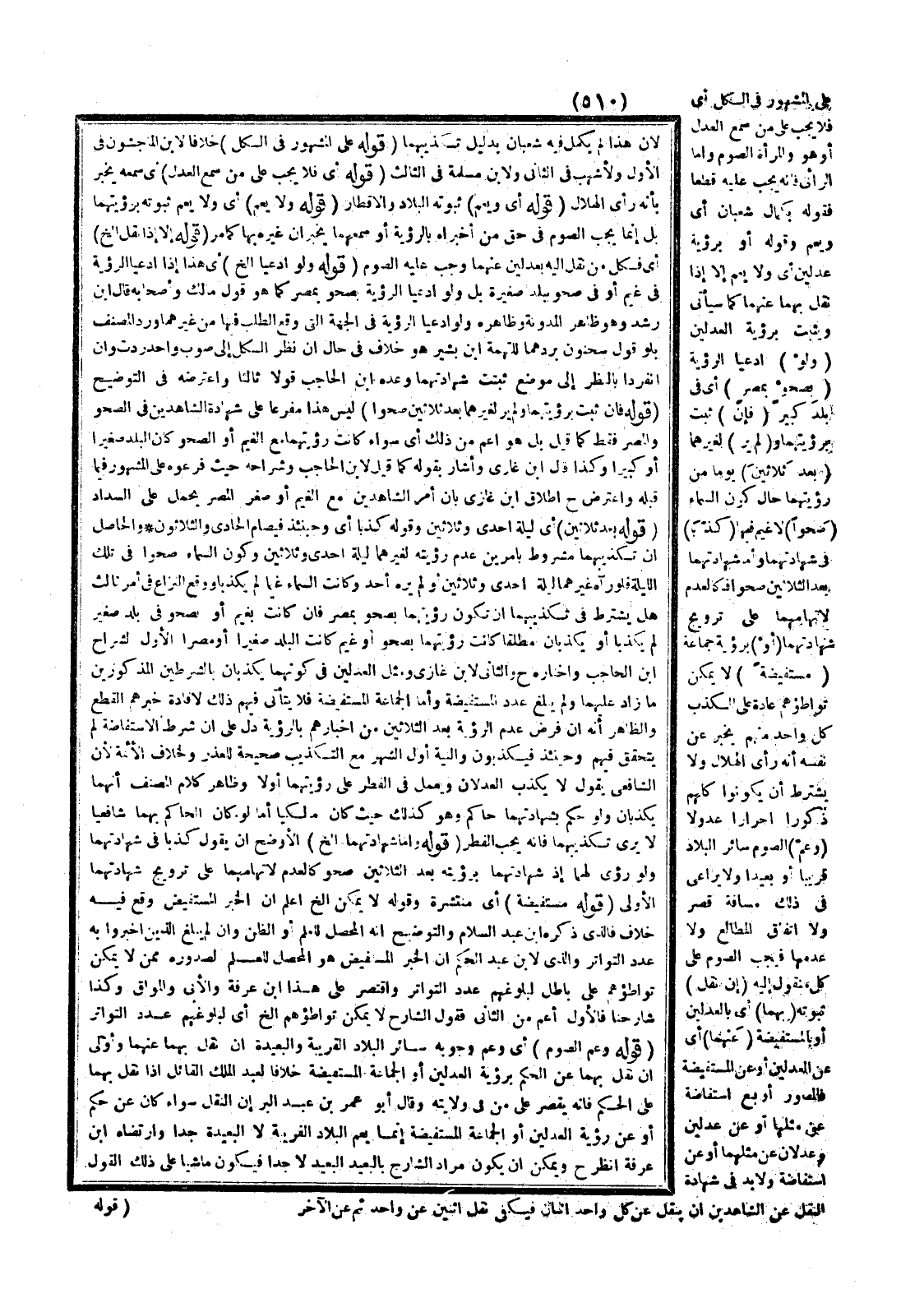 عَلَى الْمَشْهُورِ فِي الْكُلِّ أَيْ فَلَا يَجِبُ عَلَى مَنْ سَمِعَ الْعَدْلَ أَوْ هُوَ وَالْمَرْأَةَ الصَّوْمُ، وَأَمَّا الرَّائِي فَإِنَّهُ يَجِبُ عَلَيْهِ قَطْعًا فَقَوْلُهُ بِكَمَالِ شَعْبَانَ أَيْ وَيَعُمُّ قَوْلُهُ أَوْ بِرُؤْيَةِ عَدْلَيْنِ أَيْ وَلَا يَعُمُّ إلَّا إذَا نُقِلَ بِهِمَا عَنْهُمَا كَمَا سَيَأْتِي وَيَثْبُتُ بِرُؤْيَةِ الْعَدْلَيْنِ (وَلَوْ) ادَّعَيَا الرُّؤْيَةَ (بِصَحْوٍ بِمِصْرٍ) أَيْ فِي بَلَدٍ كَبِيرٍ (فَإِنْ) ثَبَتَ بِرُؤْيَتِهِمَا وَ (لَمْ يَرَ) لِغَيْرِهِمَا (بَعْدَ ثَلَاثِينَ) يَوْمًا مِنْ رُؤْيَتِهِمَا حَالَ كَوْنِ السَّمَاءِ (صَحْوًا) لَا غَيْمَ فِيهَا (كُذِّبَا) فِي شَهَادَتِهِمَا، وَأَمَّا شَهَادَتُهُمَا بَعْدَ الثَّلَاثِينَ صَحْوًا فَكَالْعَدِمِ لِاتِّهَامِهِمَا عَلَى تَرْوِيجِ شَهَادَتِهِمَا (أَوْ) بِرُؤْيَةِ جَمَاعَةٍ (مُسْتَفِيضَةً) لَا يُمْكِنُ تَوَاطُؤُهُمْ عَادَةً عَلَى الْكَذِبِ كُلُّ وَاحِدٍ مِنْهُمْ يُخْبِرُ عَنْ نَفْسِهِ أَنَّهُ رَأَى الْهِلَالَ وَلَا يُشْتَرَطُ أَنْ يَكُونُوا كُلُّهُمْ ذُكُورًا أَحْرَارًا عُدُولًا (وَعَمَّ) الصَّوْمُ سَائِرَ الْبِلَادِ قَرِيبًا أَوْ بَعِيدًا وَلَا يُرَاعَى فِي ذَلِكَ مَسَافَةُ قَصْرٍ وَلَا اتِّفَاقُ الْمَطَالِعِ وَلَا عَدَمُهَا فَيَجِبُ الصَّوْمُ عَلَى كُلِّ مَنْقُولٍ إلَيْهِ (إنْ نُقِلَ) ثُبُوتُهُ (بِهِمَا) أَيْ بِالْعَدْلَيْنِ أَوْ بِالْمُسْتَفِيضَةِ (عَنْهُمَا) أَيْ عَنْ الْعَدْلَيْنِ أَوْ عَنْ الْمُسْتَفِيضَةِ فَالصُّوَرُ أَرْبَعٌ اسْتِفَاضَةٌ عَنْ مِثْلِهَا أَوْ عَنْ عَدْلَيْنِ وَعَدْلَانِ عَنْ مِثْلِهِمَا أَوْ عَنْ اسْتِفَاضَةٍ وَلَا بُدَّ فِي شَهَادَةِ النَّقْلِ عَنْ الشَّاهِدَيْنِ أَنْ يَنْقُلَ عَنْ كُلِّ وَاحِدٍ اثْنَانِ فَيَكْفِي نَقْلُ اثْنَيْنِ عَنْ وَاحِدٍ ثُمَّ عَنْ الْآخَرِ