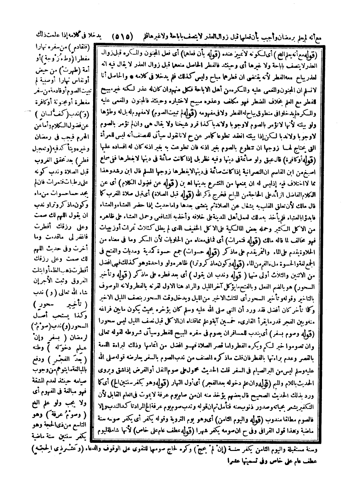 ـــــــــــــــــــــــــــــQقَوْلُهُ مَعَ أَنَّهُ يَعْلَمُ إلَخْ) أَيْ لِكَوْنِهِ لَا تَمْيِيزَ عِنْدَهُ (قَوْلُهُ بِأَنَّ فِعْلَهُمَا) أَيْ فِعْلَ الْمَجْنُونِ وَالْمُكْرَهِ قَبْلَ زَوَالِ الْعُذْرِ لَا يَتَّصِفُ بِإِبَاحَةٍ وَلَا غَيْرِهَا أَيْ وَحِينَئِذٍ فَالْفِطْرُ الْحَاصِلُ مَنَعَهُمَا قَبْلَ زَوَالِ الْعُذْرِ لَا يُقَالُ فِيهِ أَنَّهُ لِعُذْرٍ يُبَاحُ مَعَهُ الْفِطْرُ؛ لِأَنَّهُ يَقْتَضِي أَنَّ فِطْرَهُمَا مُبَاحٌ وَلَيْسَ كَذَلِكَ فَلَمْ يَدْخُلَا فِي كَلَامِهِ وَالْحَاصِلُ أَنَّا لَا نُسَلِّمُ أَنَّ الْمَجْنُونَ وَالْمُغْمَى عَلَيْهِ وَالْمُكْرَهَ مِنْ أَهْلِ الْإِبَاحَةِ فَكُلٌّ مِنْهُمْ، وَإِنْ كَانَ لَهُ عُذْرٌ لَكِنَّهُ غَيْرُ مُبِيحٍ لِلْفِطْرِ مَعَ الْعِلْمِ بِخِلَافِ الْمُضْطَرِّ فَهُوَ مُكَلَّفٌ وَعُذْرُهُ مُبِيحٌ لِاخْتِيَارِهِ وَحِينَئِذٍ فَالْمَجْنُونُ وَالْمُغْمَى عَلَيْهِ وَالْمُكْرَهُ لَمْ يَدْخُلُوا فِي مَنْطُوقٍ يُبَاحُ لَهُ الْفِطْرُ وَلَا فِي مَفْهُومِهِ (قَوْلُهُ لَمْ تُبَيِّتْ الصَّوْمَ) لَا مَفْهُومَ لَهُ بَلْ لَهُ وَطْؤُهَا وَلَوْ بَيَّتَتْهُ؛ لِأَنَّهَا لَا تُؤْمَرُ بِالصَّوْمِ لَا وُجُوبًا وَلَا نَدْبًا كَذَا قَرَّرَ شَيْخُنَا وَلَا يُقَالُ هِيَ، وَإِنْ لَمْ تُؤْمَرْ بِالصَّوْمِ لَا وُجُوبًا وَلَا نَدْبًا لَكِنْ إذَا بَيَّتَتْهُ انْعَقَدَ تَطَوُّعًا كَمَا مَرَّ عَنْ ح؛ لِأَنَّا نَقُولُ: سَيَأْتِي لِلْمُصَنِّفِ أَنَّهُ لَيْسَ لِلْمَرْأَةِ الَّتِي يَحْتَاجُ لَهَا زَوْجُهَا أَنْ تَتَطَوَّعَ بِالصَّوْمِ بِغَيْرِ إذْنِهِ فَإِنْ تَطَوَّعَتْ بِهِ بِغَيْرِ إذْنِهِ كَانَ لَهُ إفْسَادُهُ عَلَيْهَا (قَوْلُهُ أَوْ كَافِرَةٍ) قَالَ عبق وَلَوْ صَائِمَةً فِي دِينِهَا وَفِيهِ نَظَرٌ بَلْ إذَا كَانَتْ صَائِمَةً فِي دِينِهَا لَا يُفَطِّرُهَا فَفِي سَمَاعِ أَصْبَغَ مِنْ ابْنِ الْقَاسِمِ أَنَّ النَّصْرَانِيَّةَ إذَا كَانَتْ صَائِمَةً فِي دِينِهَا لَا يُفَطِّرُهَا زَوْجُهَا الْمُسْلِمُ قَالَ ابْنُ رُشْدٍ وَهَذَا مِمَّا لَا اخْتِلَافَ فِيهِ إذْ لَيْسَ لَهُ أَنْ يَمْنَعَهَا مِنْ التَّشَرُّعِ بِدِينِهَا اهـ بْن