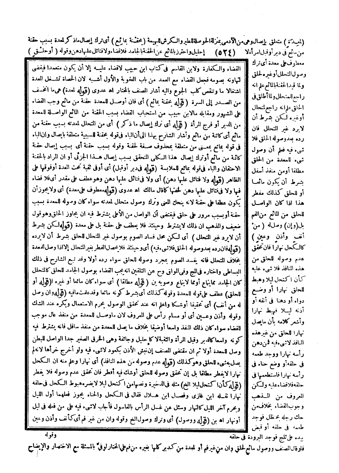 (لِمَعِدَةٍ) مُتَعَلِّقٌ بِإِيصَالٍ، وَهِيَ مِنْ الْآدَمِيِّ بِمَنْزِلَةِ الْحَوْصَلَةِ لِلطَّيْرِ وَالْكِرْشِ لِلْبَهِيمَةِ (بِحُقْنَةٍ بِمَائِعٍ) أَيْ تَرْكِ إيصَالِ مَا ذَكَرَ لِمَعِدَةٍ بِسَبَبِ حُقْنَةٍ مِنْ مَائِعٍ فِي دُبُرِ أَوْ قُبُلِ امْرَأَةٍ لَا إحْلِيلٍ وَاحْتُرِزَ بِالْمَائِعِ عَنْ الْحُقْنَةِ بِالْجَامِدِ فَلَا قَضَاءَ وَلَا فَتَائِلَ عَلَيْهَا دُهْنٌ وَقَوْلُهُ (أَوْ حَلْقٍ) مَعْطُوفٌ عَلَى مَعِدَةٍ أَيْ تَرْكِ وُصُولِ الْمُتَحَلِّلِ أَوْ غَيْرِهِ لِحَلْقٍ وَلَمَّا قَيَّدَ الْحُقْنَةَ بِالْمَائِعِ عُلِمَ أَنَّهُ رَاجِعٌ لِلْمُتَحَلِّلِ وَلَمَّا أَطْلَقَ فِي الْحَلْقِ عُلِمَ أَنَّهُ رَاجِعٌ لِمُتَحَلِّلٍ أَوْ غَيْرِهِ لَكِنْ بِشَرْطِ أَنْ لَا يَرُدَّ غَيْرَ الْمُتَحَلِّلِ فَإِنْ رَدَّهُ بَعْدَ وُصُولِهِ الْحَلْقَ فَلَا شَيْءَ فِيهِ فَعُلِمَ أَنَّ وُصُولَ شَيْءٍ لِلْمَعِدَةِ مِنْ الْحَلْقِ مُطْلَقًا أَوْ مِنْ مَنْفَذٍ أَسْفَلَ بِشَرْطِ أَنْ يَكُونَ مَائِعًا أَوْ لِلْحَلْقِ كَذَلِكَ مُفْطِرٌ هَذَا إذَا كَانَ الْوَاصِلُ لِلْحَلْقِ مِنْ الْمَائِعِ مِنْ الْفَمِ بَلْ (وَإِنْ) وَصَلَ لَهُ (مِنْ أَنْفٍ وَأُذُنٍ وَعَيْنٍ) كَالْكُحْلِ نَهَارًا فَإِنْ تَحَقَّقَ عَدَمُ وُصُولِهِ لِلْحَلْقِ مِنْ هَذِهِ الْمَنَافِذِ فَلَا شَيْءَ عَلَيْهِ كَأَنْ اكْتَحَلَ لَيْلًا وَهَبَطَ لِلْحَلْقِ نَهَارًا أَوْ وَضَعَ دَوَاءً أَوْ دُهْنًا فِي أَنْفِهِ أَوْ أُذُنِهِ لَيْلًا فَهَبَطَ نَهَارًا وَأَشْعَرَ كَلَامُهُ بِأَنَّ مَا يَصِلُ نَهَارًا لِلْحَلْقِ مِنْ غَيْرِ هَذِهِ الْمَنَافِذِ لَا شَيْءَ فِيهِ فَمَنْ دَهَنَ رَأْسَهُ نَهَارًا وَوَجَدَ طَعْمَهُ فِي حَلْقِهِ أَوْ وَضَعَ حِنَّاءَ فِي رَأْسِهِ نَهَارًا فَاسْتَطْعَمَهَا فِي حَلْقِهِ فَلَا قَضَاءَ عَلَيْهِ وَلَكِنَّ الْمَعْرُوفَ مِنْ الْمَذْهَبِ وُجُوبُ الْقَضَاءِ بِخِلَافِ مَنْ حَكَّ رِجْلَهُ بِحَنْظَلٍ فَوَجَدَ طَعْمَهُ فِي حَلْقِهِ أَوْ قَبَضَ بِيَدِهِ عَلَى ثَلْجٍ فَوَجَدَ الْبُرُودَةَ فِي حَلْقِهِ فَلَوْ قَالَ الْمُصَنِّفُ وَوُصُولُ مَائِعٍ لِحَلْقٍ، وَإِنْ مِنْ غَيْرِ فَمٍ أَوْ لِمَعِدَةٍ مِنْ كَدُبُرِ كُلِّهَا بِغَيْرِهِ مِنْ فَمٍ عَلَى الْمُخْتَارِ لَوَفَّى بِالْمَسْأَلَةِ مَعَ الِاخْتِصَارِ وَالْإِيضَاحِ